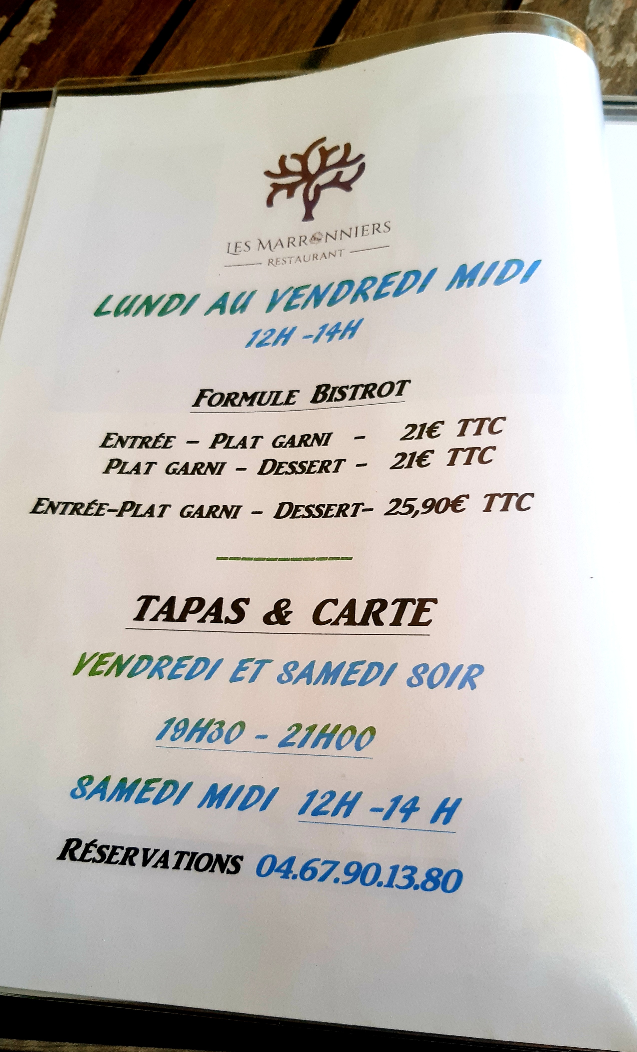 Nous sommes venus plusieurs fois et là, en baladant, nous décidons d aller manger aux Marronniers ce midi (nous habitons pezenas) Le couplé de serveur est toujours aussi sympa, le cadre est chaleureux et le repas.... Délicieux. Menu complet aux environ de 27 euros, gourmand, avec certains produits qu on trouve rarement comme de délicieux rognons, de l andouillette en gratin. Bref, un régal et une digestion... Parfaite. C était un très bon moment, une fois de plus.