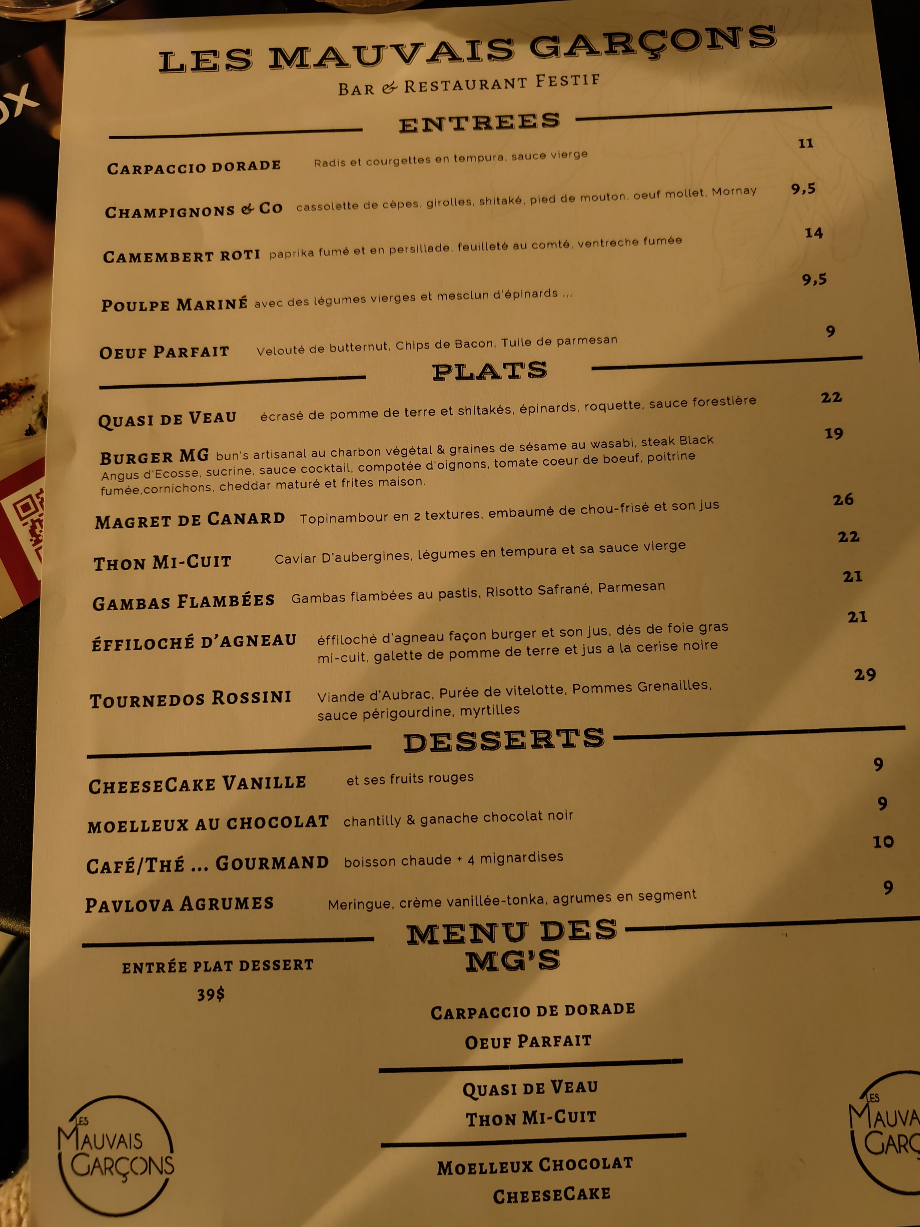 Endroit sympathique et chaleureux. L accueil est enthousiaste et le cadre tres agréable. Les plats sont succulents et parfaitement maîtrisés... les mauvais garçons font partis de ces restaurants courageux qui ont opté pour une carte réduite mais quel régal pour les papilles. Ils privilégient la qualité et ils ont bien raison... les cuissons sont parfaites et les accords de saveurs au top. En plus c est assez copieux que demander de plus 😀. Les desserts sont originaux, avec une présentation simple mais quelle explosion en bouche! Nous avons passé une tres agréable soirée. Un seul petit bémol c est l ambiance musicale un peu forte et agressive en rupture totale avec la finesse des mets et du cadre. Il y a apparemment un piano a l étage et a entendre les qq notes qui dont descendues furtivement qq un qui se debrouille pas trop mal.