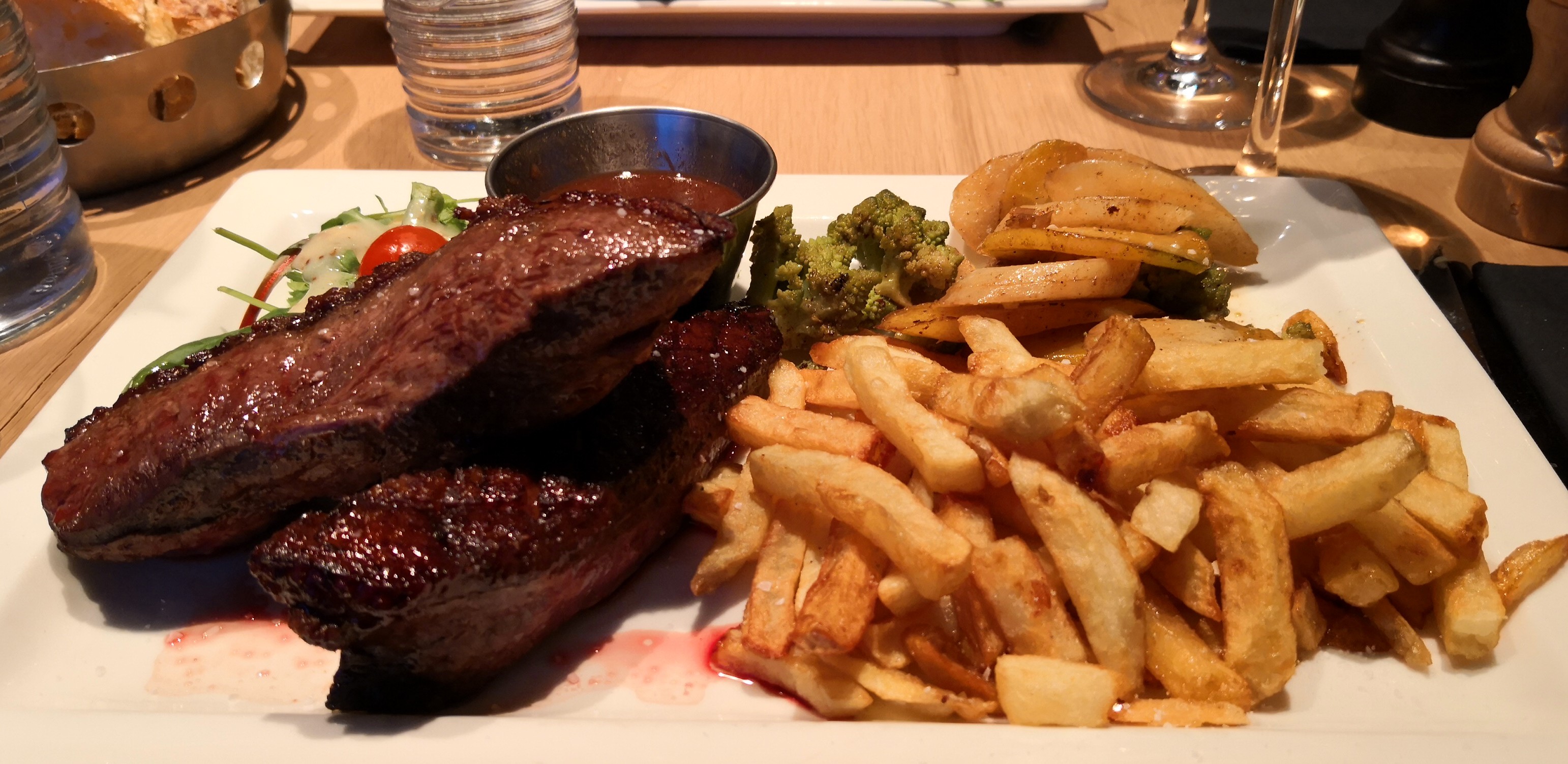 Entrée plutot bonne mais la viande est très mal cuite et quand on annoce un onglet de 250g et qu'on se retrouve avec une allumette dans l'assiette c'est loin d'être correcte...je ne recommande pas