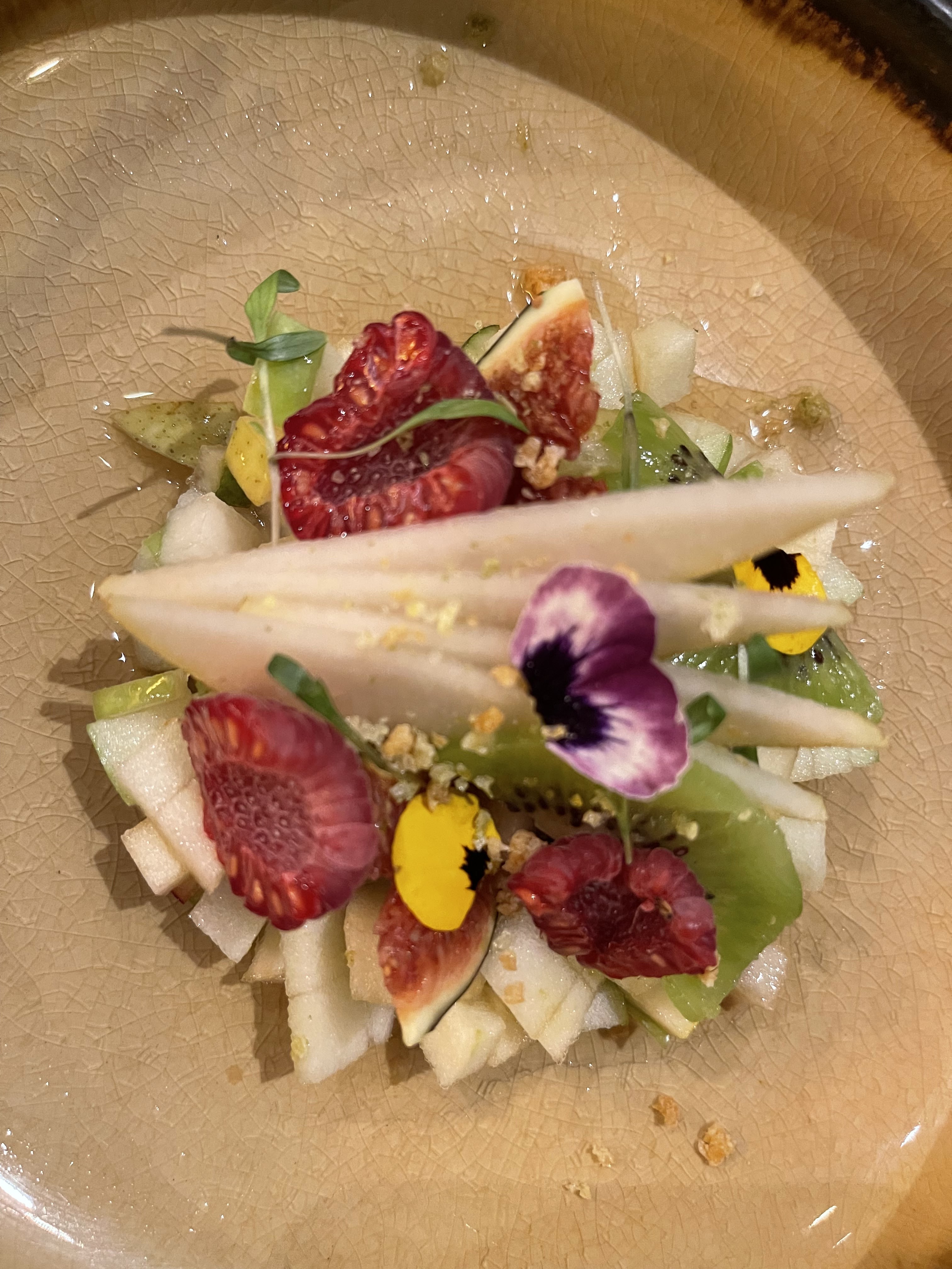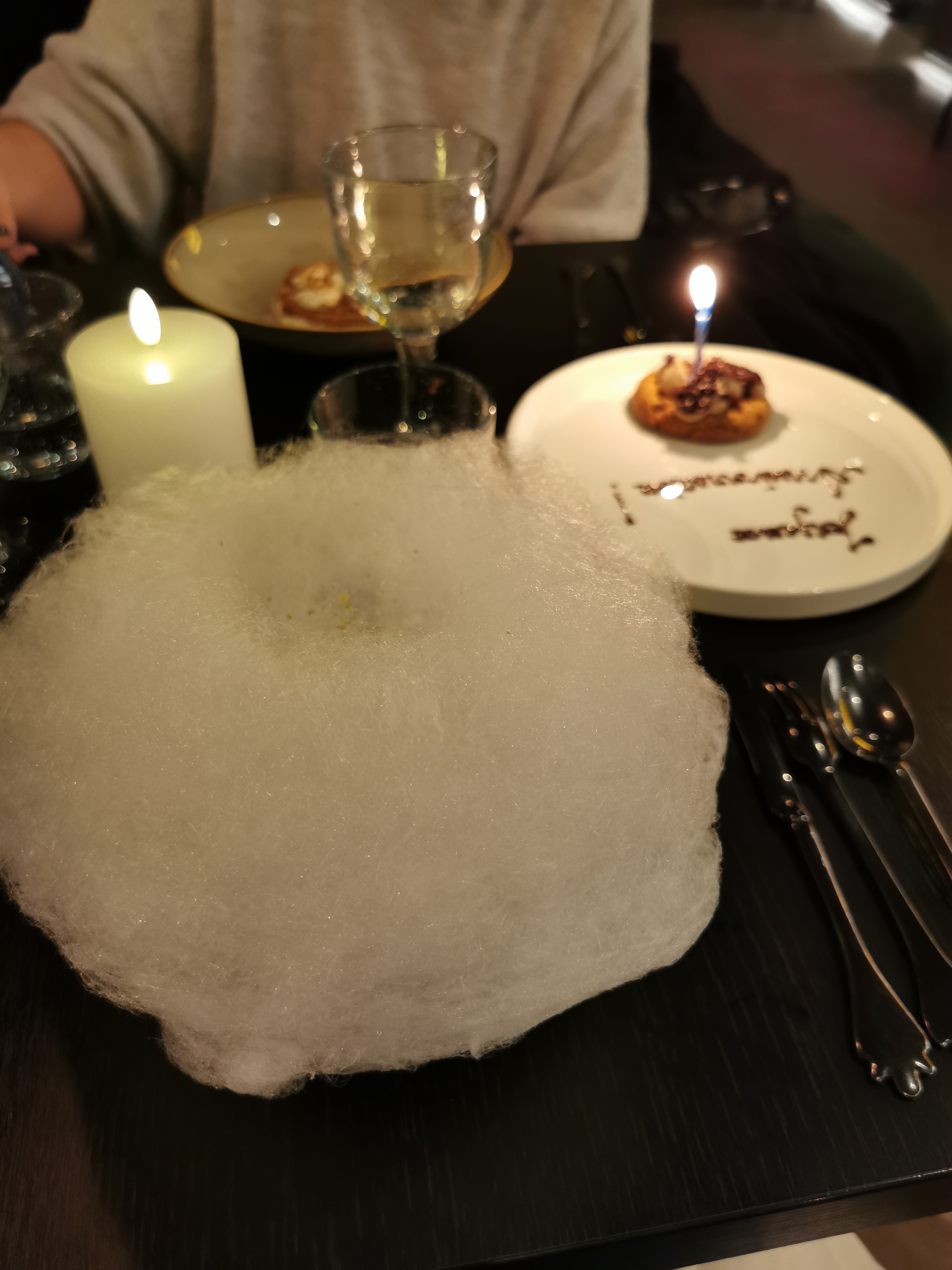 Nous avons été déçues de l'entrée au dessert. Le risotto avait des grains de riz encore croquants, la terrine de poisson était fade sans saveur particulière et les desserts; la pomme au four avait la peau limite brûlée, elle était tiède à l'extérieur et froide a l'intérieur, la crème au sésame noir avait un goût de brûlé. Il n'y avait que le sablé et le sorbet au cidre qui était bons. Concernant la rhubarbapapa il était trop acide même en mangeant la barbe à papa en même temps. Les assiettes étaient très jolies, la présentation y est mais dommage que le goût n'y soit pas.