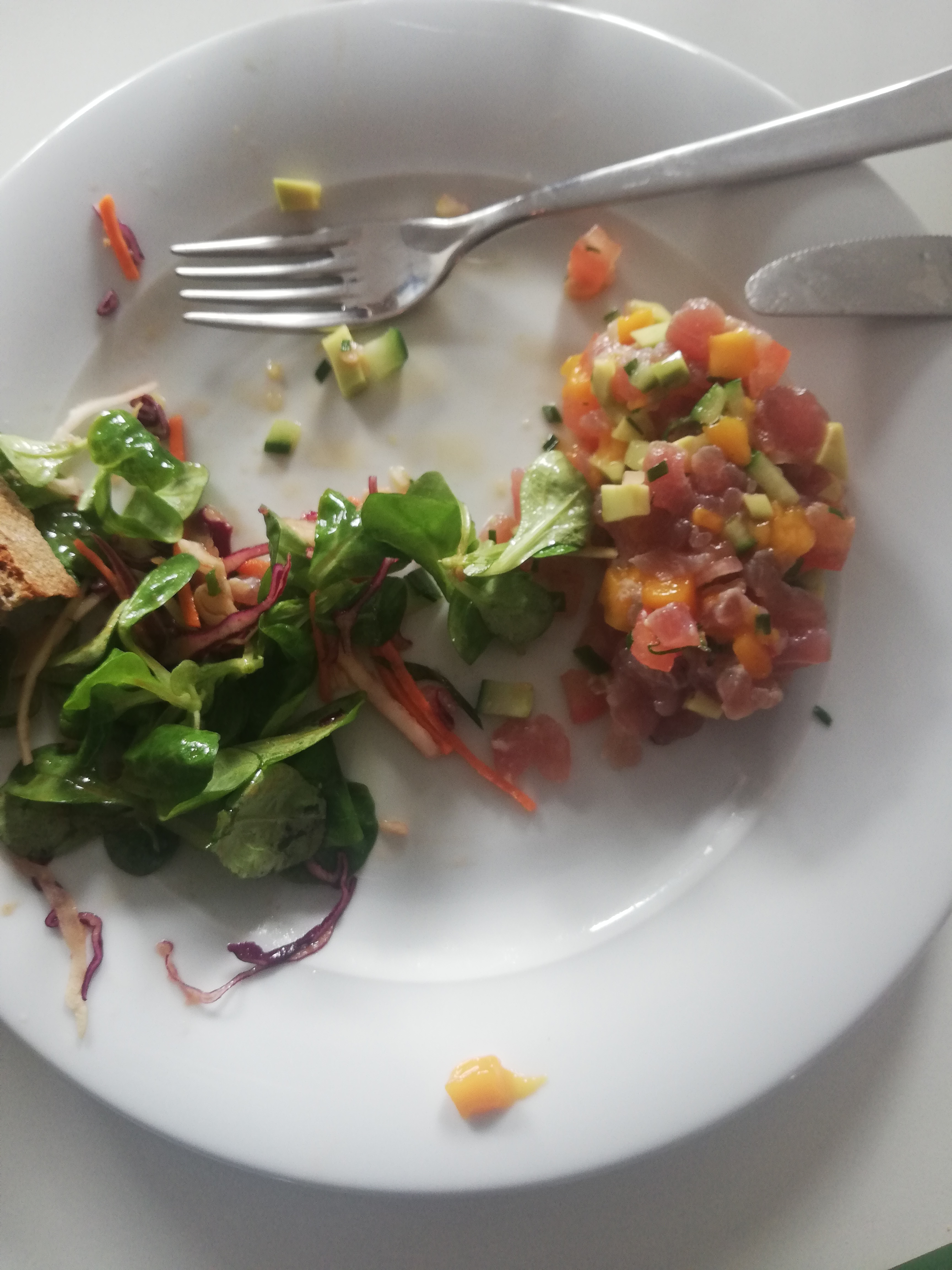 Accueil très agréable. Thon mi cuit moyen. Bien servi en quantité mais sauce faite avec trop de sauce soja.c était trop salé, et manque de saveur Dessert sans intérêt