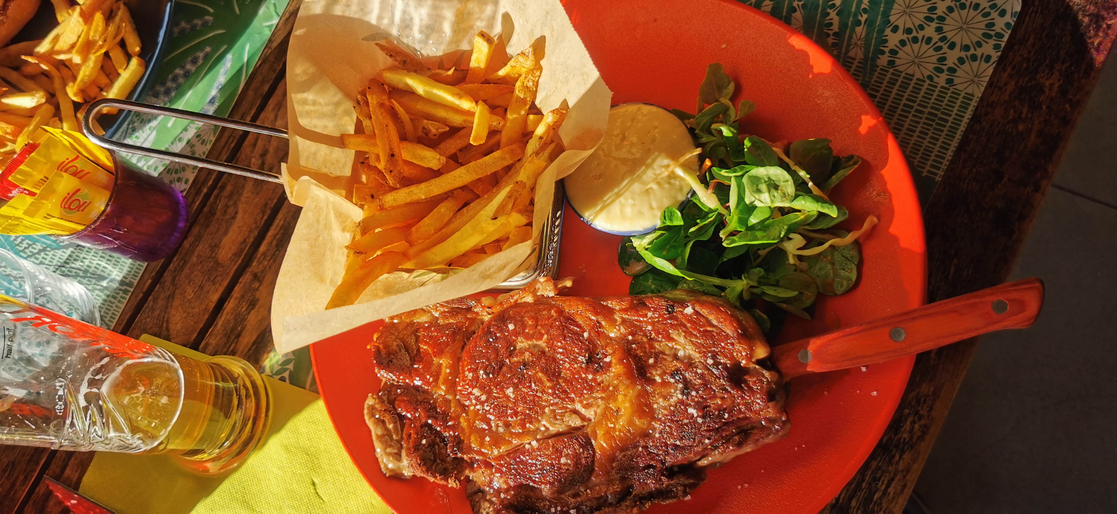 Repéré sur Google, on déguste une cuisine fait maison et ça se sent. Magret de canard avec patate douce, carotte et frites maison et cabillaud avec riz au lait de coco. Excellent