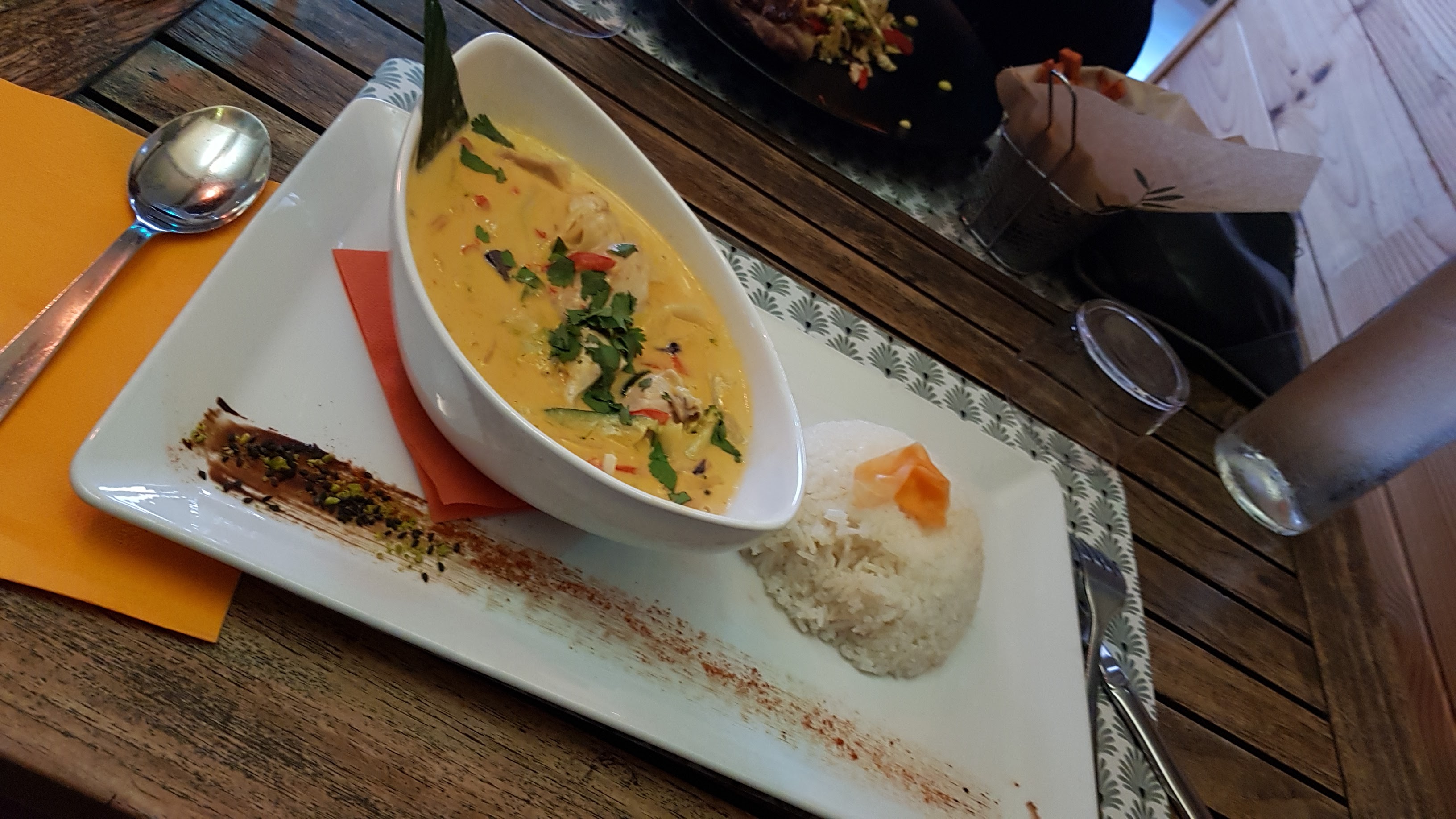Restau très chaleureux ! Excellent accueil , avec un personnel souriant, à l'écoute ! Les plats sont exquis ! On nous fait voyager avec une touche de créativité. Le thaï curry rouge au poulet est à tomber par terre et que dire du café gourmand !! Crème catalane parfumée aux amandes Tiramisu aux fruits rouges Tout est bon ! Allez y les yeux fermés ! Restaurante muy simpático con personal muy atento y agradable. Los platos son riquísimos! El thaï curry con pollo está buenísimo. Puede ir sin dudar !!