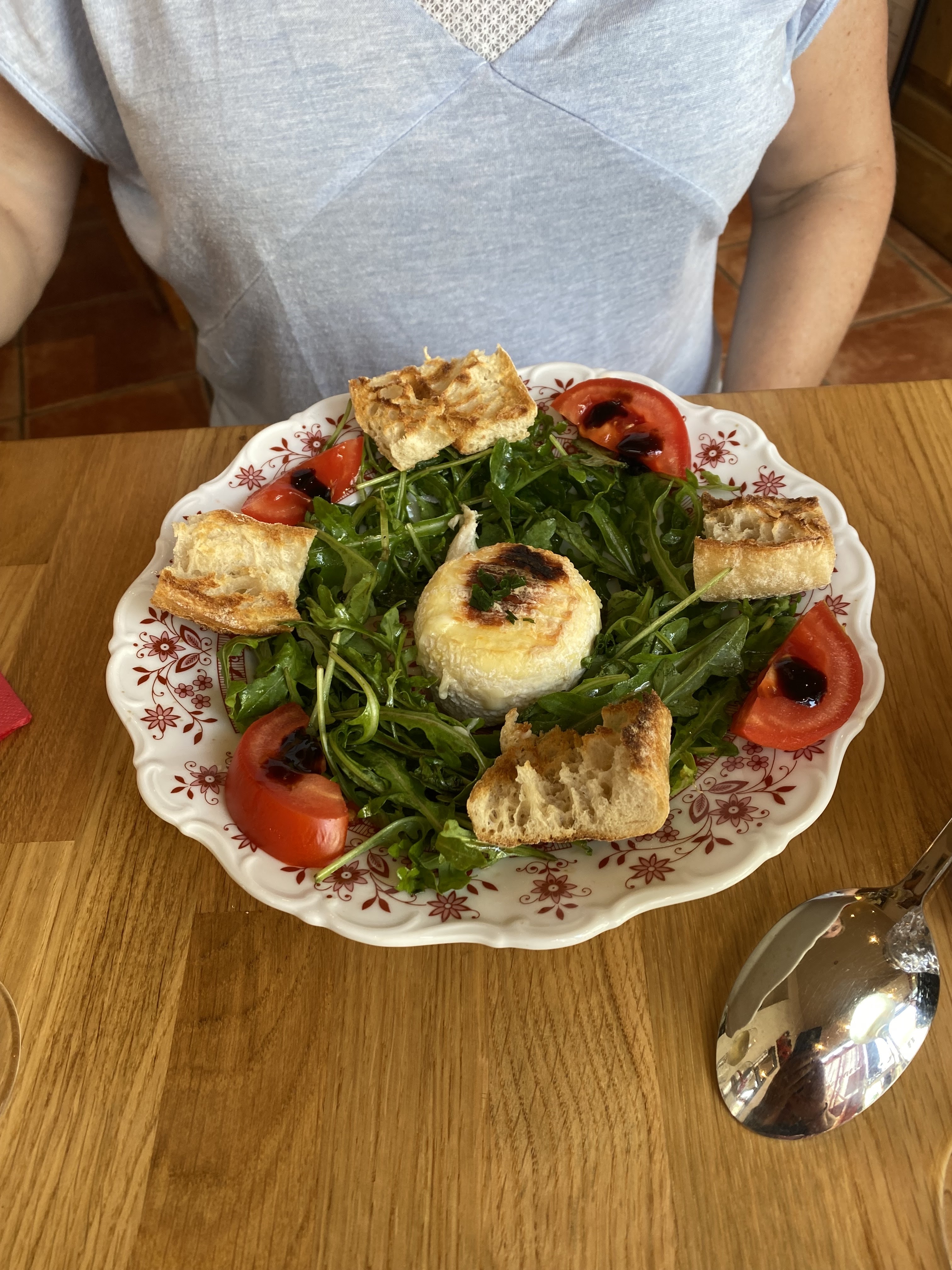 Ambiance agréable, personnel sympa, nourriture savoureuse. Crème de courgettes au basilic & crottin fermer et salade Vert.