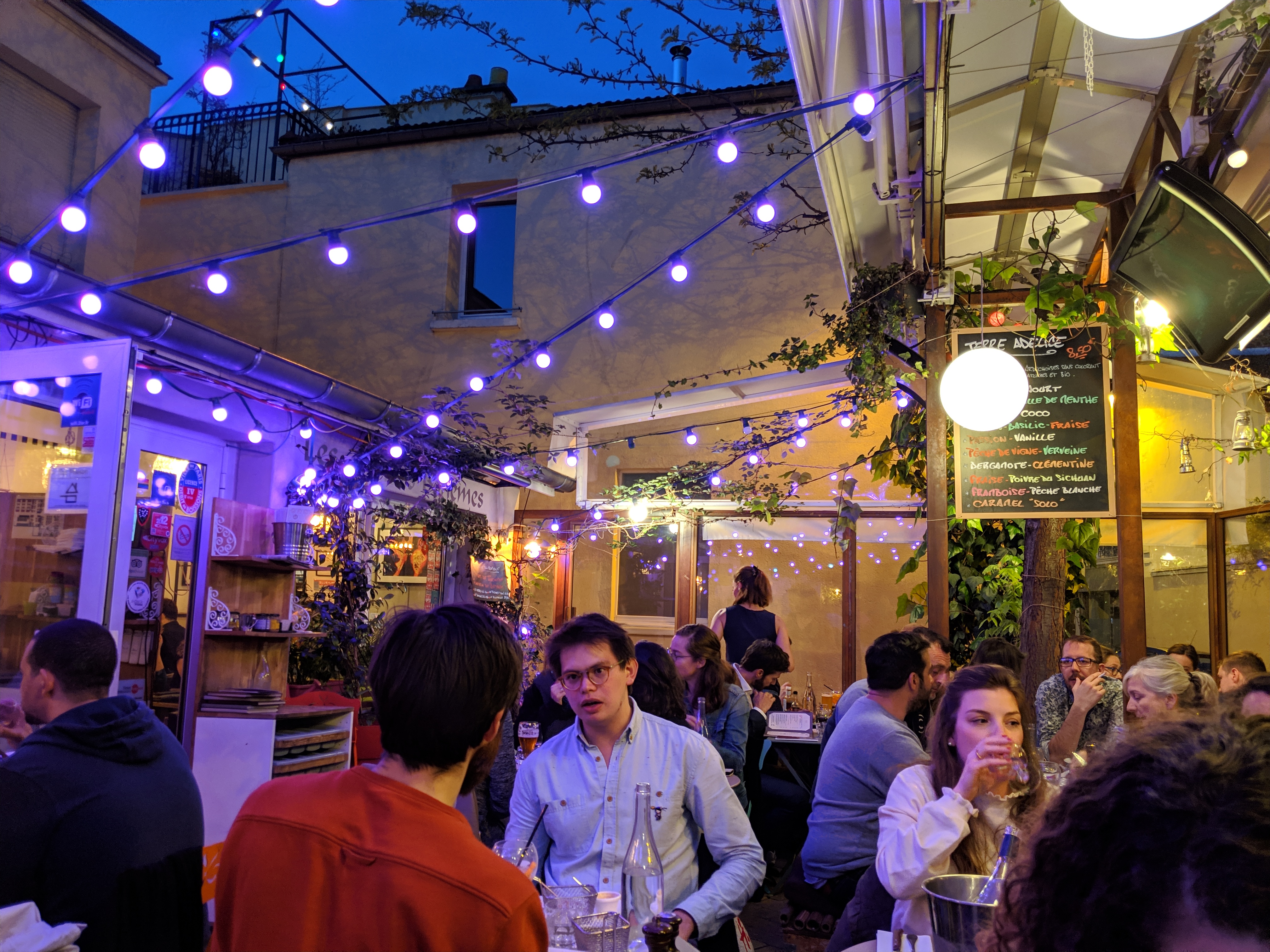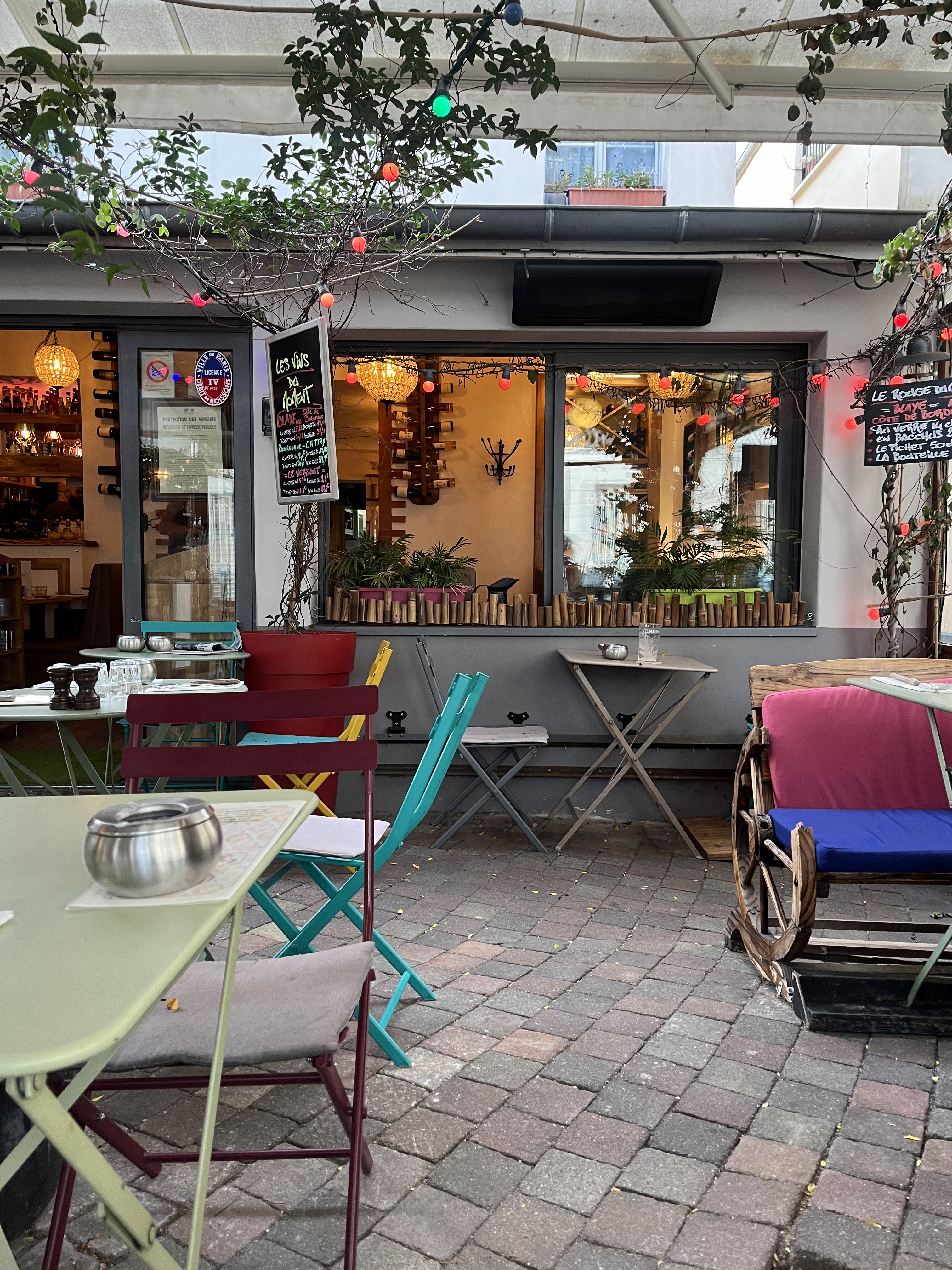 Une terrasse avec des guirlandes lumineuses qui donne une ambiance villageoise en plein Paris et une cuisine bien correcte...
