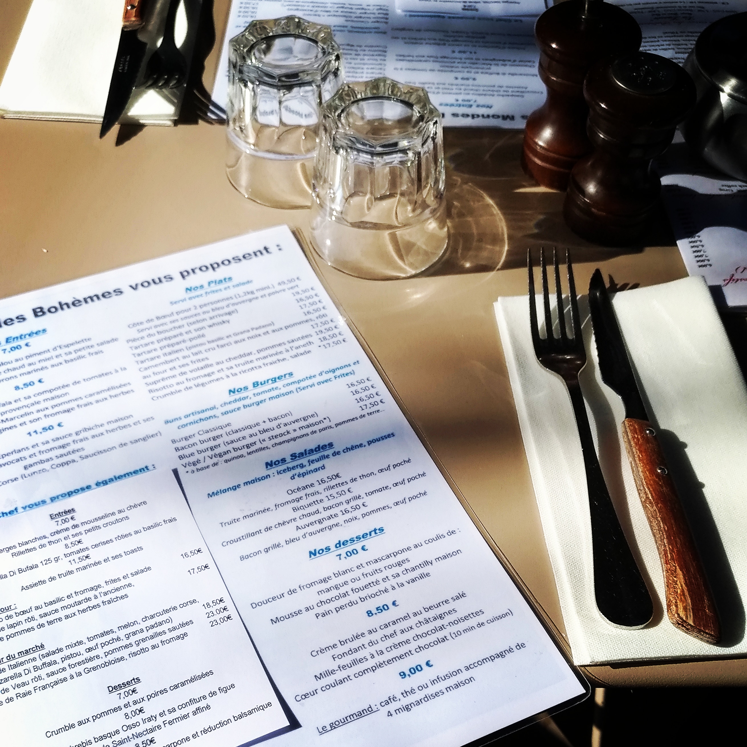 Terrasse très agréable, en bord d'une rue calme. Le personnel est vraiment sympa et très pro (pas bohème du tout :-) : ils m'ont légitimement viré de la terrasse, la moitié des amis ayant plus d'une heure de retard sur notre table de 8. Les plats n'ont rien de bohème non plus, c'est le genre de trucs un peu industriels qu'on sert dans les restaus à touristes face au Louvre ou à Montmartre. Moi j'ai eu une cuisse de poulet (pas du genre label rouge, ni bio) avec frites / salade (pour 16/18€ je sais plus).