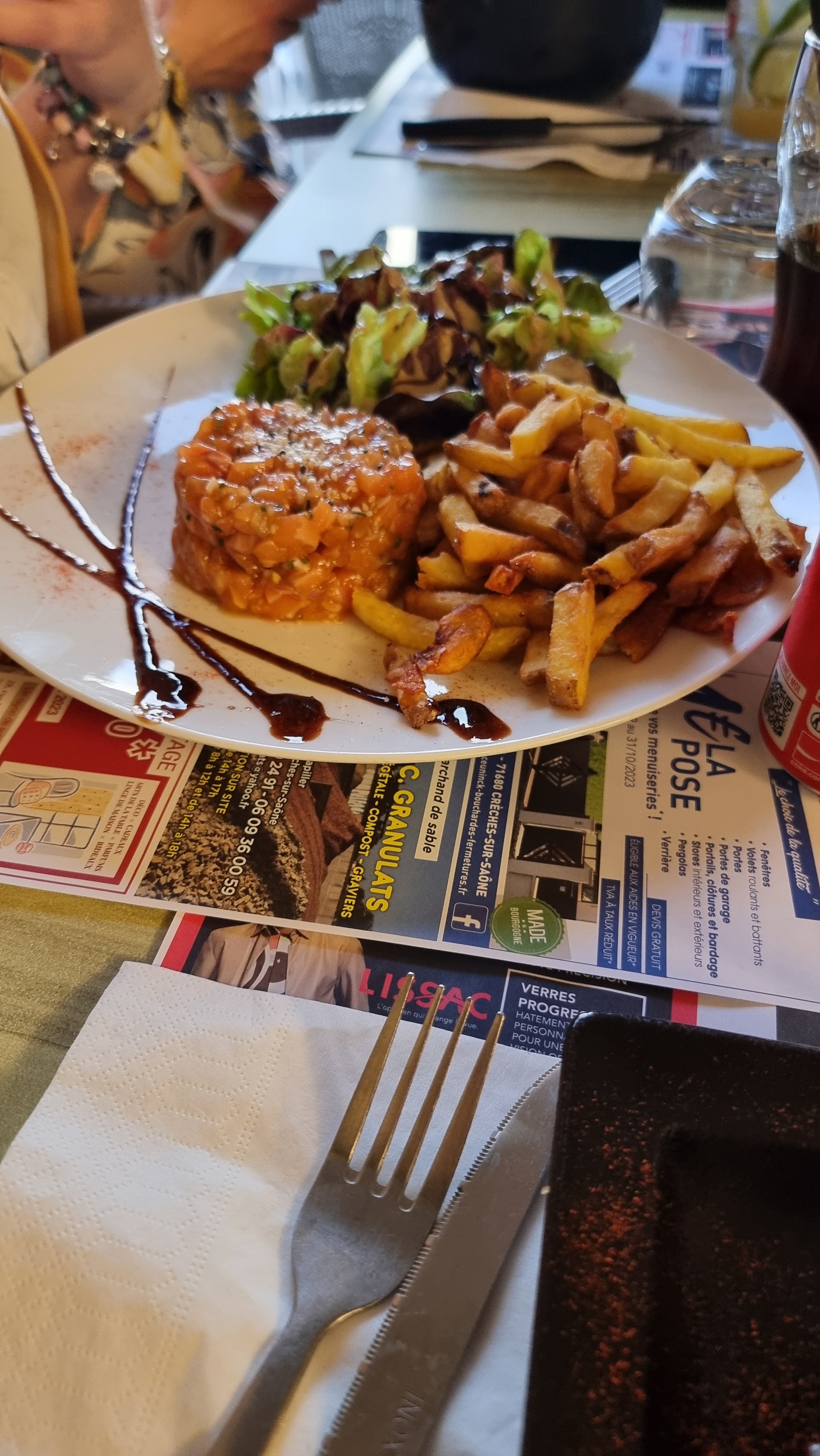 Le restaurant, très bien, bon tartare de saumon , salade verte et frites maison, bonne brioche perdue avec sa boule de glace . Avons mangé sous la pergola , malheureusement à côté d une grande table TRES bruyante , voir même très lourde ... 2 des serveurs sont venus s excuser auprès de nous du désagrément. Une autre grande tablée présente qu on n a pas entendu . Nous reviendrons au resto , qui mérite vraiment le détour.