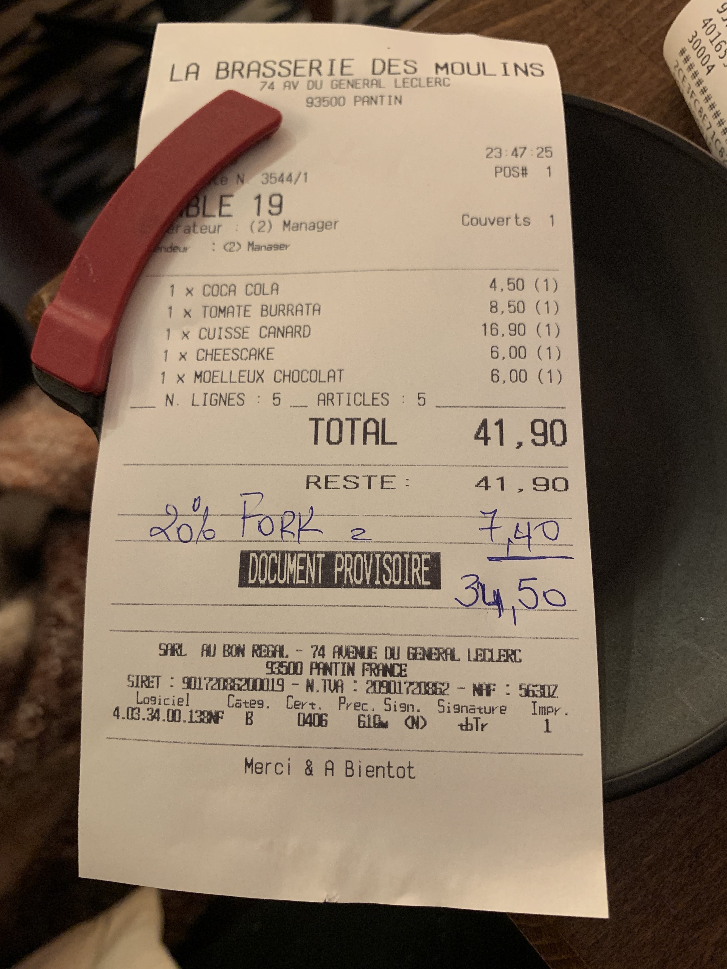 Um bom restaurante na cidade de Pantim, localizada na periferia nordeste de Paris. Nos deu a impressão de ser frequentado pelos locais, que trabalham no entorno. O ambiente é simples e a comida tem bom custo-benefício. Como entrada, pedi Arenque e como principal Bavette (Um bife) et Harricots(Um tipo de vagem). Eles trabalham com o menu do dia, que dá opções de entrada +principal ou principal+sobremesa. Também tem à la carte.
