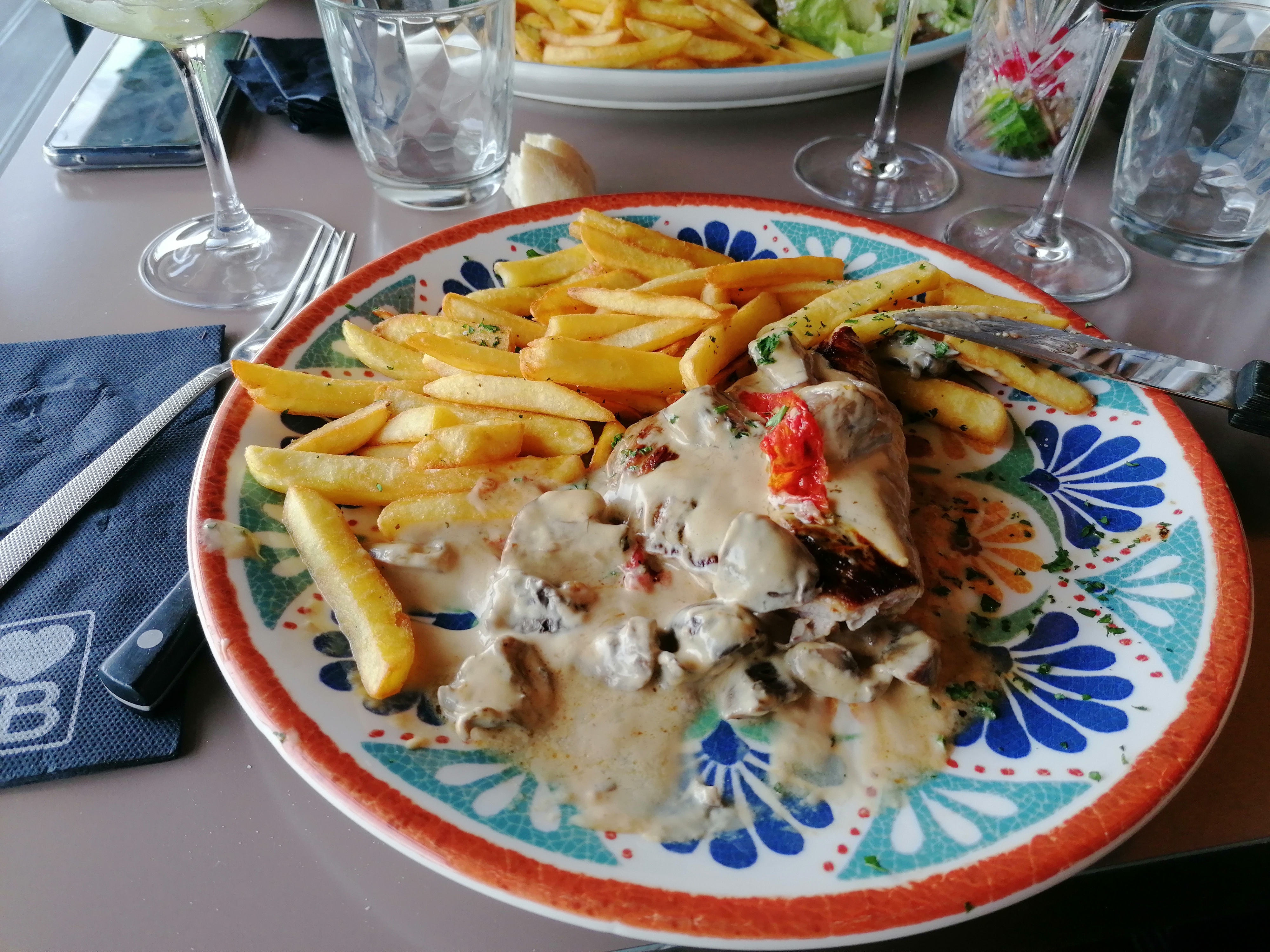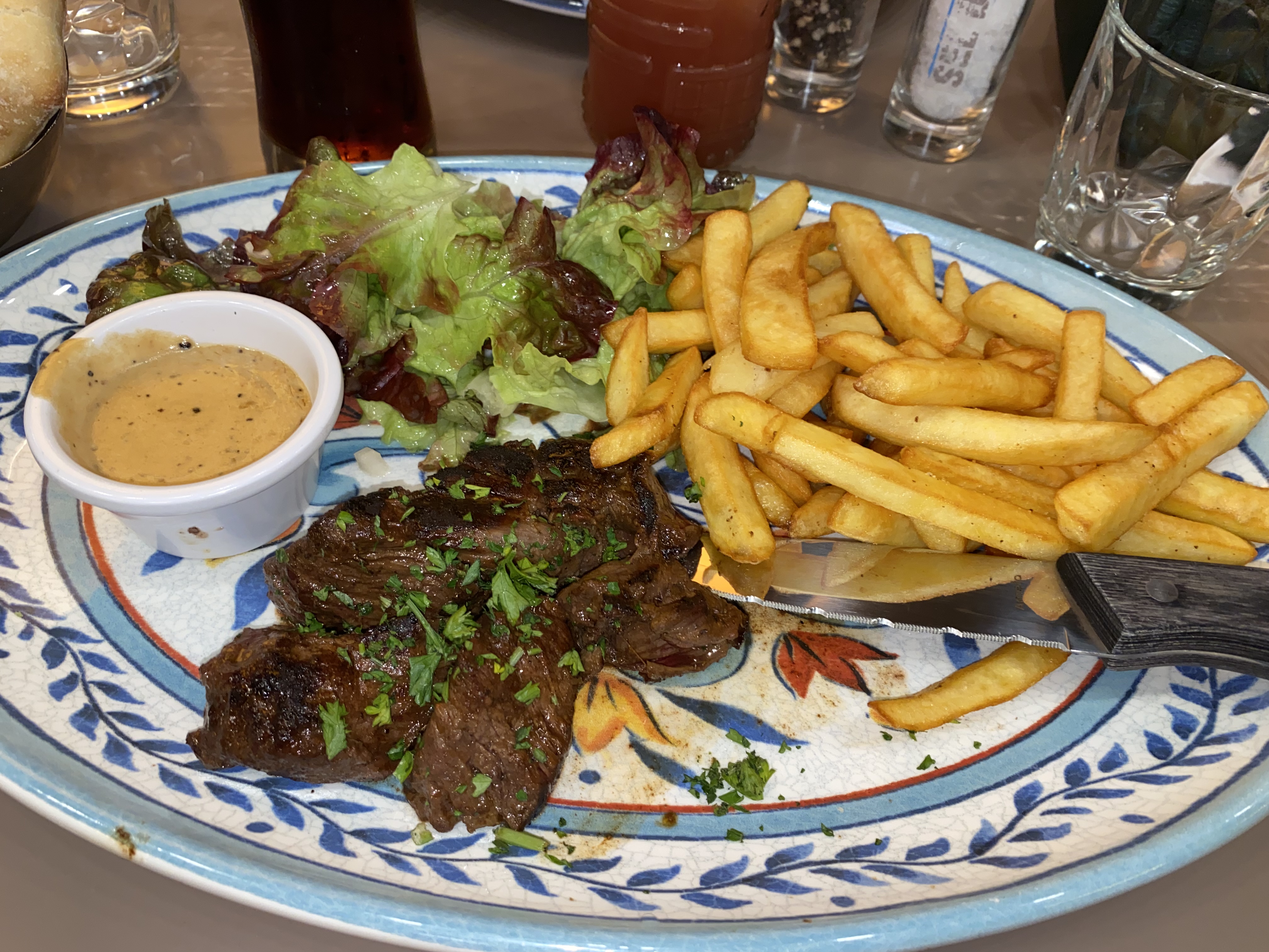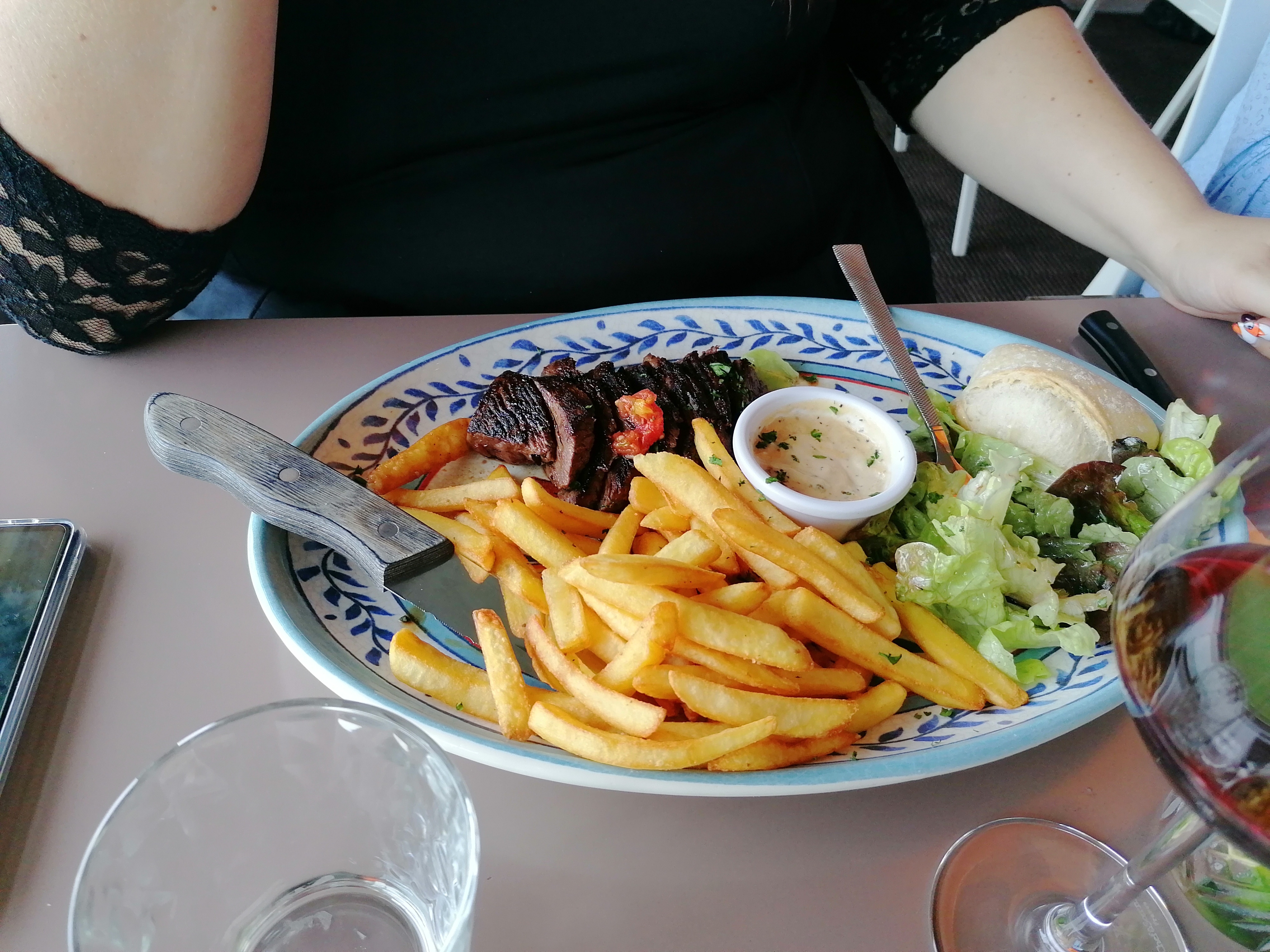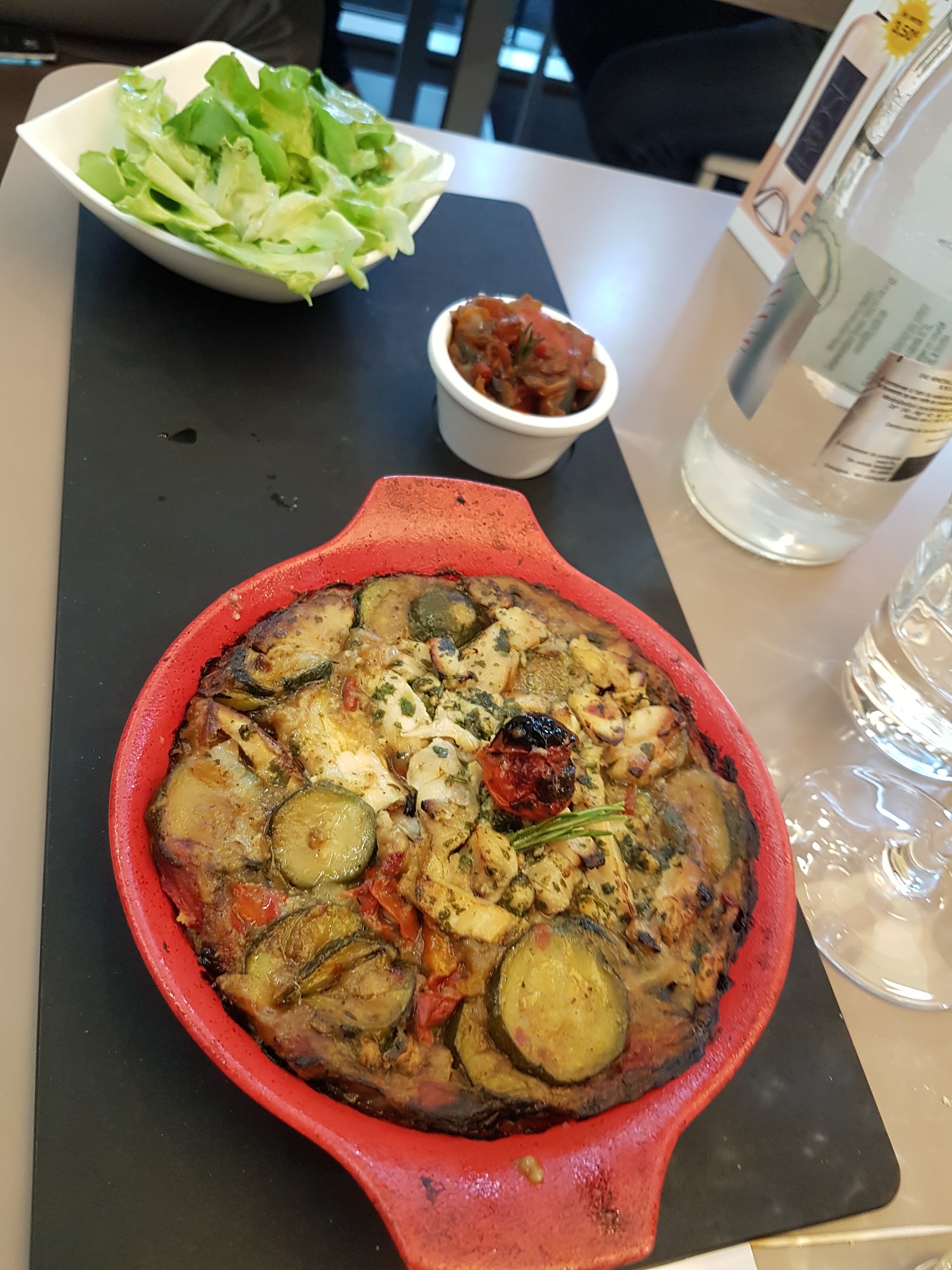 Les plats sont arrivés avant la fin de l’apéro, les frites n’étaient pas assez cuites donc pas croustillantes, on a demandé du pain on ne l’a jamais vu, on ne nous a pas proposé à boire pour le repas… Sinon tout va bien!