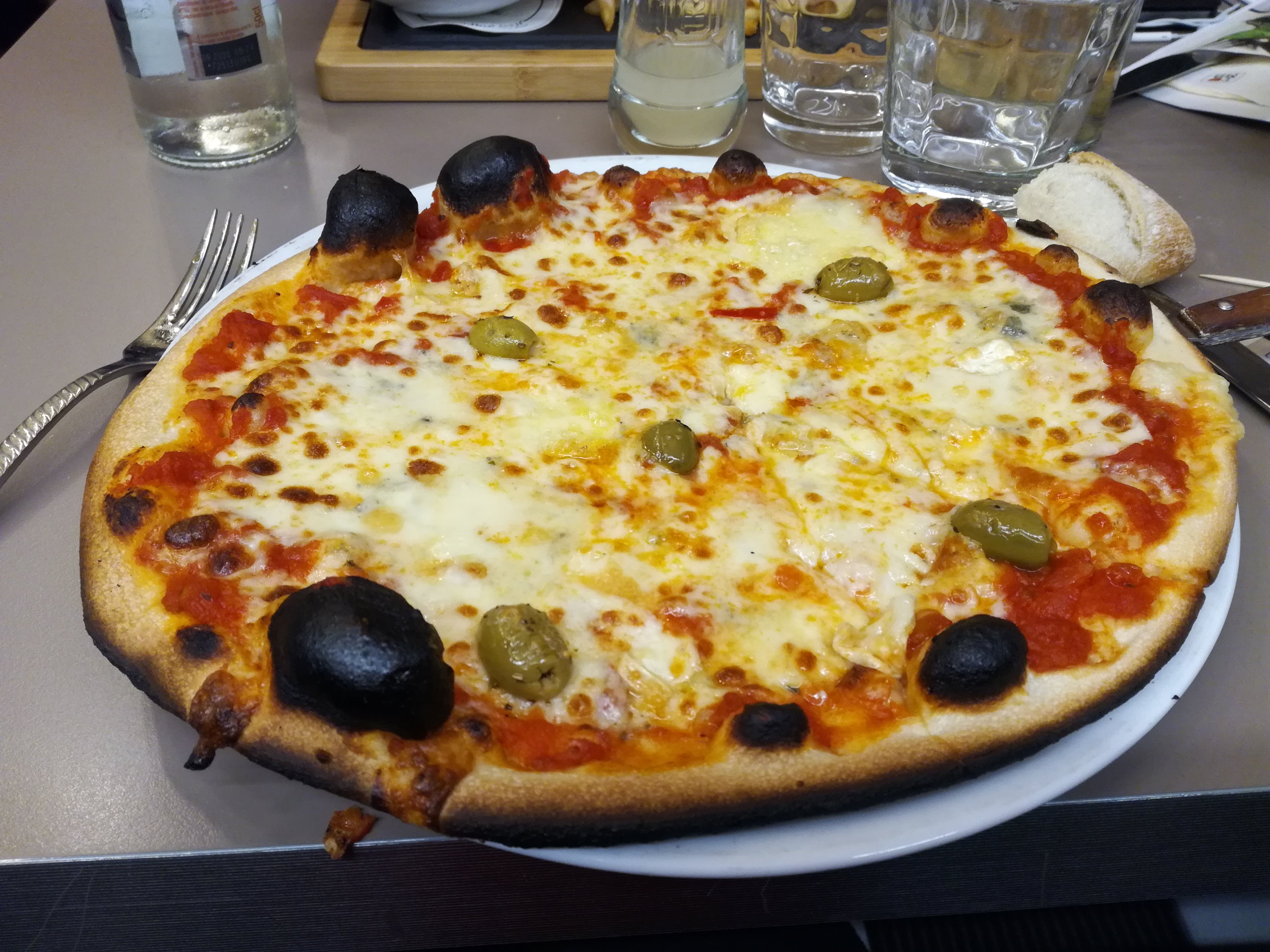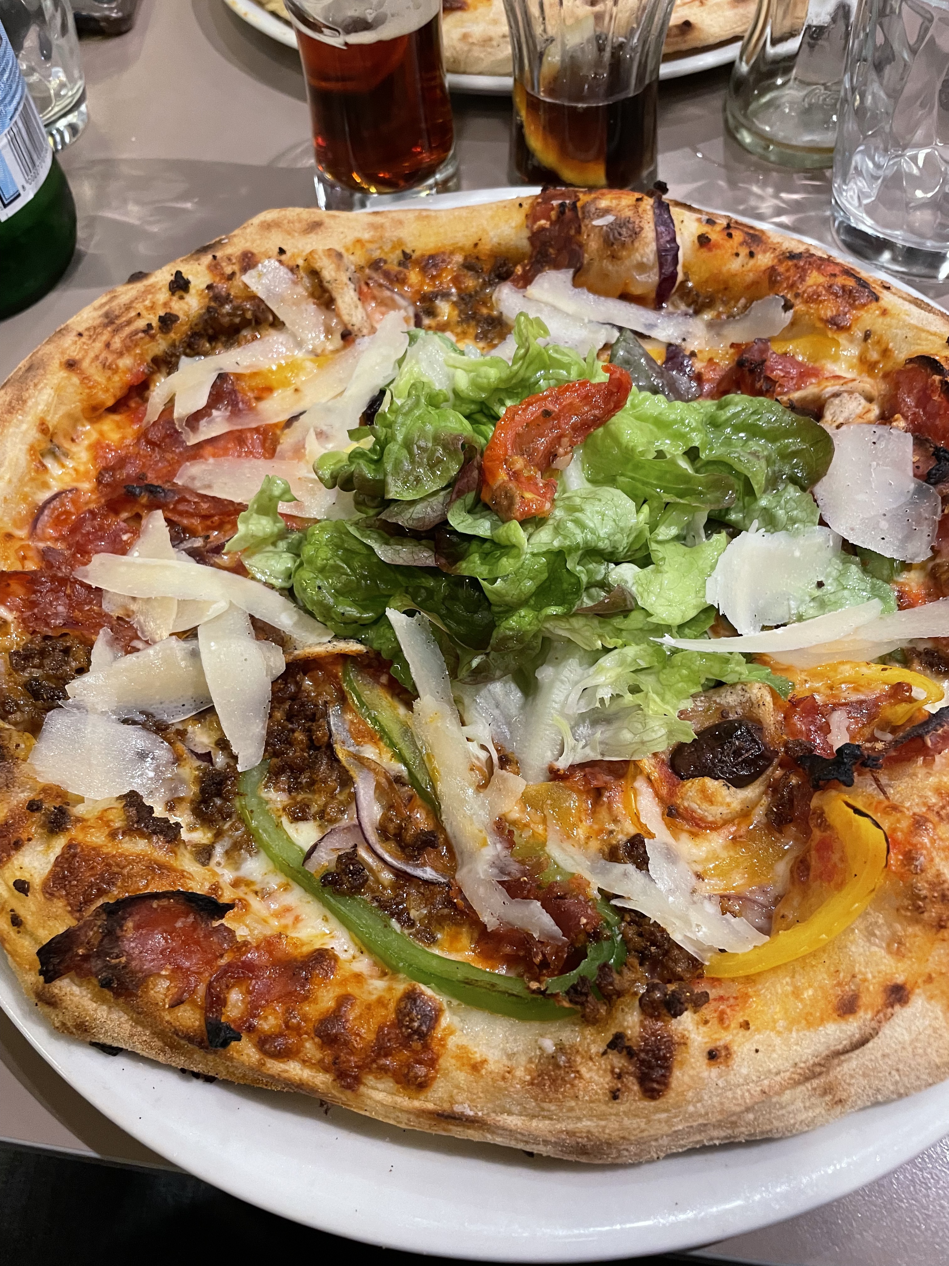 Les pizzas sont très bonnes. J’ai pris une végétarienne il y a un problème sur toutes les pizzas. Il y a un énorme trottoir un peu bourratif. Je n’ai jamais vu ça ailleurs dans d’autres pizzeria.