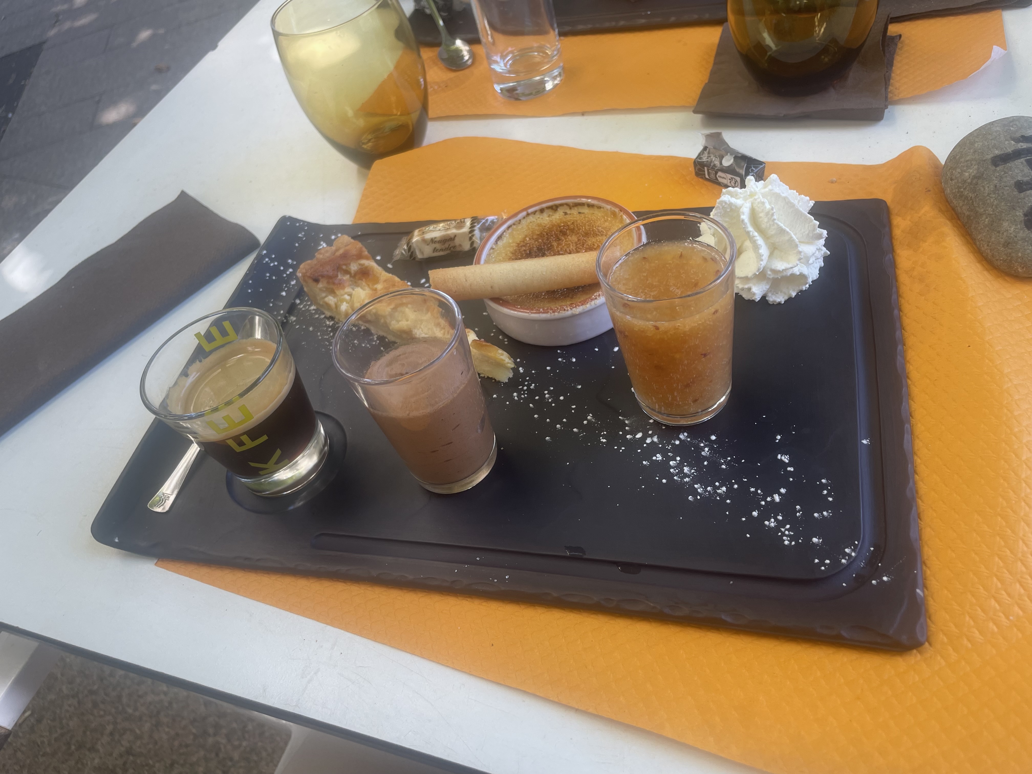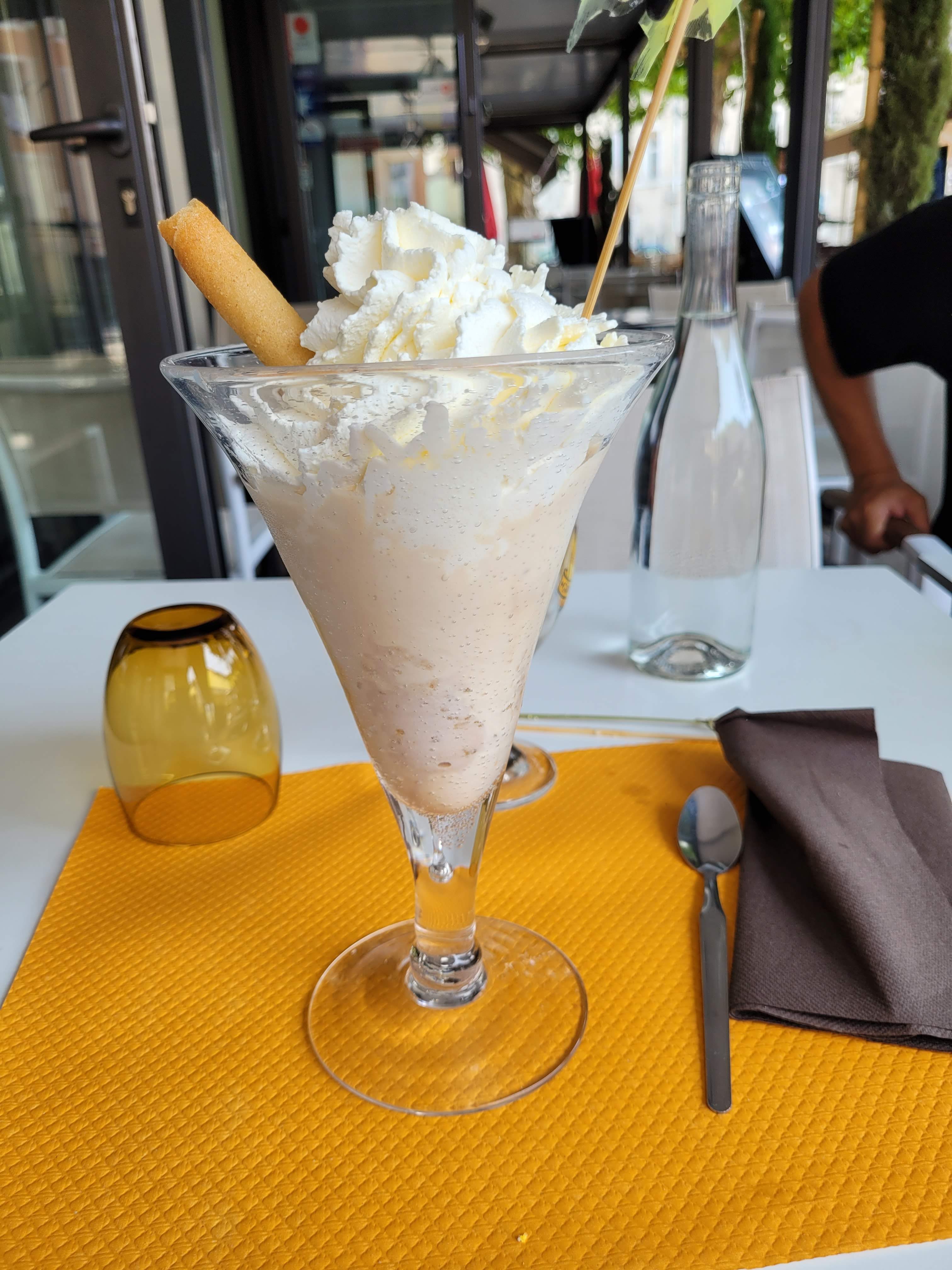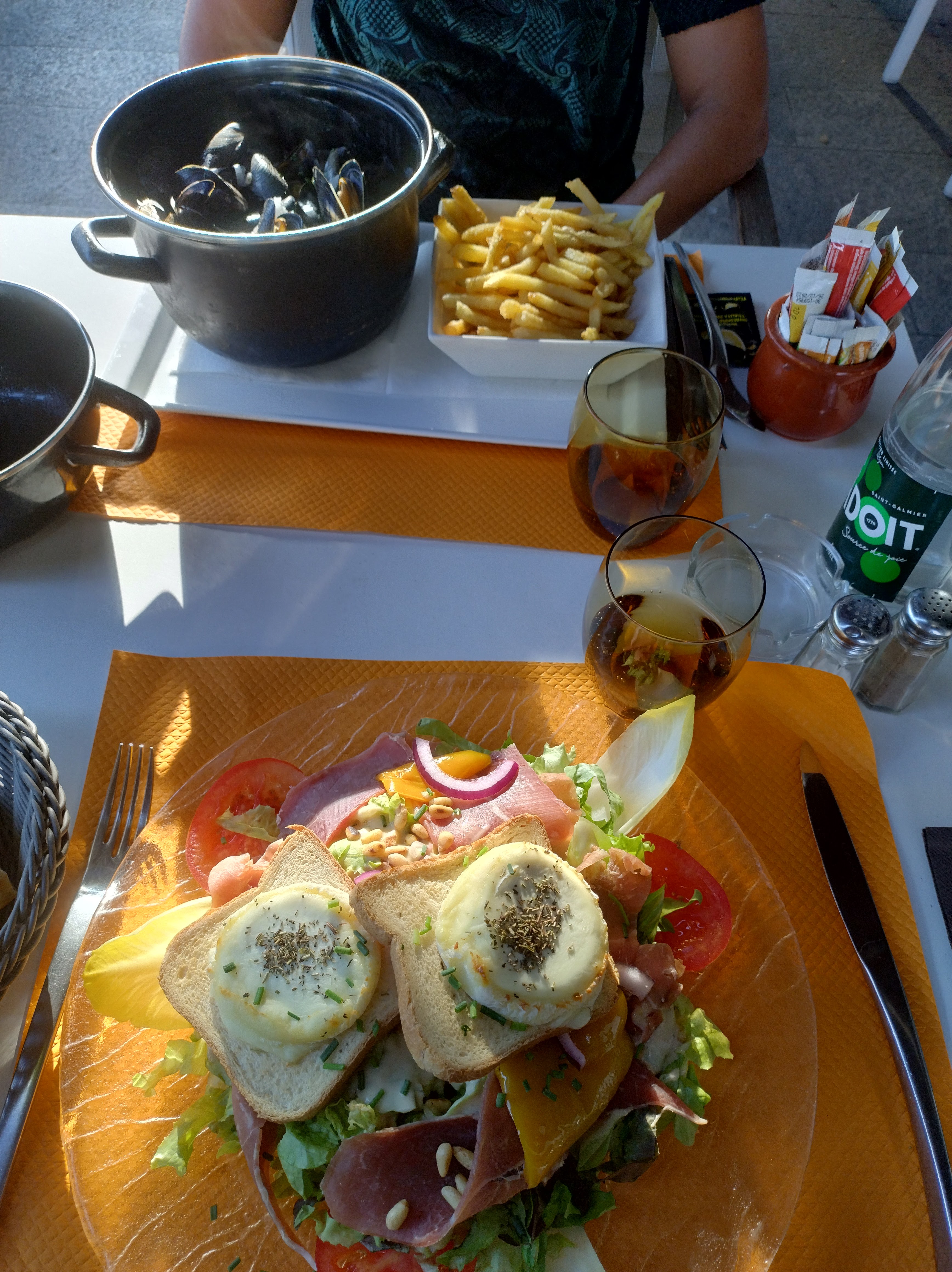 Nous avons manger en terrasse c'est extrêmement bruyant avec la circulation l'accueil est très froid nous avions pris de simple moules-frites les moules étaient pas cuites en dessert des coupes glacées sans aucune présentation dommage