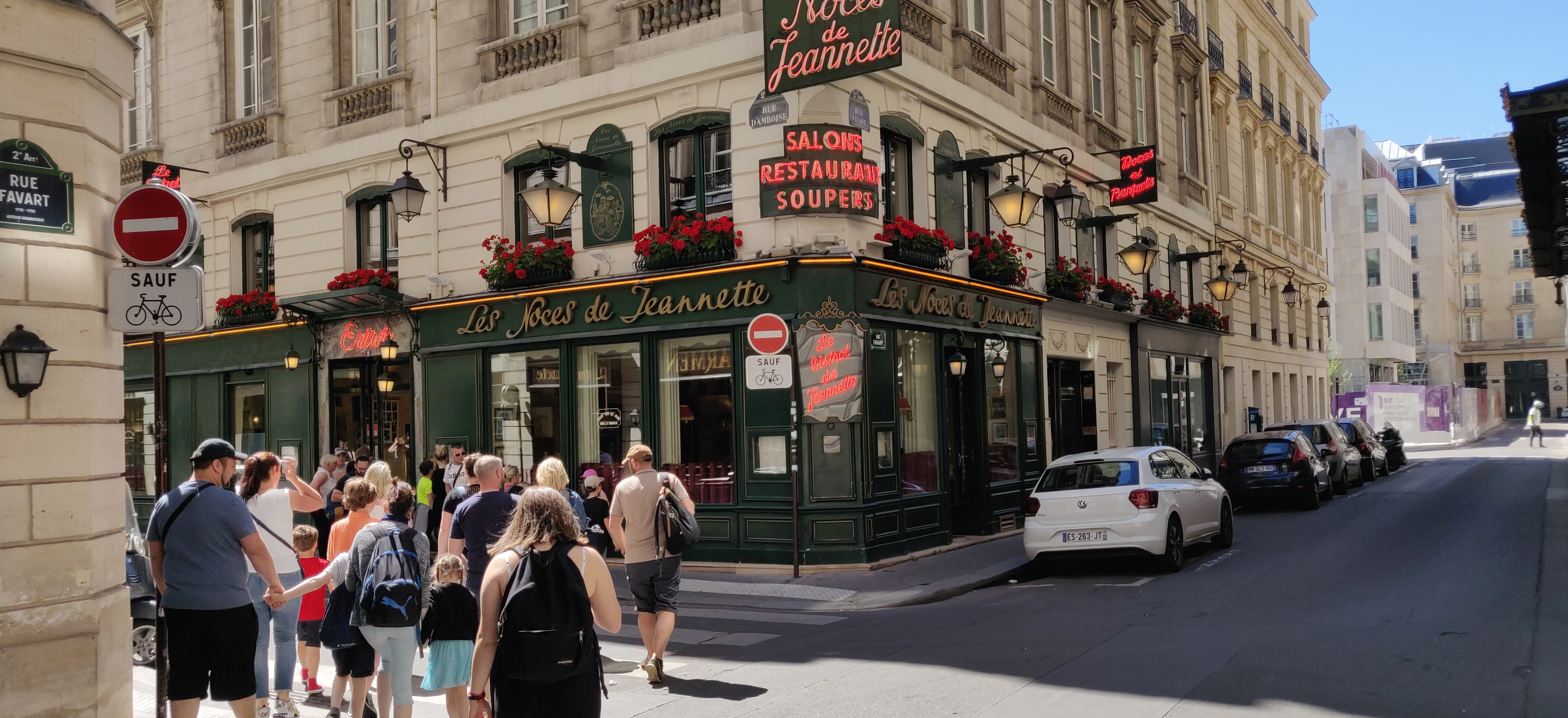 Dans le IIème arrondissement, en face de l’Opéra Comique et à proximité des Grands Boulevards, Les Noces de Jeannette propose une cuisine française traditionnelle de bistrot parisien à base de produits du terroir de qualité. La première enseigne du restaurant au XIXème siècle fut Poccardi. L’établissement prit ensuite le nom « les Noces de Jeannette », opéra comique de Victor Massé qui, créé en 1853, fut joué des centaines de fois de l’autre côté de la rue. L'ambiance bistrot, avec son mobilier en bois, les miroirs, les affiches, crée un environnement convivial. Il y a plusieurs salles et salons d'ambiance différentes.