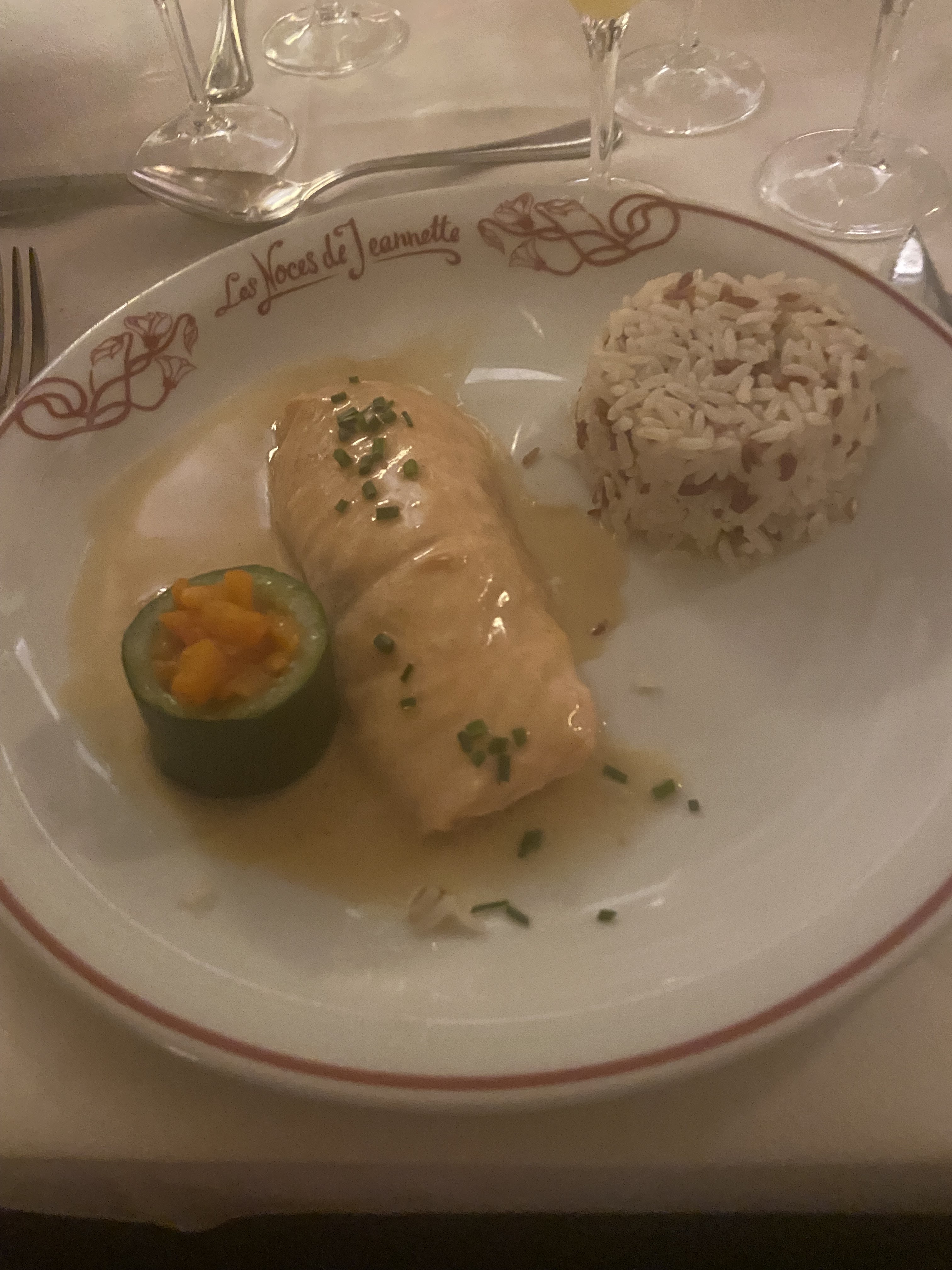 Un portait de Paul Bocuse pour vous accueillir, une loge d’hôtel, y’a t il des chambres à l’étage? Non, on ne badine pas avec les Noces de Jeannette, brasserie traditionnelle parisienne, moins populaire que chic. Les codes ont désormais changé, maintenant les femmes peuvent aussi goûter le vin! Eh oui! Plats honnêtes, desserts originaux avec mention pour le coulis au cassis!