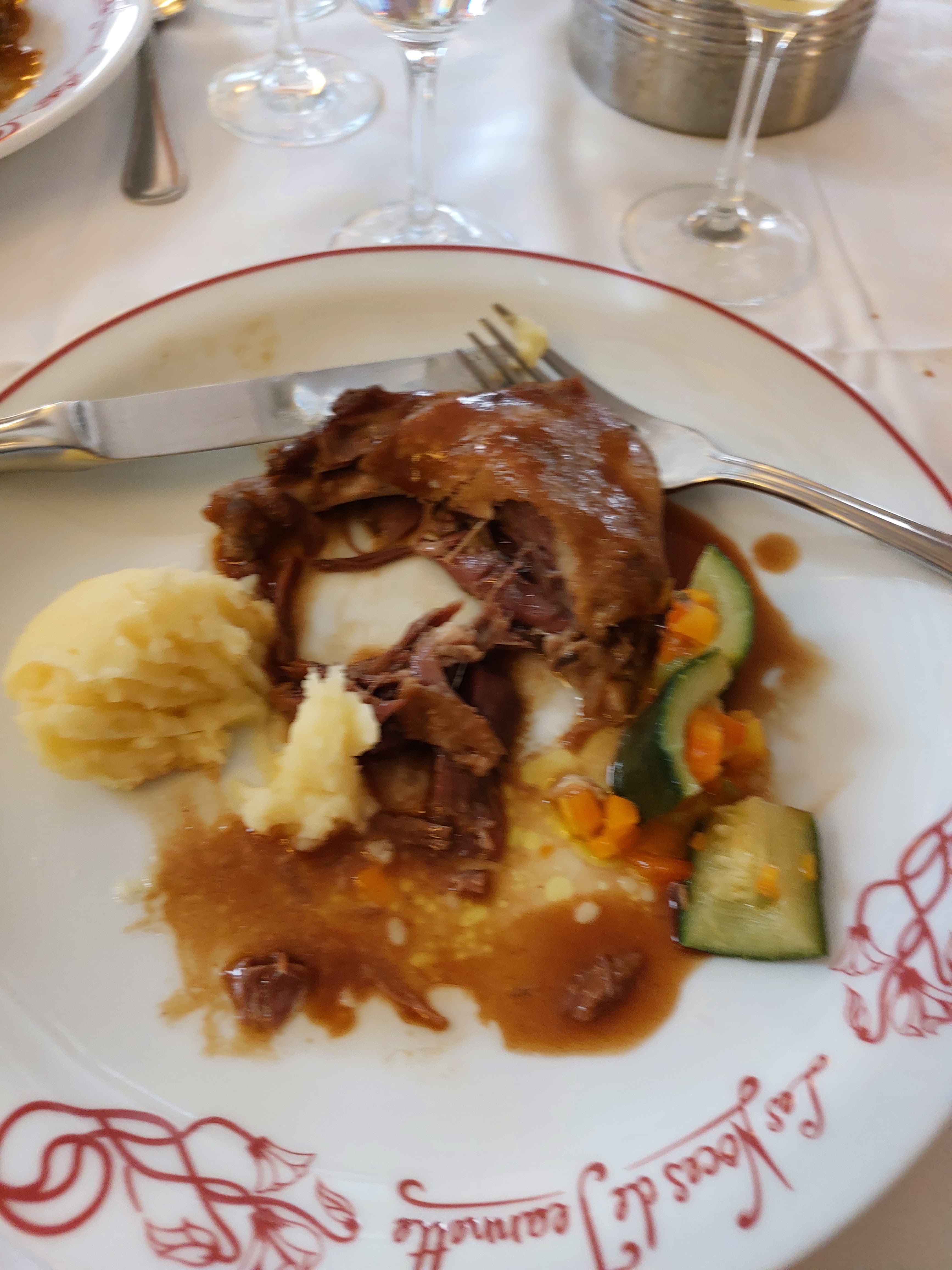 Nous avons mangé dans ce restaurant dimanche soir29 janvier 2023 après avoir été au théâtre. Le repas était simple malgré un prix unique de plus de 50€ vin compris l'entrée quelques feuilles de salades avec une fine tranche de poisson. Une cuisse de canard confites avec quelques pommes de terre et en dessert une mousse de chocolat décongelé avec un peu de crème vanille. Vin rouge ou blanc pas de rosé. Déçue de la prestation une serveuse était en jogging et haut en polaire. Je ne pense que nous y retourneront. Nous étions un groupe de 32 personnes.
