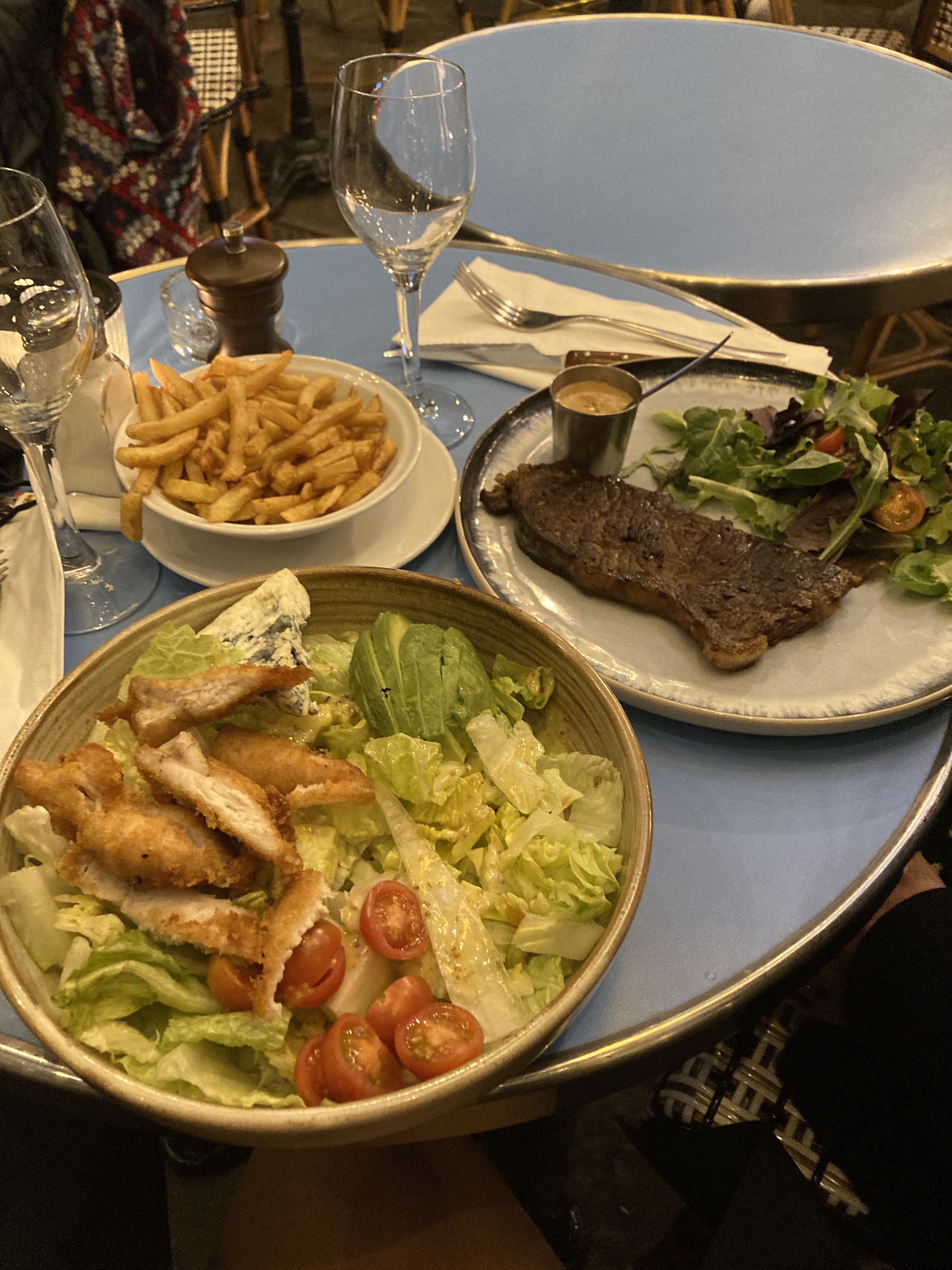 Nous avons pris l'assiette de charcuterie/fromage et partagé un steak... il y avait aussi l'apéritif de doigts de feta et l'apéritif de crevettes... tout était délicieux et bien présenté ! Je reviendrais certainement ici quand je serai à nouveau à Paris !!