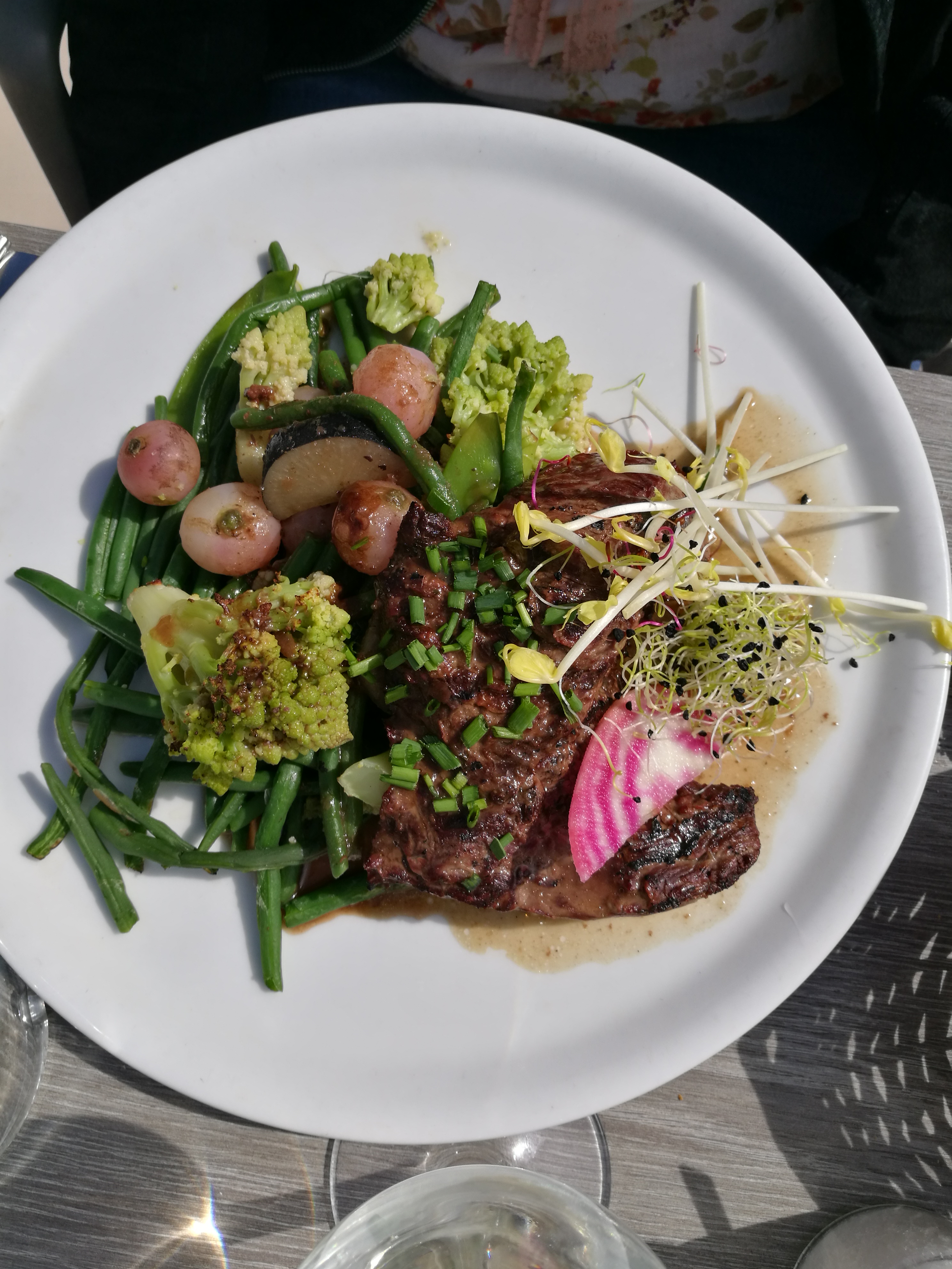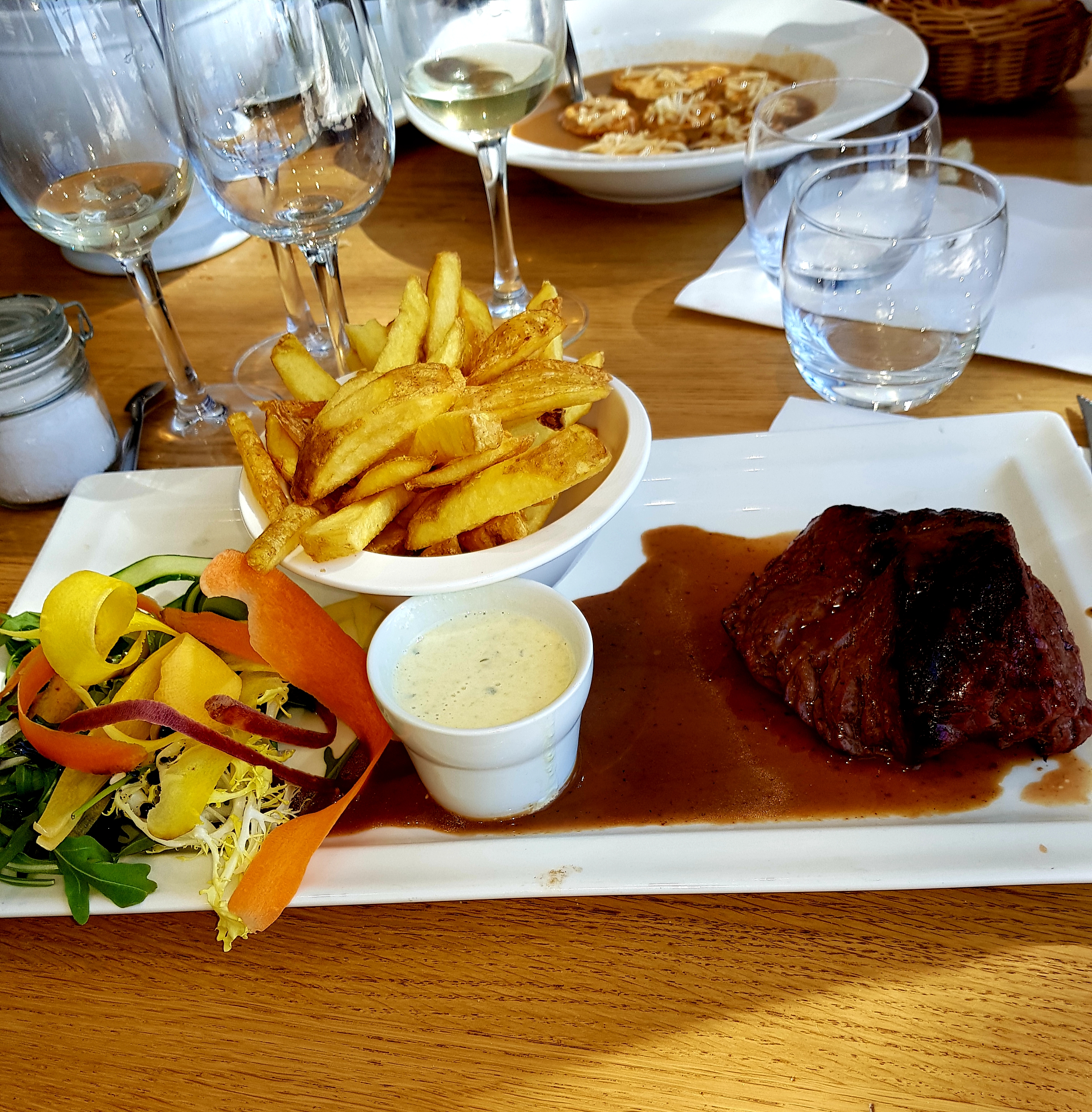Le cadre très sympa! Au niveau des plats: la salade César revisitée prise par une copine ne m'a pas du tout mis l'eau à la bouche manque d'assaisonnement, me paraissait sèche, sans grand intérêt! La pièce du boucher super bonne, sauce Roquefort trop liquide pour moi, enfin la soupe de poisson a plus à tout le monde! Le serveur super sympa!