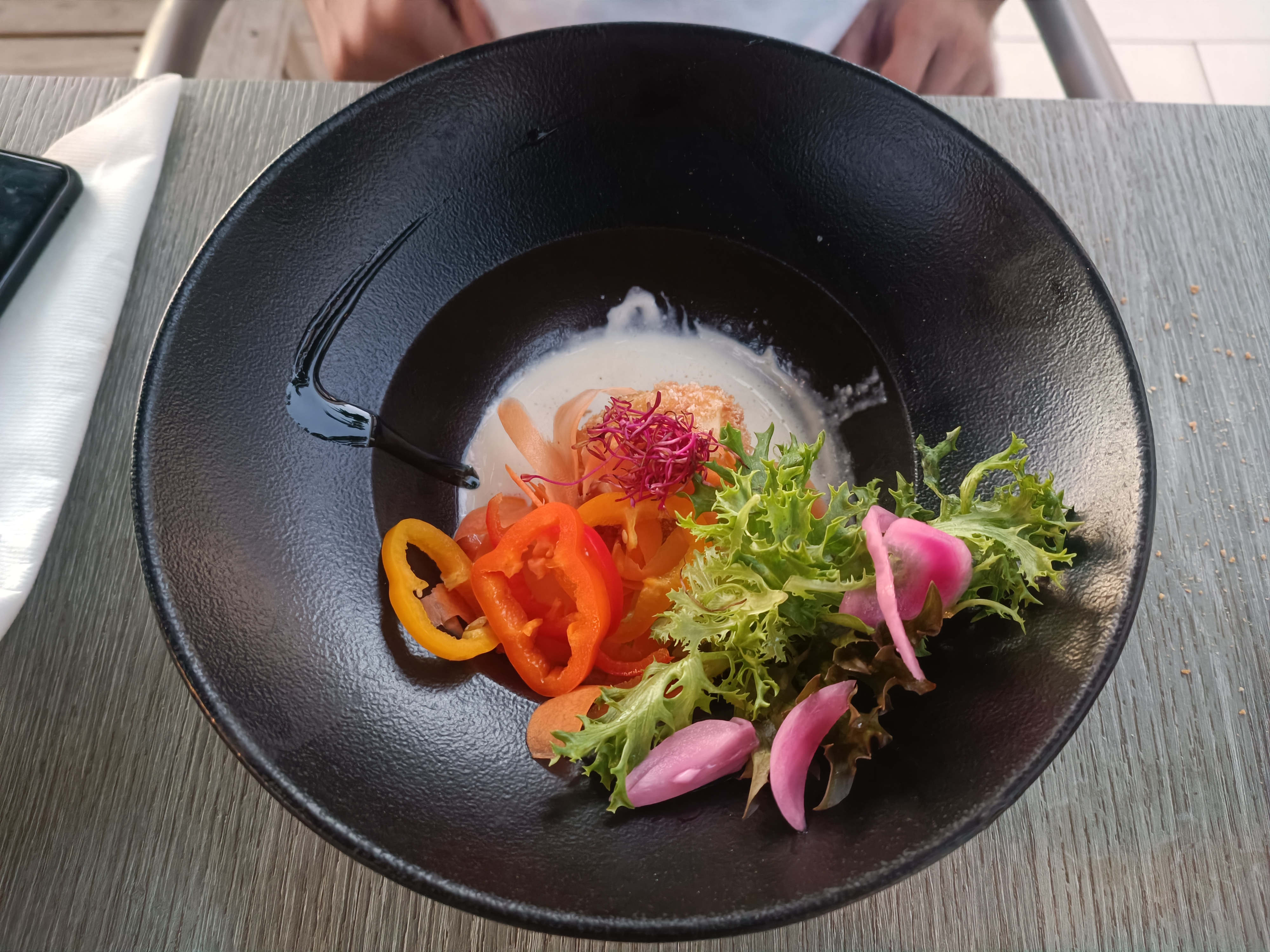 Terrasse et cuisine Super! Mais gros point noir sur service: serveurs (sauf un), terrasse et comptoir bar sans masques! Impardonable vu nombre touristes! Nous (et d'autres + 65 ans et à risque! Le gérant doit en tenir compte