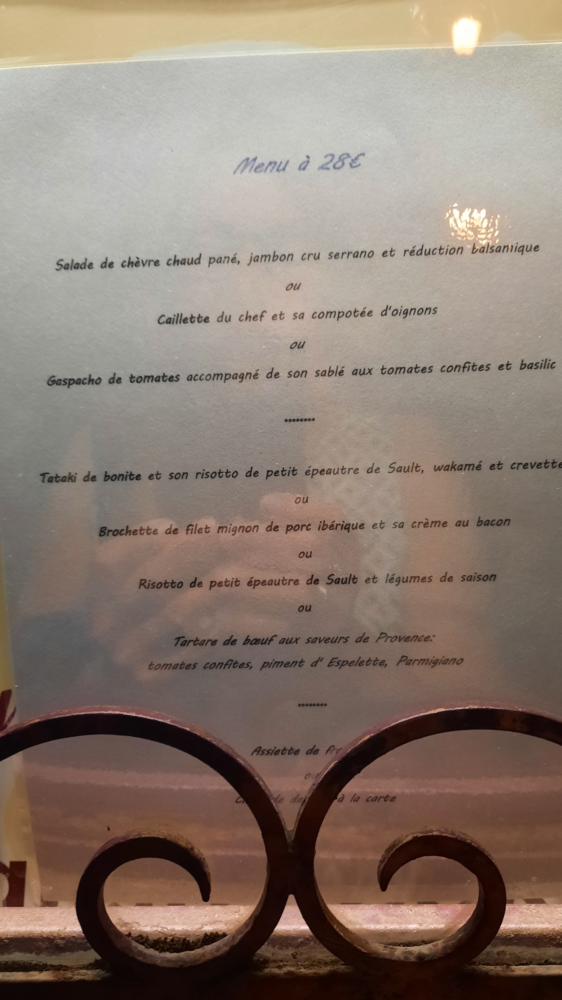 Un peu comme tout le monde : bel accueil, menu à 23€ entrée plat dessert de qualité, pichet de vins du pays, on s'est régalé. Pour ça Google c'est quand même bien fait 😀. Après une virée au Mont Ventoux, un petit resto hors des sentiers battus c'est quand même pas mal. En été ils ont une très belle terrasse. Un truc que j'ai pas compris : menu du jour à 15€ avant 13h30, 23€ après ? On a passé une très agréable moment. Merci