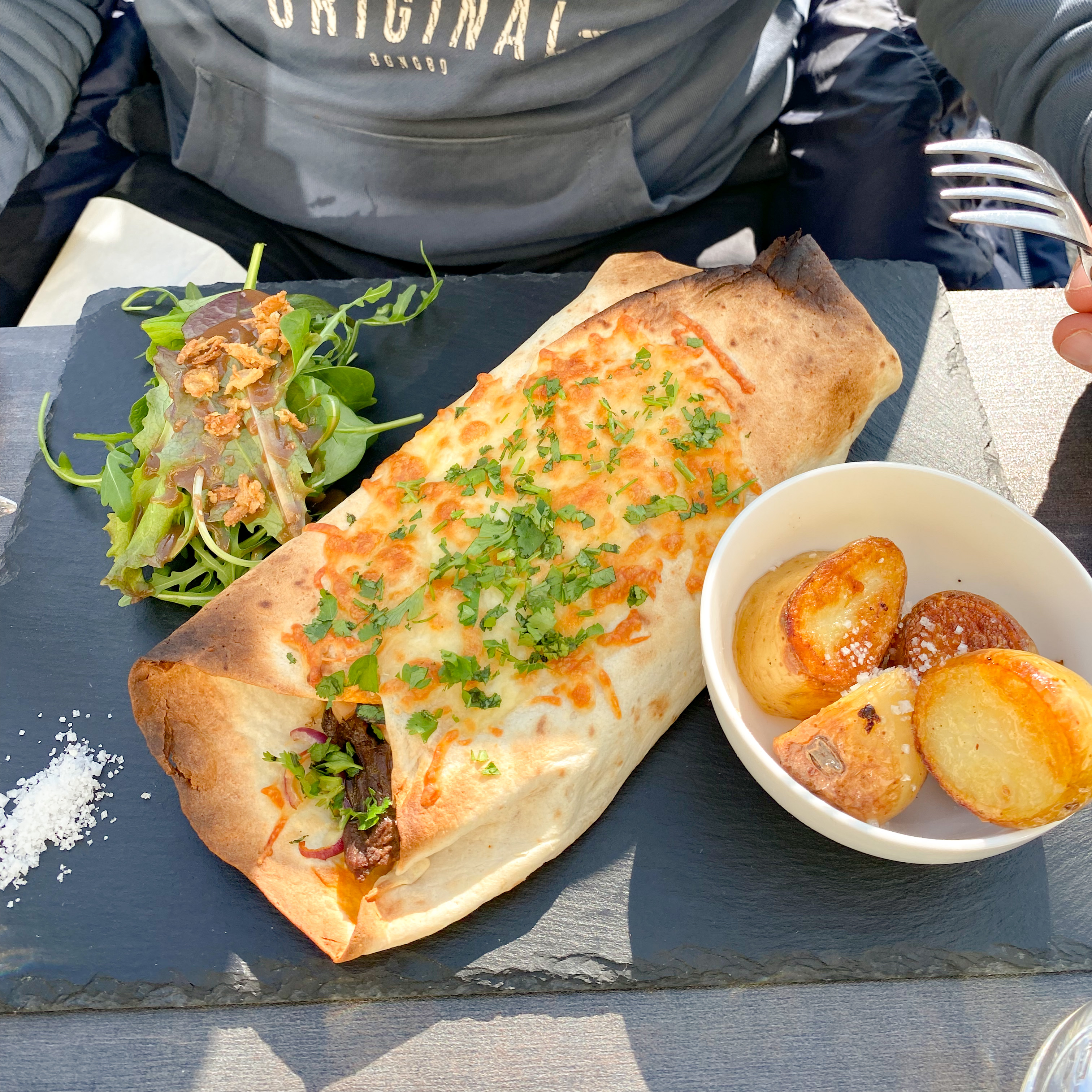 Nous avons pris chacun une Fajita au boeuf, ainsi qu’un fondant et un crumble Super service, bonnes portions Super adresse !!