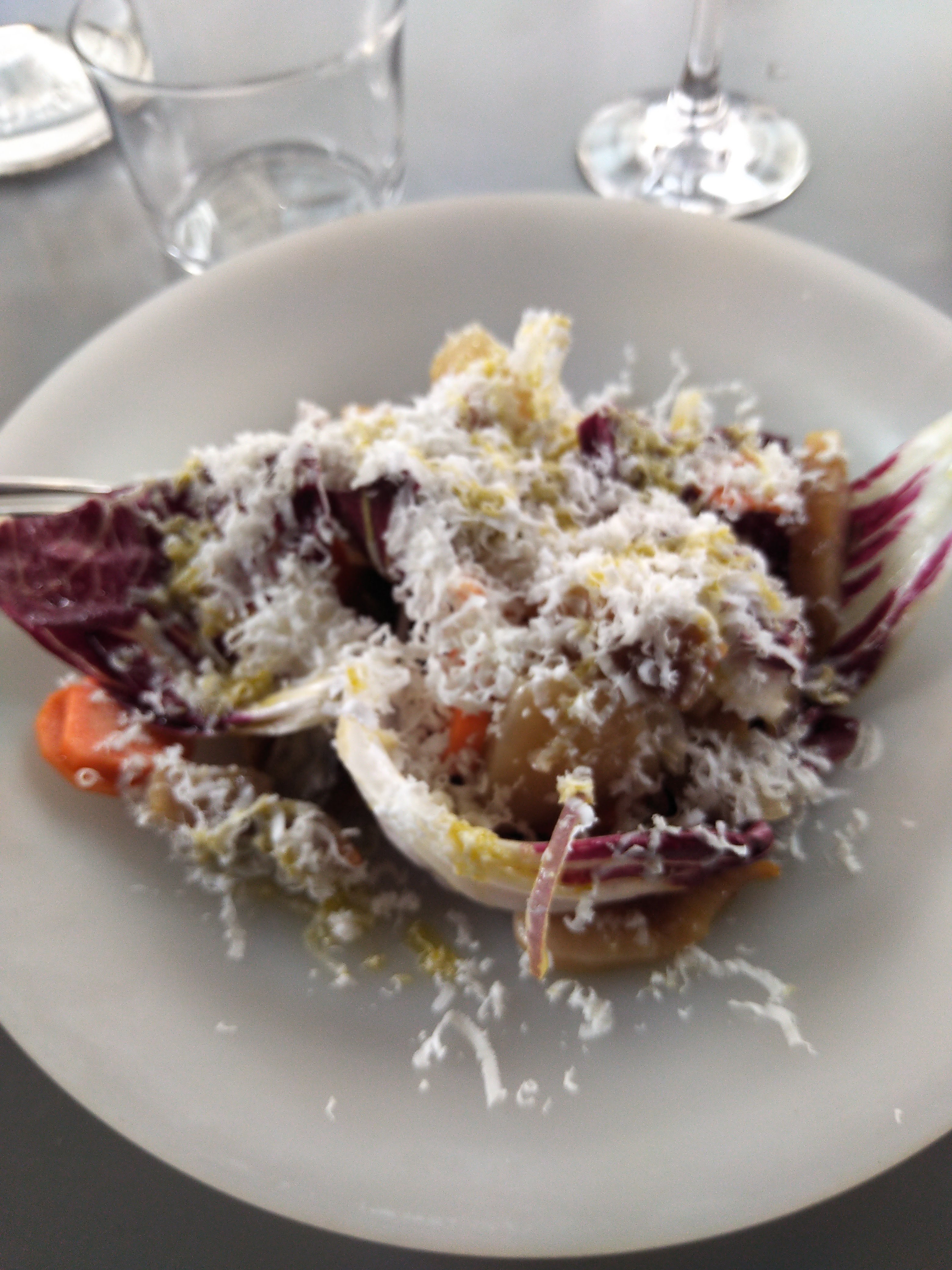 Pour la cuisine rien à dire c'est correct voire bon. Cependant… J'ai commandé un risotto et on me répond qu'il n'y en a plus, on vérifie quand même en cuisine mais non, non, il n'y a plus de risotto. Ok pas de problème je commande autre chose. Des clients arrivent 30 mn plus tard, commandent du risotto et on leur sert du risotto. J'en parle au serveur, il me dit qu'il ne comprend pas, il va se renseigner et disparait (ou plutôt ne réapparait plus à notre table). Un autre serveur (arrogant l'air de rien), m'apporte un fond de risotto (bon qui plus est) en me disant que j'ai le droit d'y goûter. Pas un mot d'excuse, mais un sourire du genre Où est le problème ?. Le problème est qu'il aurait suffit d'un mot sympa plutôt que ce semblant de geste commercial.