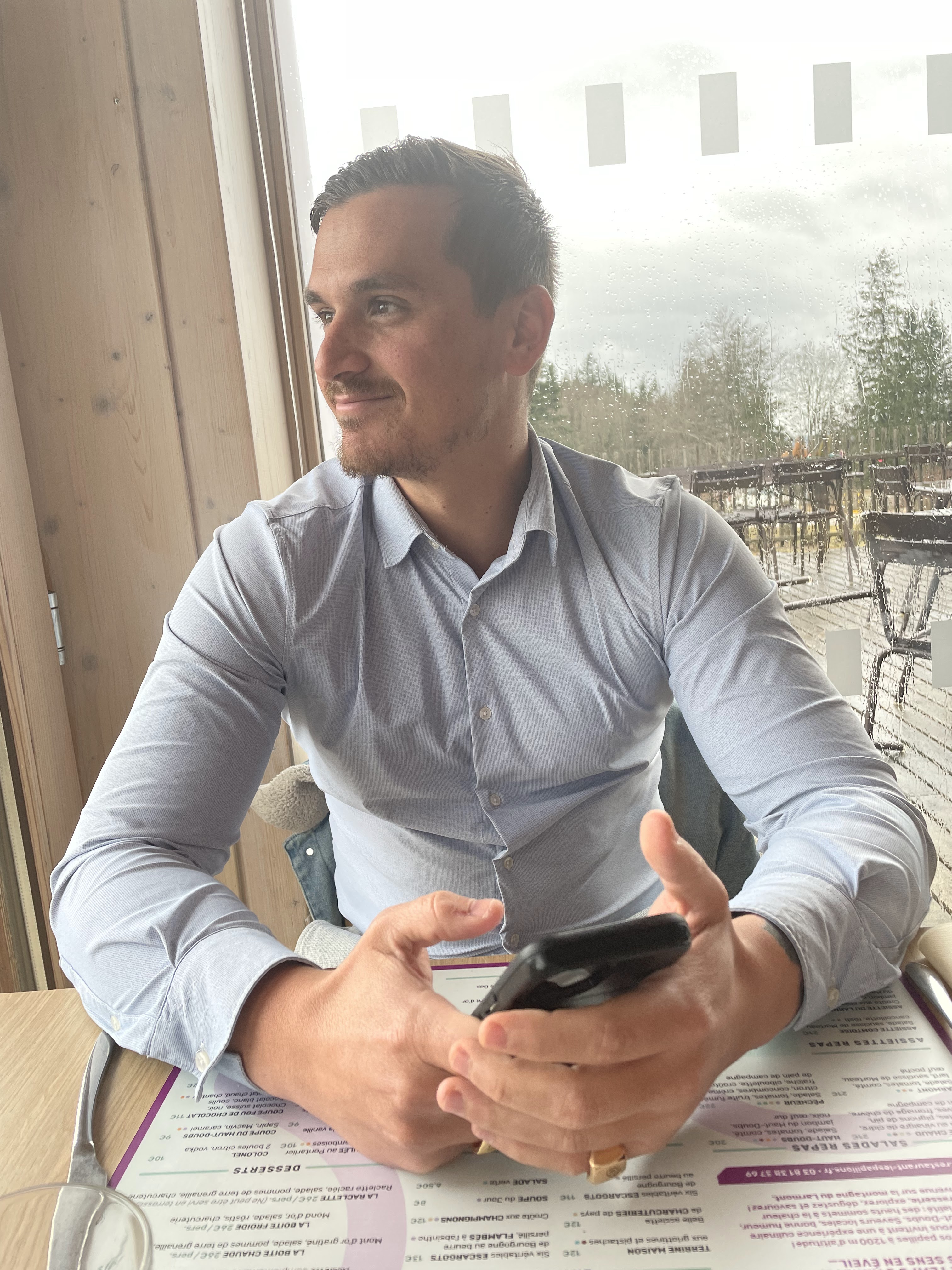 En terrasse ensoleillée avec une vue sublime sur les hauteurs enneigées de pontarlier. Un très bon accueil et un menu auberge (roesti) copieux et un vrai régal , à refaire également en ète le soir au semi gastro les papillons.