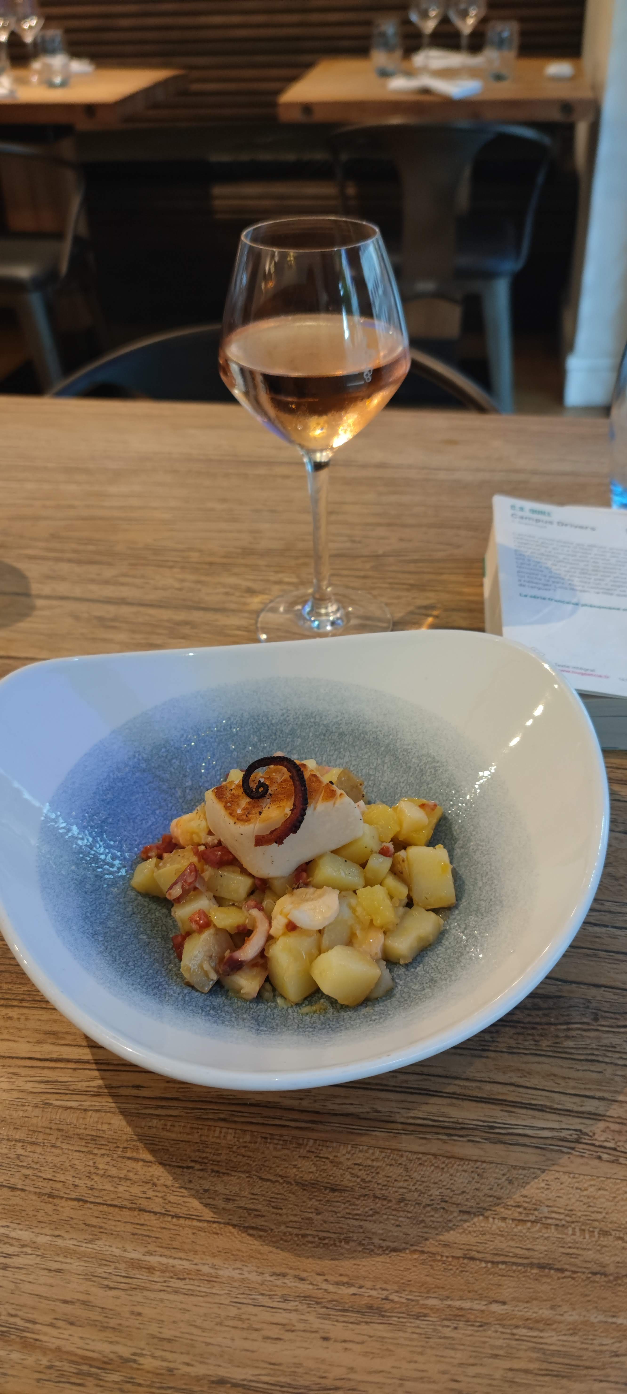Décoration alliant couleurs modernes et matériaux bruts. L'accueil est agréable, le personnel professionnel et côté cuisine, une carte assez simple et un menu du jour intéressant : filet d'eiglefin accompagné d'haricots verts au chorizo 👍 Petit bémol concernant le poisson en surcuisson, une cuisson nacrée serait préférable ;)