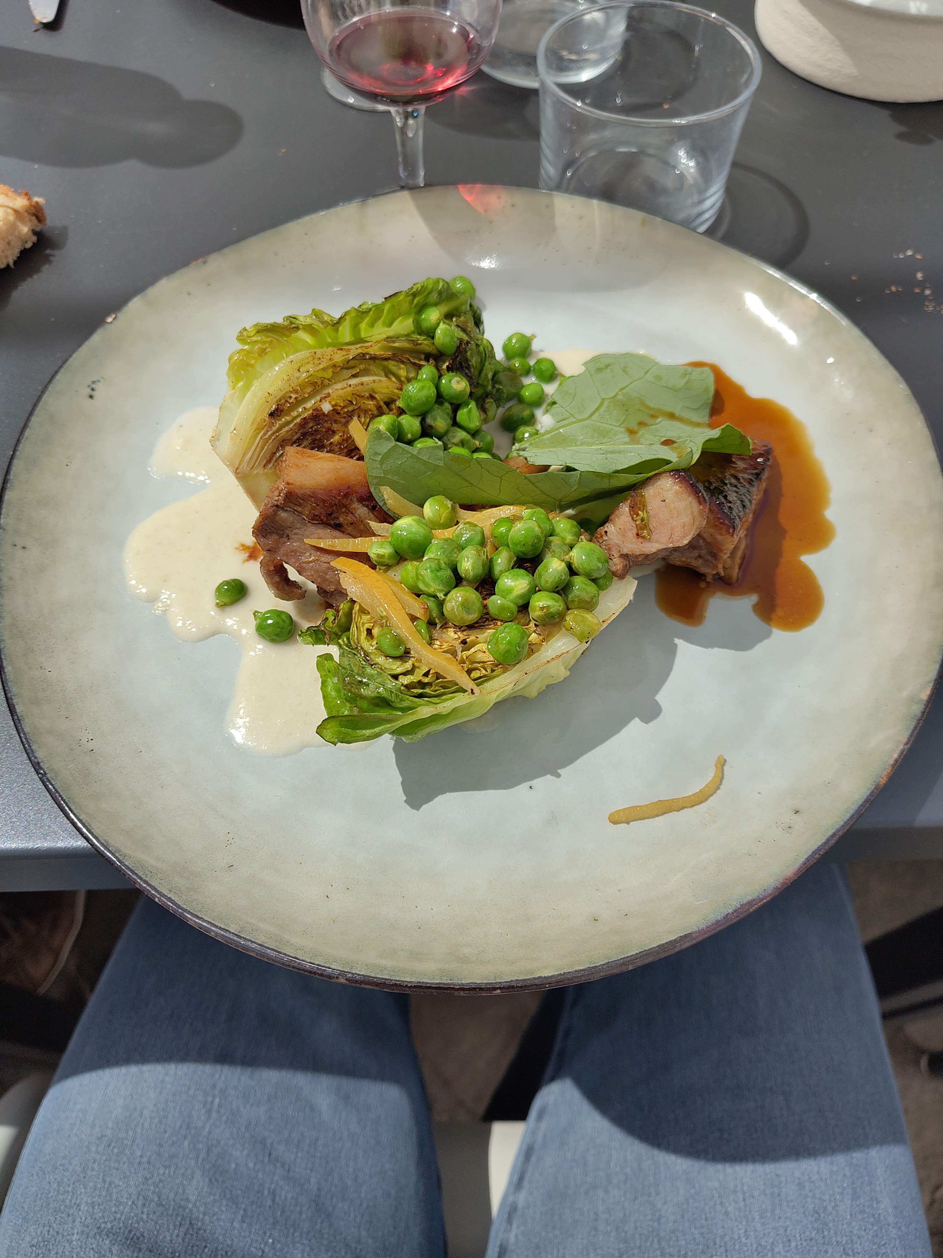 Ns avons choisi la formule du jour. Les assemblages étaient goûteux, bien présentés. Ttfois la viande était un trop complexe, nerveuse, avec tes morceaux coriaces. Concernant le désert le fruit rouge était fort en goût, saturant le goût des autres composants. La journée était venteuse, mais là c’est d’aléas de la météo.