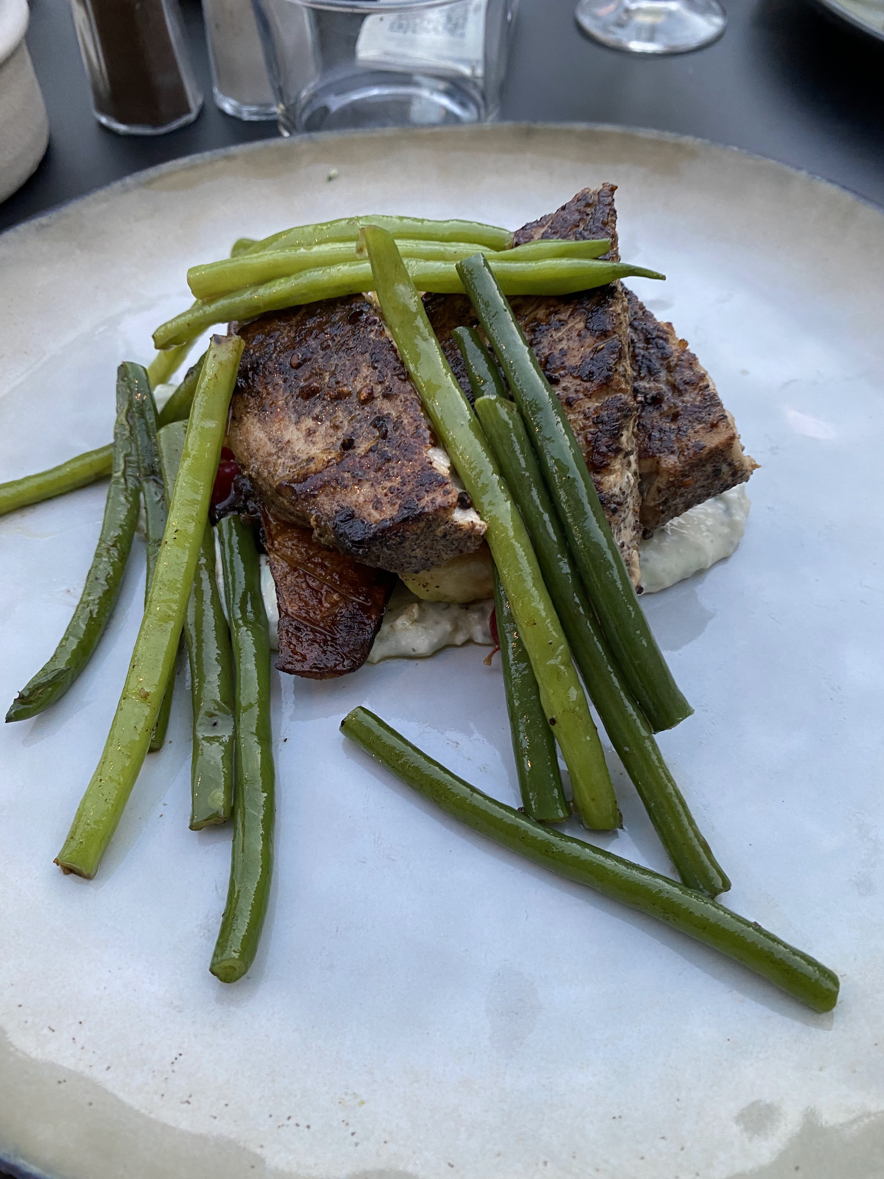 Cadre magnifique… rien à redire… Le thon à la ligne … superbe… Mais… l’assiette bien bien ébréchée pour un plat à 28€… bof bof SVP les verres à vin…. Changez les… le nez ne rentre pas dedans… Et le vin blanc… glacé… 😭😭😭