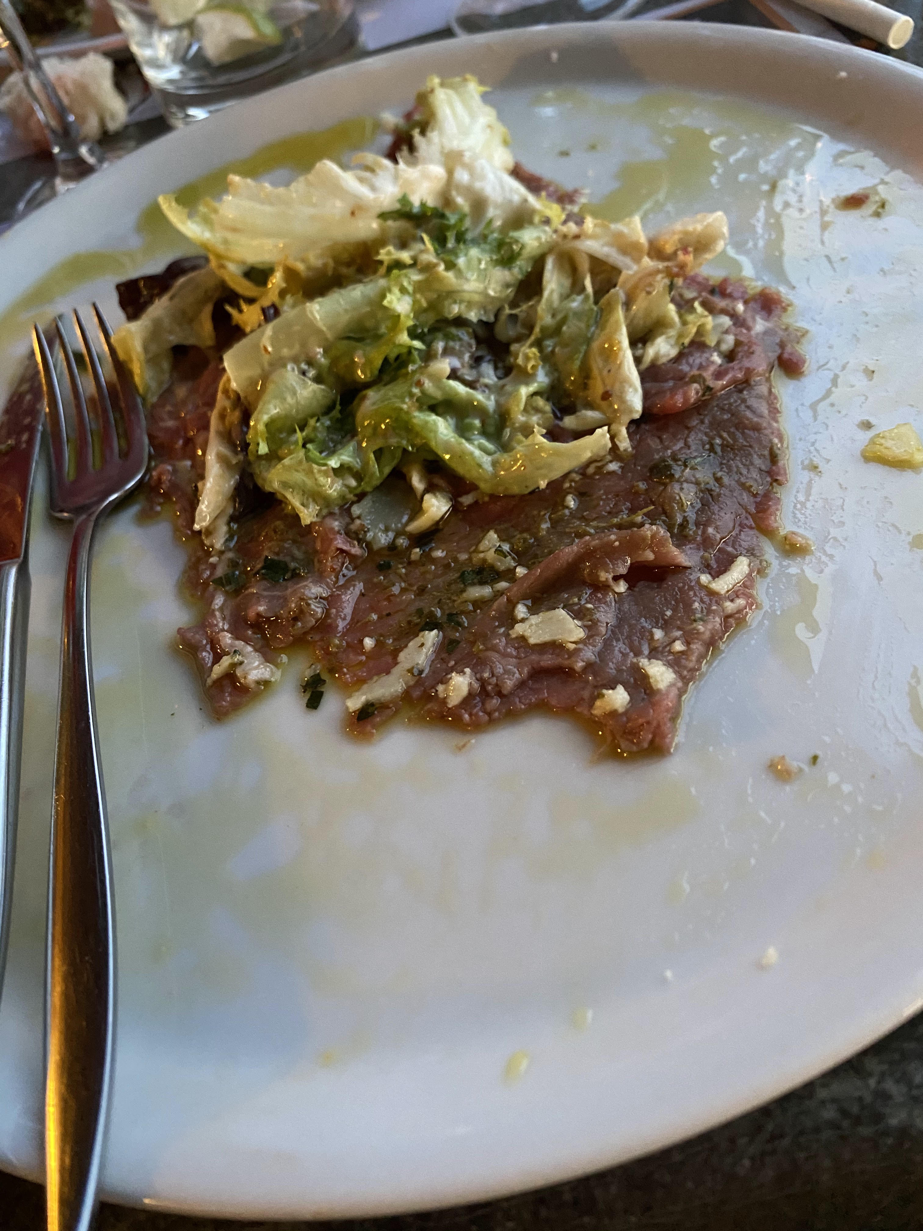 Pas loin de 90€ de facture Cadre agréable mais je mets zéro pointé sur la bouffe. On est pas assis, qu’est-ce que vous buvez ? Limite vous êtes venus avec votre propre carte que vous avez consulté pendant le trajet. 🙄 Vous n’avez pas bu qu’est-ce que vous mangez,et ça continue etc. un harcèlement permanent limite envie de partir. Le Corona est passé par là mais franchement précipiter les clients pour qu’ils mangent à fin de les remplacés par d’autres c’est abusé. Un jambon Serrano degeulasse « discount» et un Carpaccio de bœuf d’une grossièreté dans une assiette pleine d’huile et de laitue écœurante,juste manger l’es bords sans jamais toucher le reste. La photo en témoigne 🤮 Et la bouteille de rosé à 25€. 9,18€ dans le commerce ... sympa Pas moyen de se poser une petite heure pour manger sans avoir autour de soi à chaque table des fumeurs en train de Clopé je trouve ça vraiment moyen pour les non fumeurs qui sont aussi des clients. À votre appréciation