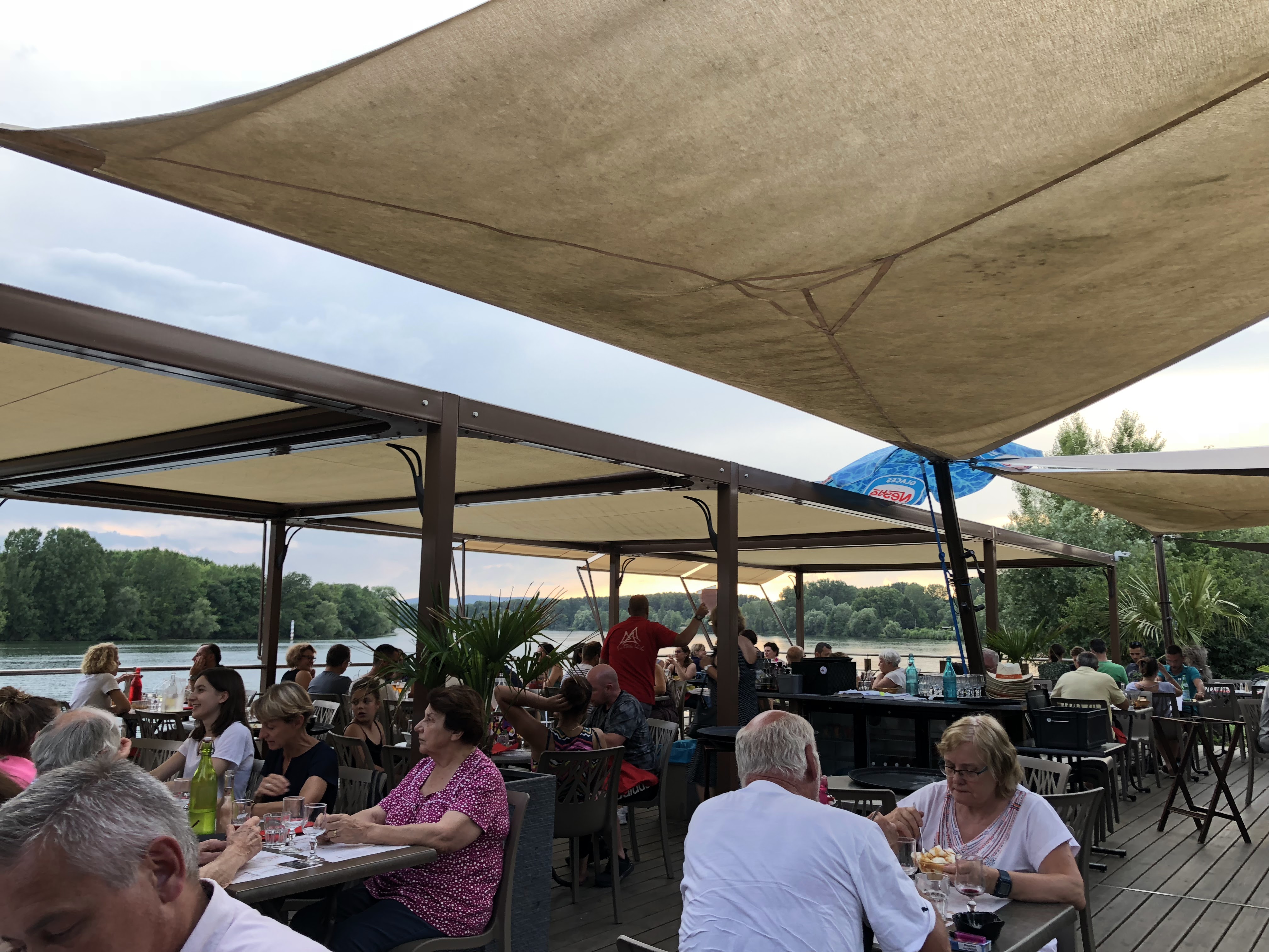 Nous recherchions un restaurant en bord de Saône et nous y sommes allés en couple un samedi. Nous avons garé la voiture dans le pré avant le quai car le long de la route d’accès c’est complet et le bazar !!! Repas gouteux et service dans le tempo rien à redire. Après ça se complique. 2€ de supplément pour une coupe glacée alors que nous avons pris l’apéritif, du vin et des menus à 39€ (déjà cher par rapport à la concurrence) Il y a prés de 200/250 convives en même temps. Aussitôt une table libérée elle est reprise ça « grouille » et voila arrive une percussion entre 2 serveurs et la coupe de glace tombe du plateau sur notre table heureusement sans conséquence grave. Si vous voulez vraiment y aller choisissez plutôt en semaine et réservez sur la terrasse prés du bar car plus en hauteur avec une meilleure vue sur la Saône. Pour nous ce sera un autre restaurant au bord de l’eau la prochaine fois