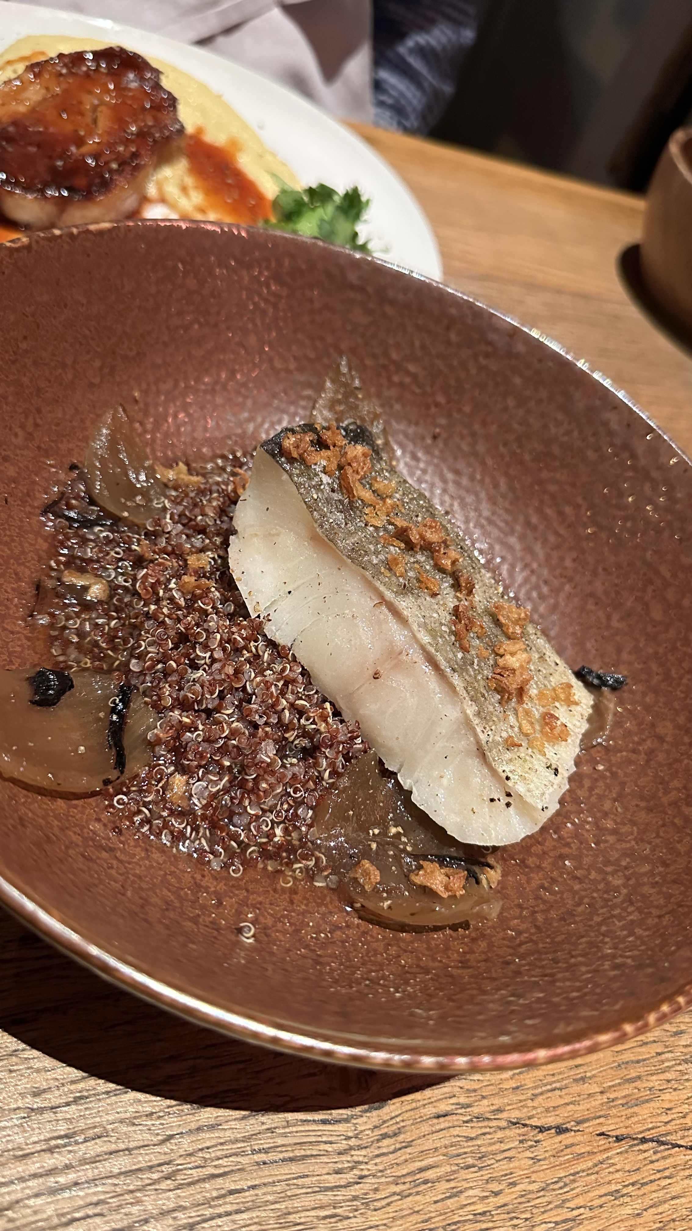 Bilan moyen mais plutôt positif La serveuse a été très bien , le serveur est clairement à revoir . Il guette le plat à l’affût pour enchaîner la carte et le dessert . J’avais encore la bouche pleine . C’est très moyen de faire cela et désagréable. Mon appétit a été complètement coupé … une seule envie écourté mon dîner . Au niveau de l’entrée , elle manquait de peps trop lisse et on a pas senti le foie gras les morceaux sont trop petits . En bouche on a ressenti uniquement le gras du canard et pas le foie …. Dommage La saint Jacques était limite un chouya trop cuite . Elle n’était pas translucide au cœur à la découpe mais c’était très correcte Les petites croûtons de pains grillés n’apportent pas énormément de chose Dommage parce qu’avec là St Jacques on recherche douceur et moelleux et non du croustillant biscotte Proposition très correcte dans un restaurant propre avec une belle carte de vin Mais il y a des ajustements à réaliser