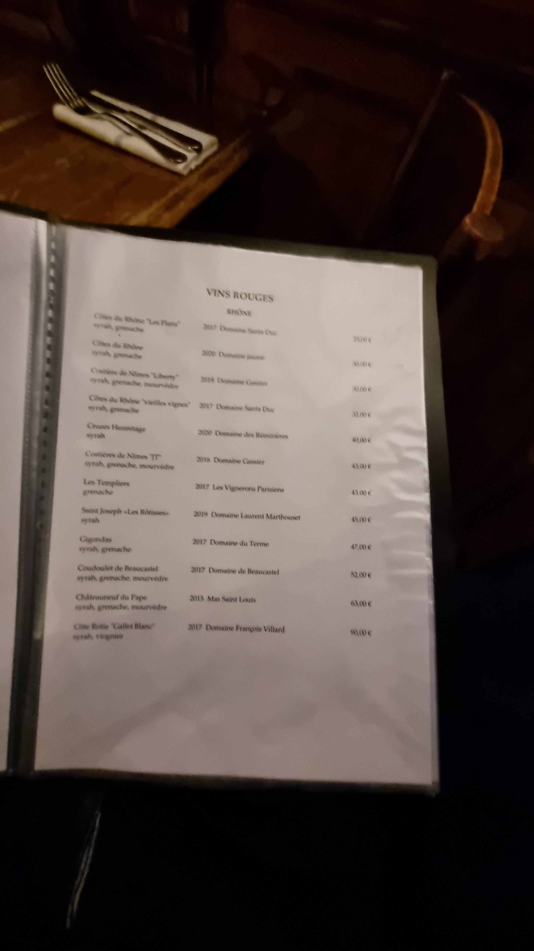 Commentaire en retard, j'y suis allé en avril avec ma compagne: Les entrées, tellements bonnes que je prenais des bouchées minuscules pour faire durer. Je ne savais même pas que des asperges pouvaient avoir ce goût. Pour accompagner, un vin proposé qui se mariait parfaitement avec. Vin blanc sec: côté du Rhône la friande blanc Les plats, un tendron de veau avec blettes, oignons et tout plein de choses dont je n'ai pas retenu le nom, mais dont les saveurs étaient une expérience délicieuse et chaleureuse. Vin: pinot noir. Proposé également, et également un parfait mariage Dessert, un mi-cuit chocolat, avec une boule de glace vanille. Fait maison, y compris la glace vanille. Ai-je besoin d'en dire plus ?