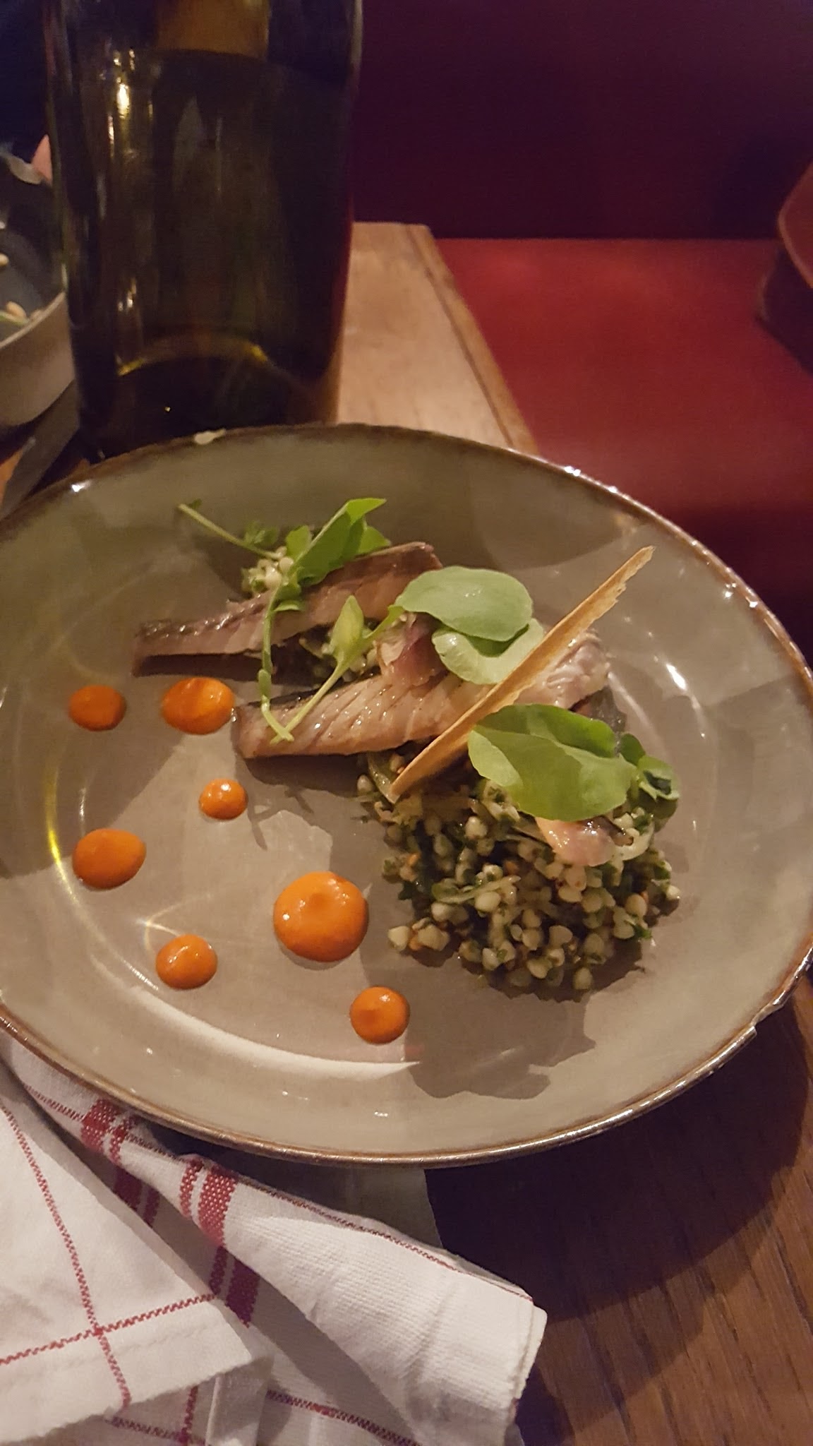 Produits frais, très belle présentation, association de saveurs originale et innovante et belle carte de vins. En salle, l'accueil est super et très professionnel, en cuisine la cheffe Élise excelle. A refaire très vite pour gouter les autres assiettes qui donnaient envie.