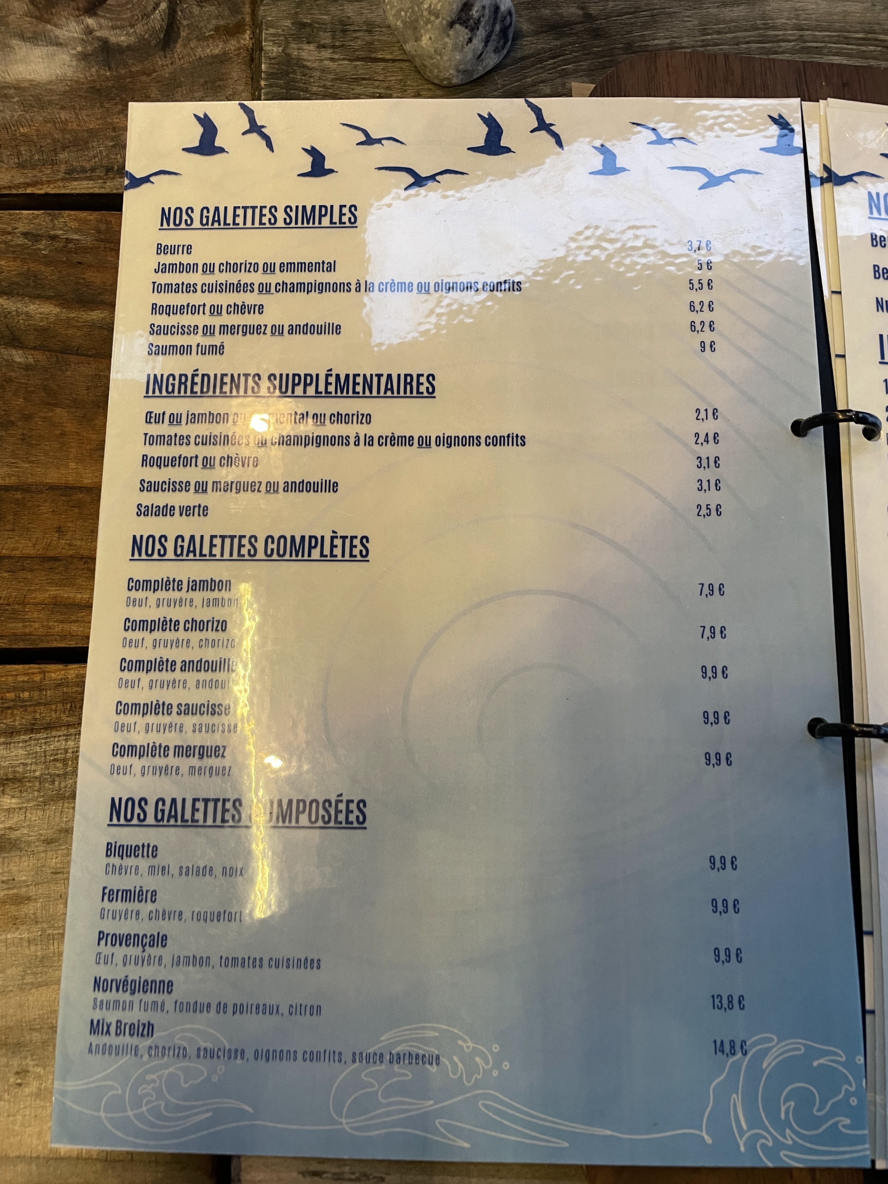Joli moment gustatif avec une belle vue. Les palourdes trop cuites ont été changé sans discuter par une nouvelle assiette et nous vous remercions à nouveau, la 2eme était très bonne Bonne cuisson pour Les tentacules qui étaient excellentes , et non caoutchouteuses La crêpe biquette était bonne dommage qu'il il n'y avait pas de salade avec les crêpes et galettes salées. Par contre, beaucoup trop de serveurs pour notre table , nous avons vu 5 personnes différentes et là c est très moyen. Nous avons eu l'impression d un grand bazar, très brouillon Cela peut être amélioré très facilement même si le personnel est très souriant Et Cela permettrait de moins attendre entre chaque plats car c était très long