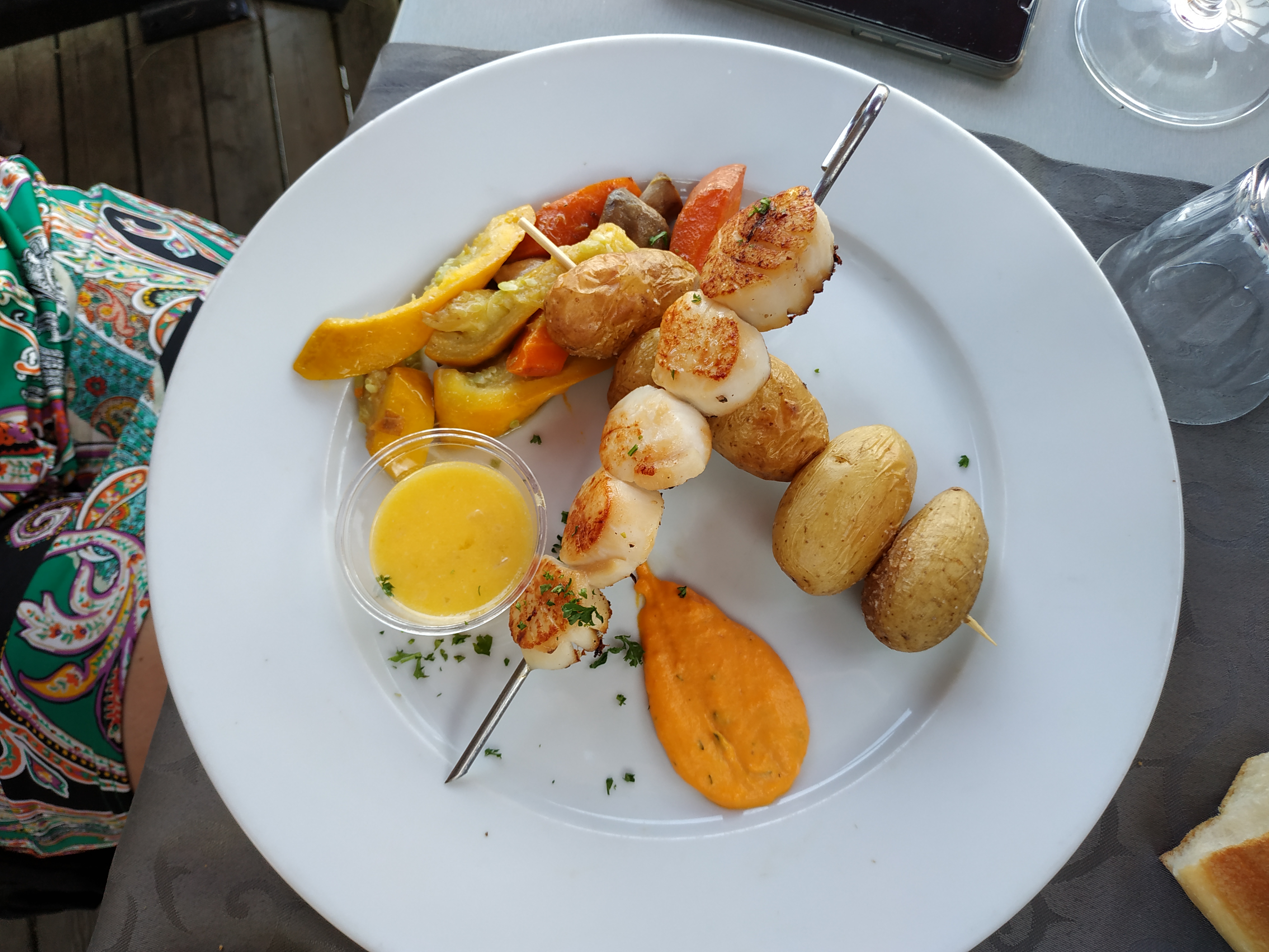 Le cadre de bord de mer est très beau, le service rien à dire mais le poisson du jour s’est transformé en sardines qui avaient tout l’air de sortir de la boite de conserve et qui baignaient dans l’huile. Les légumes de saison : une petite portion d’émincés ( surgelés ?). Les autres convives ont pris des crêpes qui étaient tout à fait correctes.