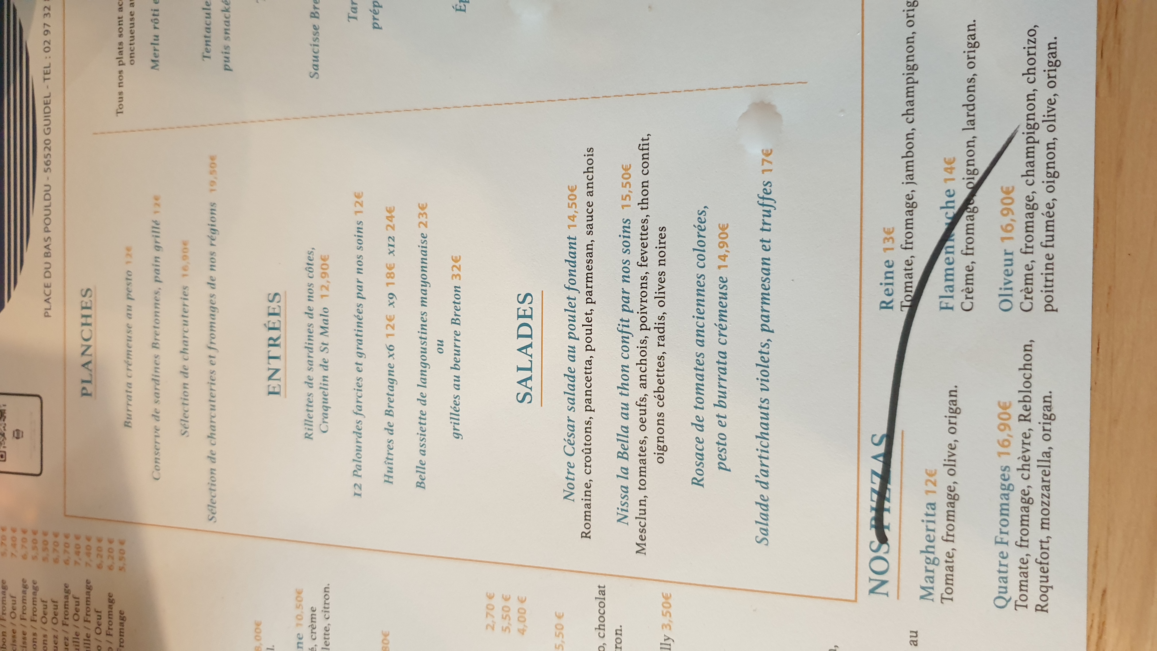 Restaurant beaucoup trop cher par rapport a la quantité des plats on me propose une cassoulette et en fait c est une soupe de poisson immangeable froide moule dessécher on me propose un autre plat je prends une crêpe garni de jambon fromage et tomate cuisine le plat arrive froid froamge non fondu et tomate cuisine c est de la sauce tomate 🤔 donc si passé devant passé fuyez