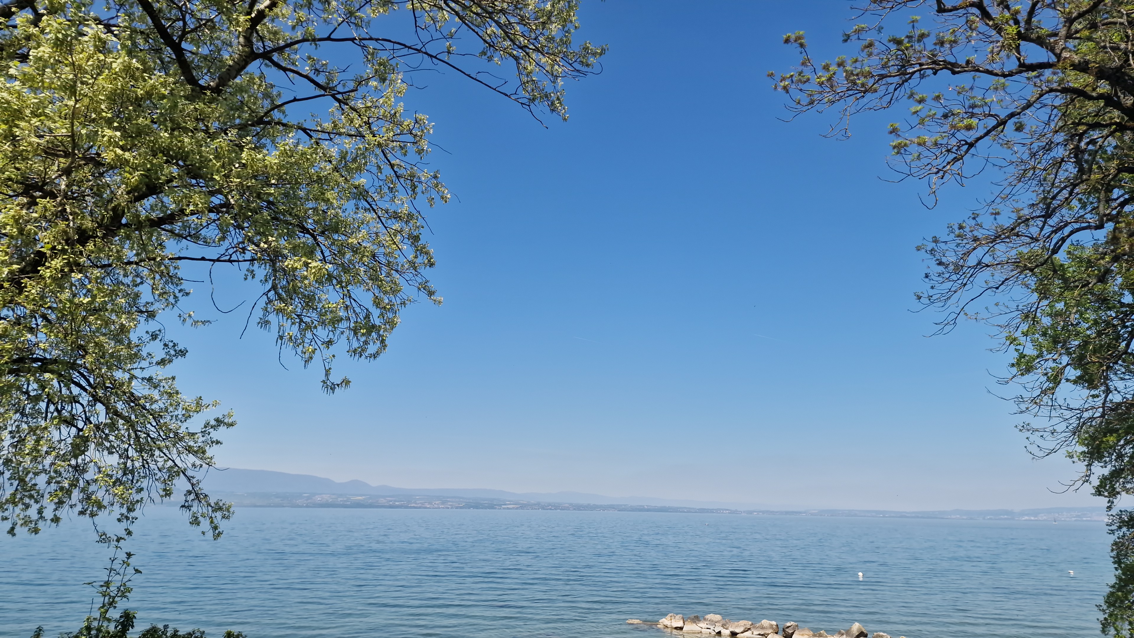 Superbe terrasse ,au calme avec de la fraicheur en ce jour de canicule ,grace aux arbres , tres belle vue sur le lac Léman et les rives opposées ..