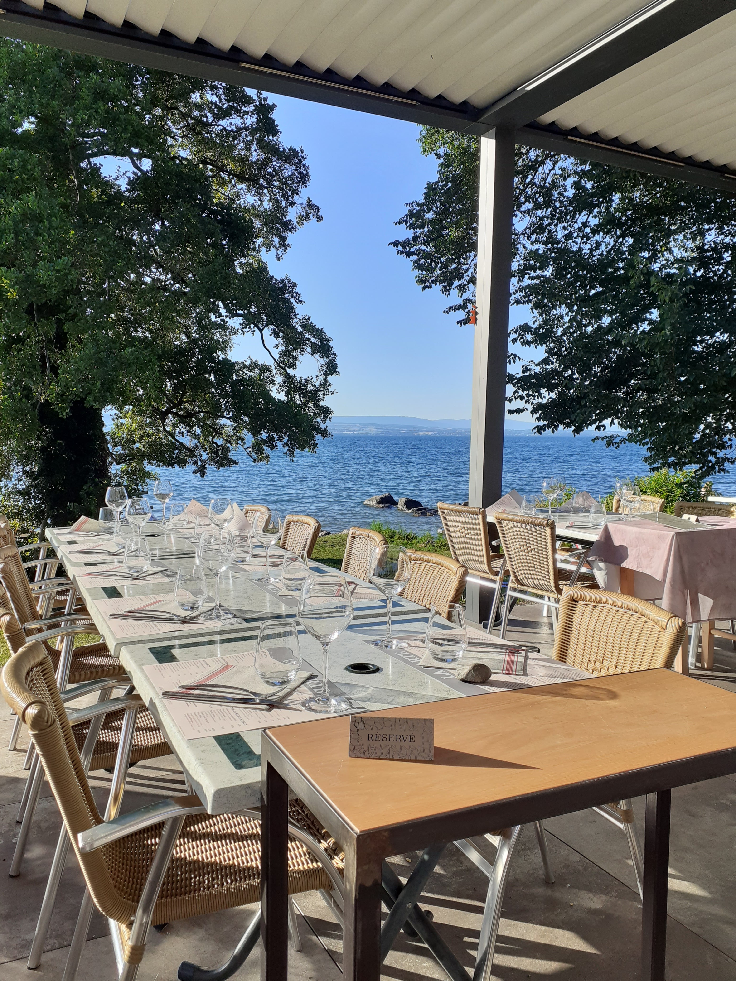 Bel endroit qui porte parfaitement son nom. Vous serez réellement à quelques mètres des rives du lac Léman. Une soirée de fin d'été, un peu de vent qui soulevait quelques vagues qui reflétaient la lumière du soleil... L'équipe du service est efficace et pleine de charme, la cuisine respecte ses hôtes mais reste simple, le rapport qualité prix est convenable pour le secteur. Le menu enfant propose du poisson frais.