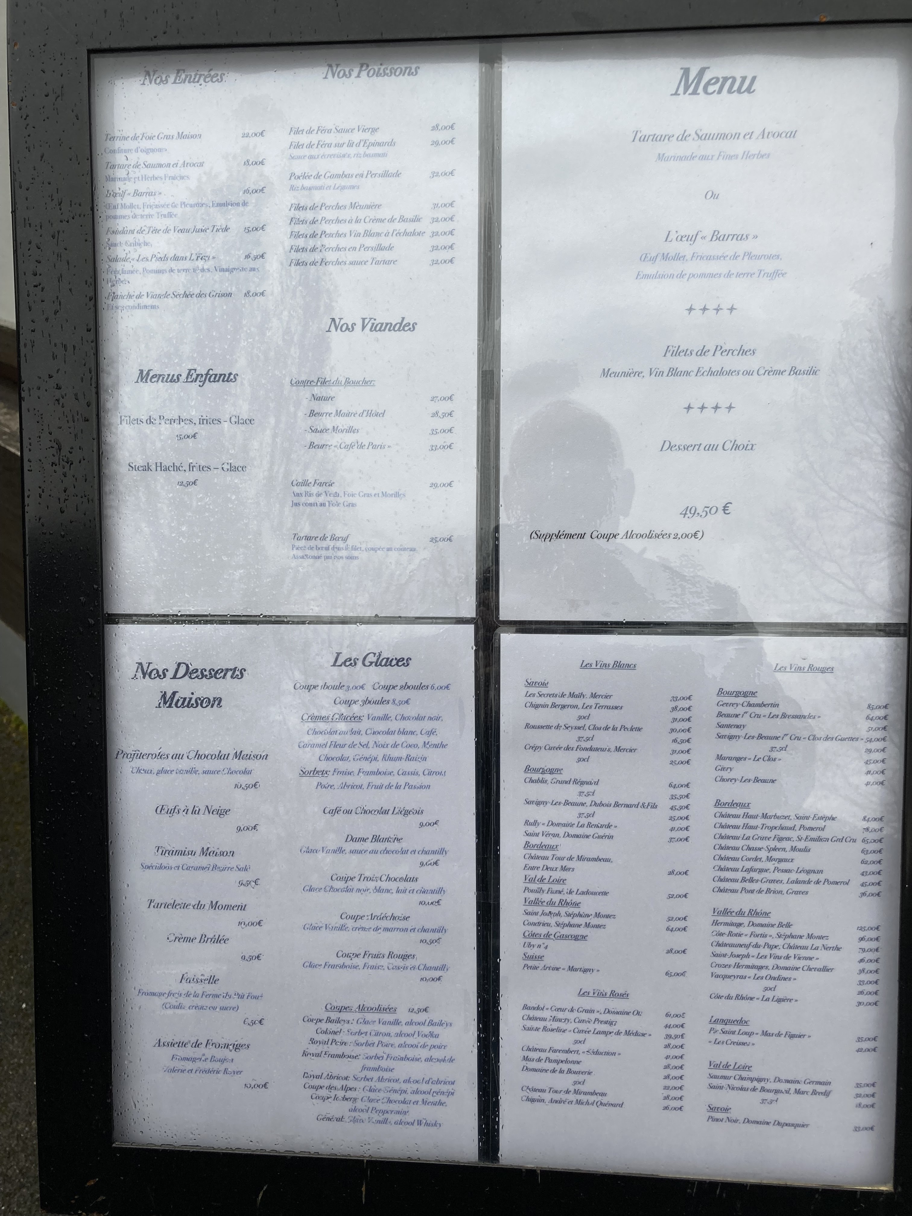 Le dimanche 4 aout 2019 a midi nous avons mange des filets de perches/Salade/Frites pour 27'50 €/ pesonne. C'etait tres copieux et nous nous sommes vraiment régalés. Seul bemol filets de Perche importes alors que le lac est a cote et pas indiqué sur la carte... Service agreable mais tres long restaurant complet.