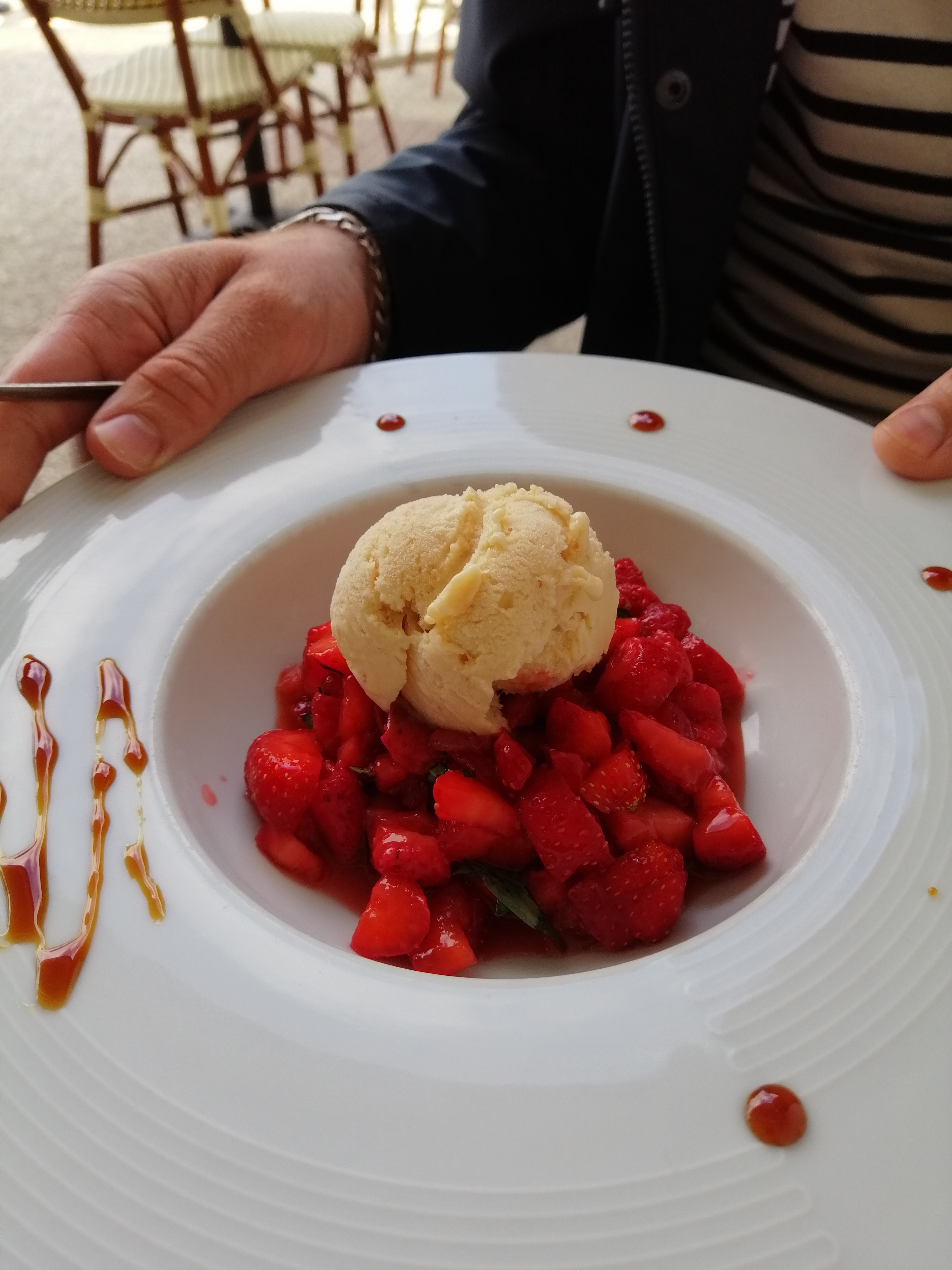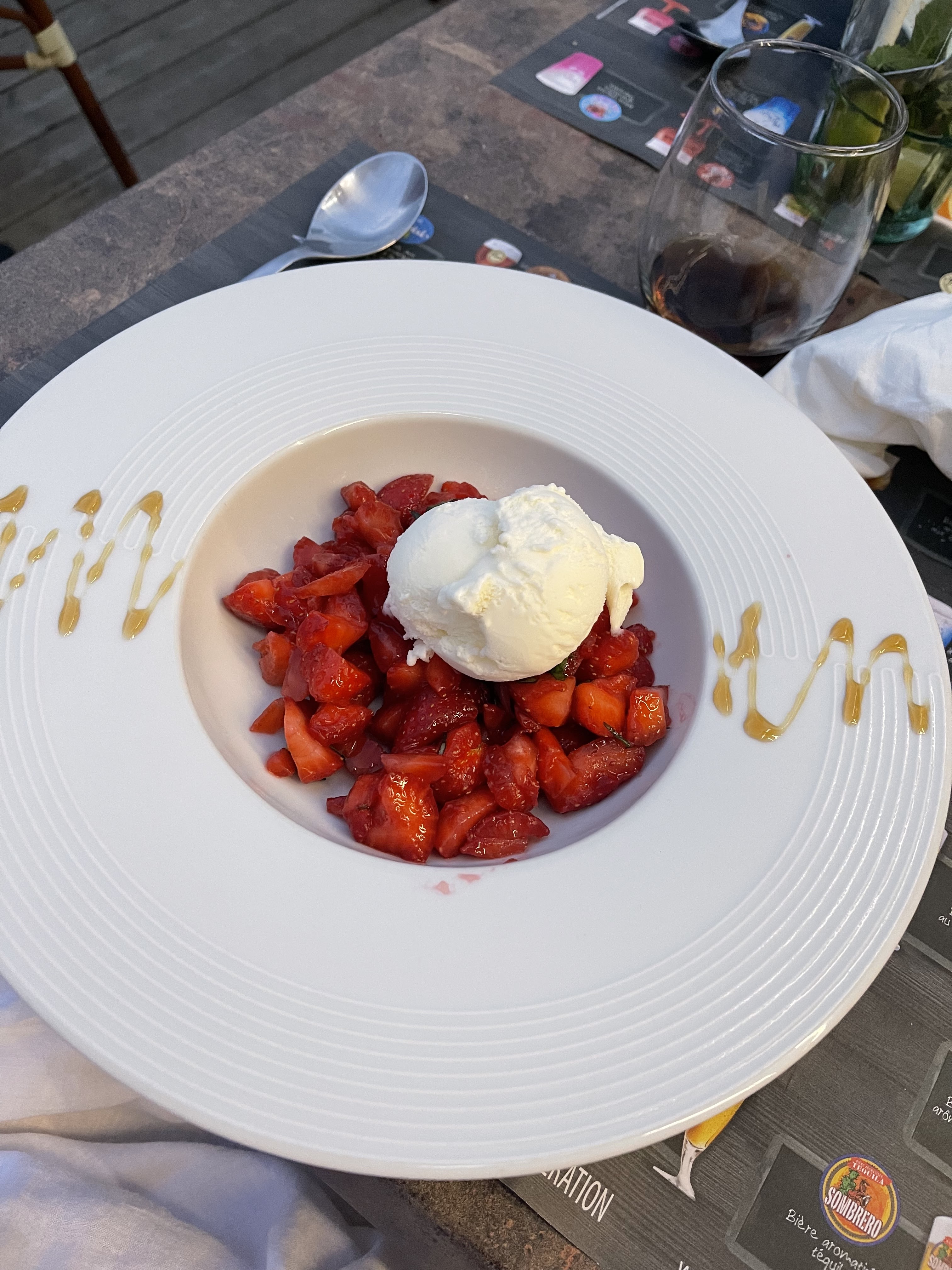 Possibilité de manger en terrasse. Le prix de 26 € pour le menu entrée plat dessert est très raisonnable vu la fraîcheur des produits. Mon coup de cœur revient au dessert avec le nougat glacé fait maison.