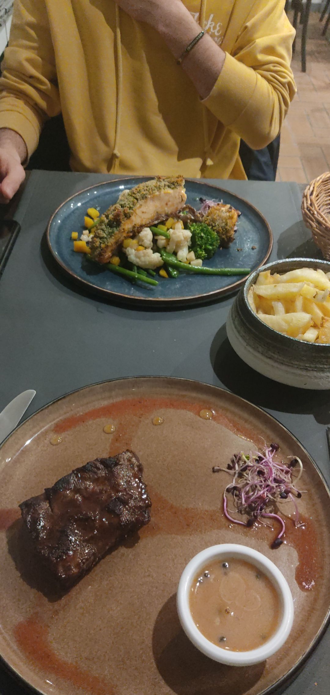 Nous avons très bien mangé à 3, la viande de bœuf servi avec des frites très tendre, le poisson excellent, petit bémol il est servi juste avec une ratatouille, j'aurais aimé une petite pomme de terre ou un peu de riz, je suis resté sur ma faim, heureusement que mon petit fils n'a pas fini ses frites !