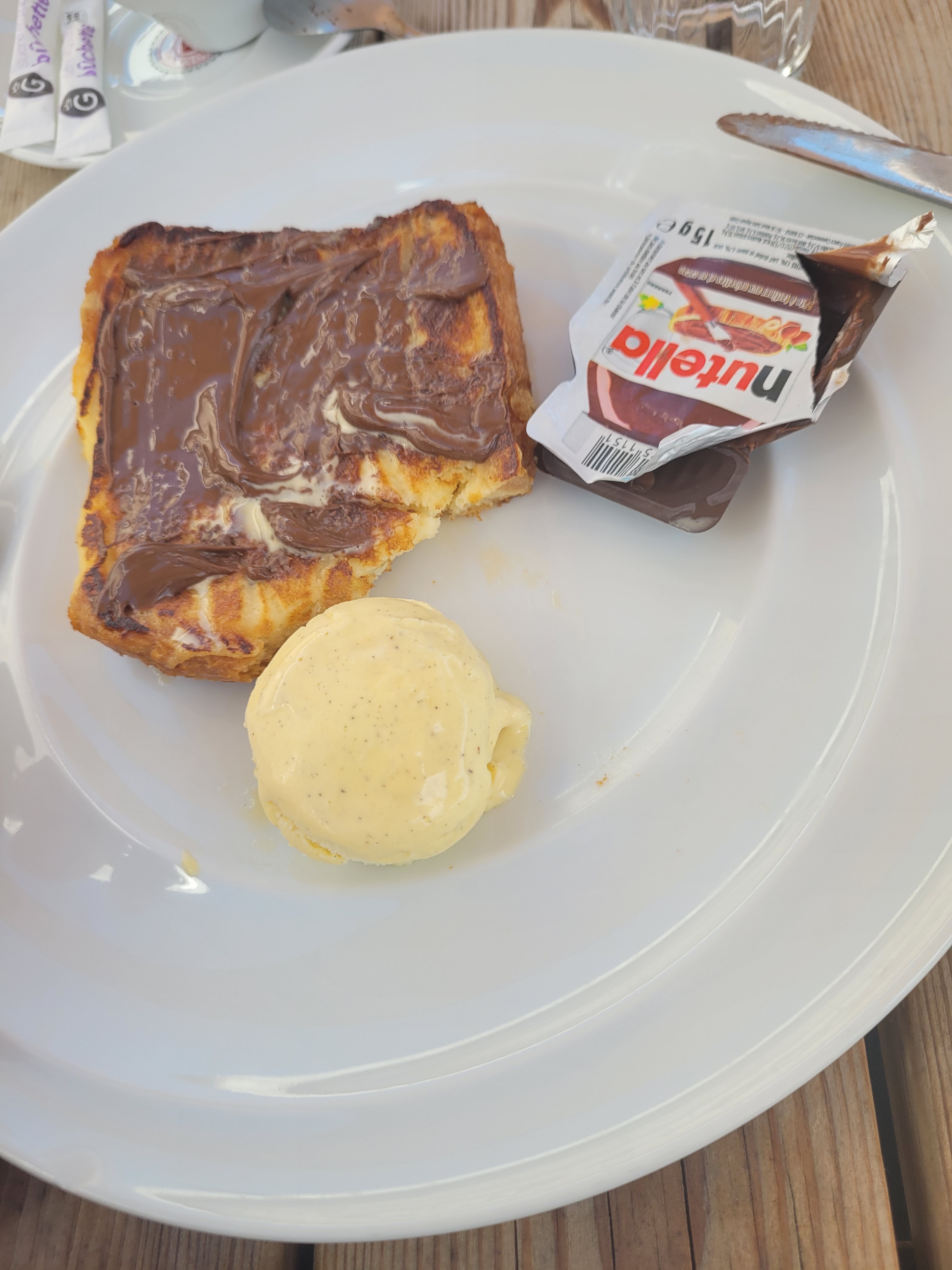 Je met 1 pour le cadre très agréable un service désastreux mais vraiment alors qu'on devait être tout juste 3 tables vers 15h je vous laisse voir en photo le résultat d'une brioche perdue à presque 10€ je l'ai demandé au Nutella voici une noisette de Nutella dans un bout de plastique honteux !!!!! La première fois la serveuse m'apporte l'assiette à un goût différent je lui dis que je la demande au Nutella et elle me l'a laissé en me fournissant cette petite barquette je refuse car il y avait toujours le speculos et caramel dessus et le Mr revient avec la brioche dans une nouvelle assiette et sa barquette de Nutella en plastique