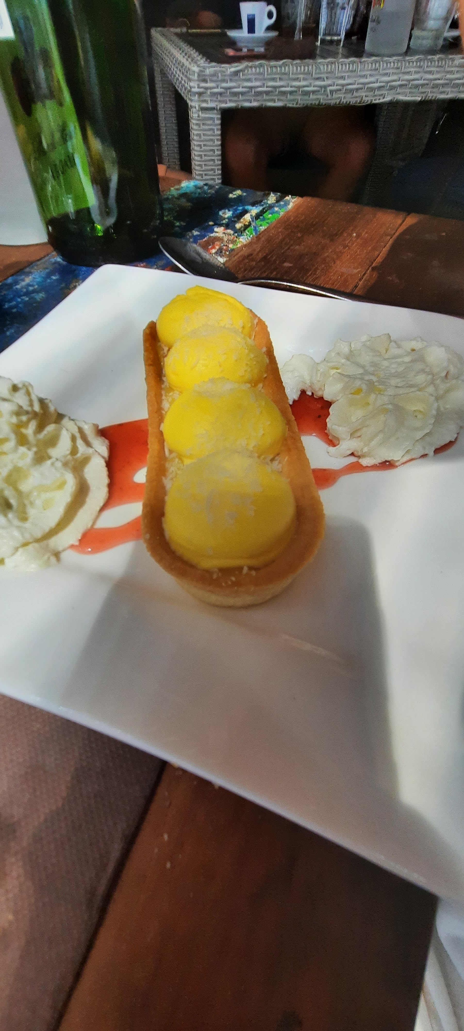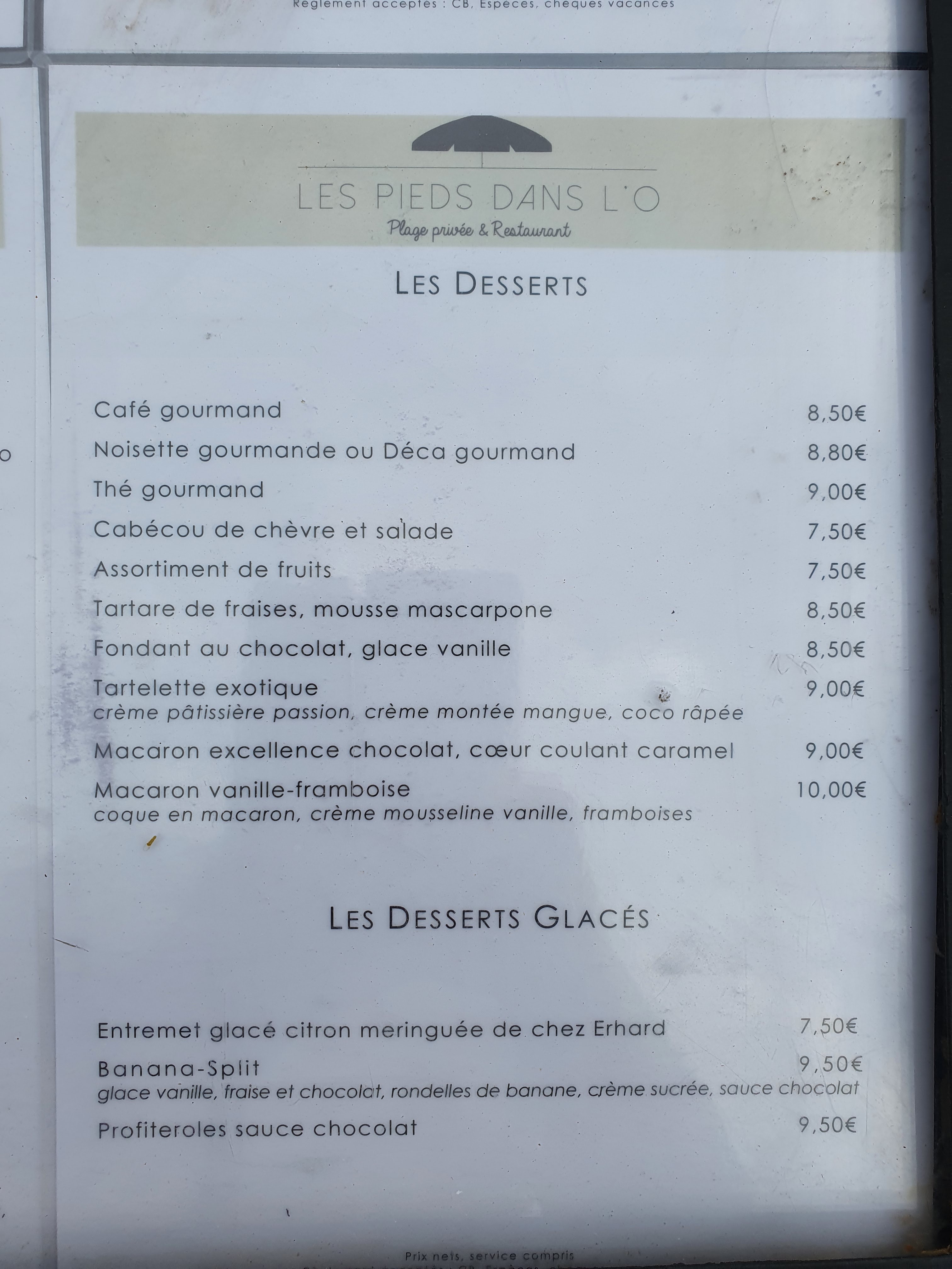 Petite pause gourmande, en fin d'après-midi. Panaché et glace Chantilly. Service rapide et personnes agréable. Certes peu de monde à cette heure là. Lieu très agréable grande terrasse et plage avec transats d'ou le nom Les pieds dans l'O...