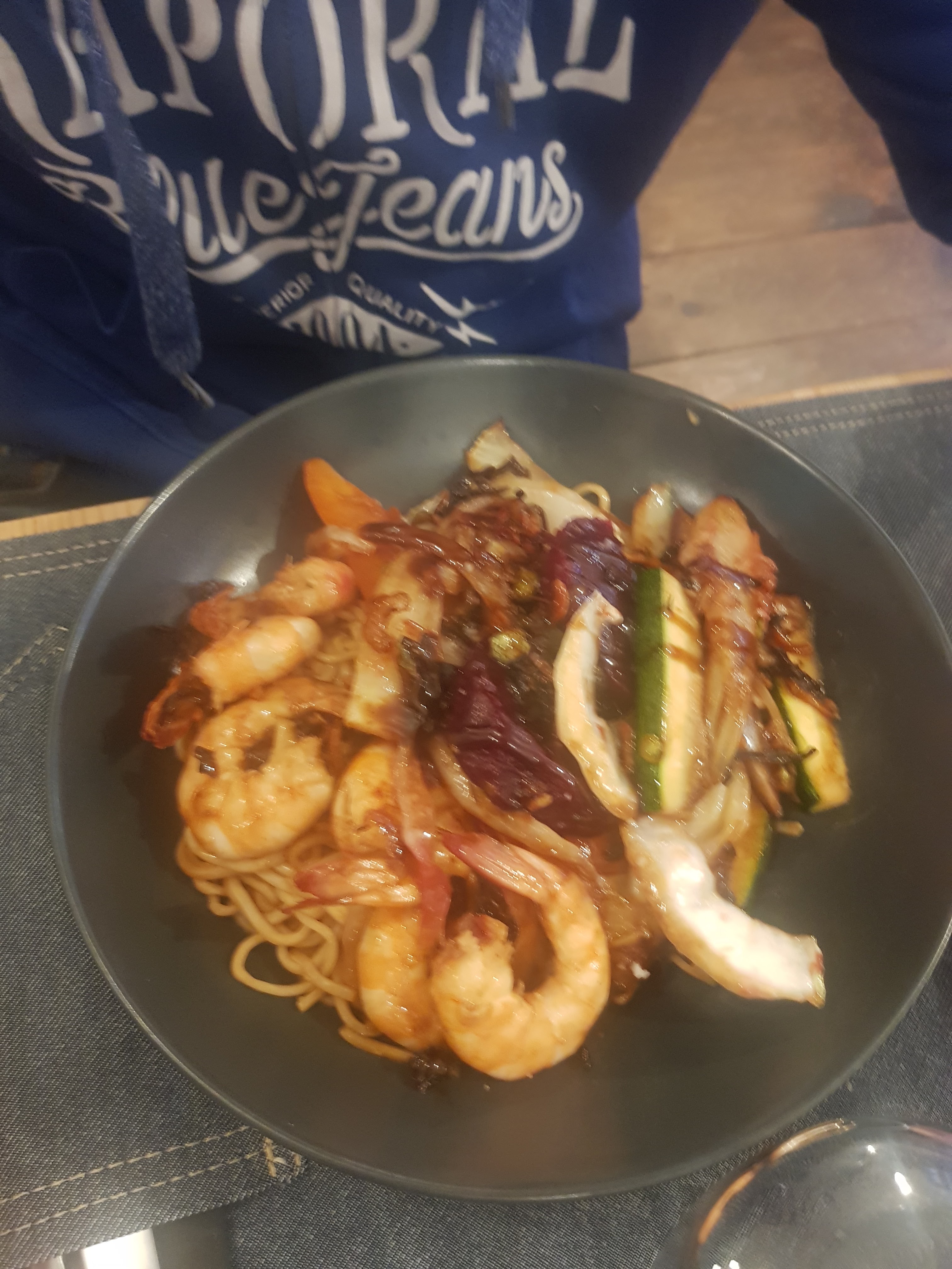 Délicieux, entre Covid et météo nous avons du nous résoudre a commander des plats à emporter, tout est excellents, filet de merlu chorizo, wok de canard ou de crevettes, poelee de gambas, On vous recommande a déguster sur place si vous avez cette chance.