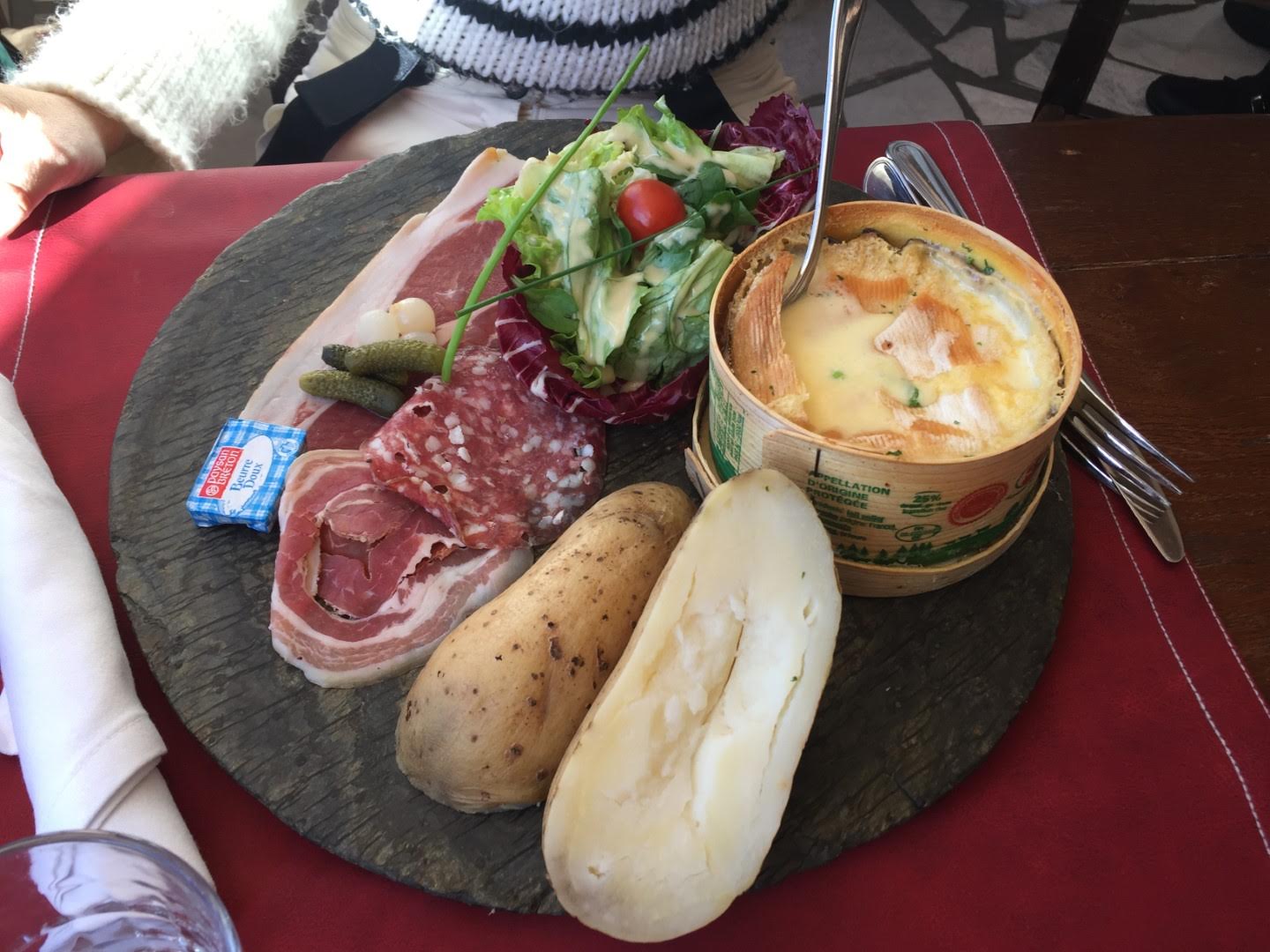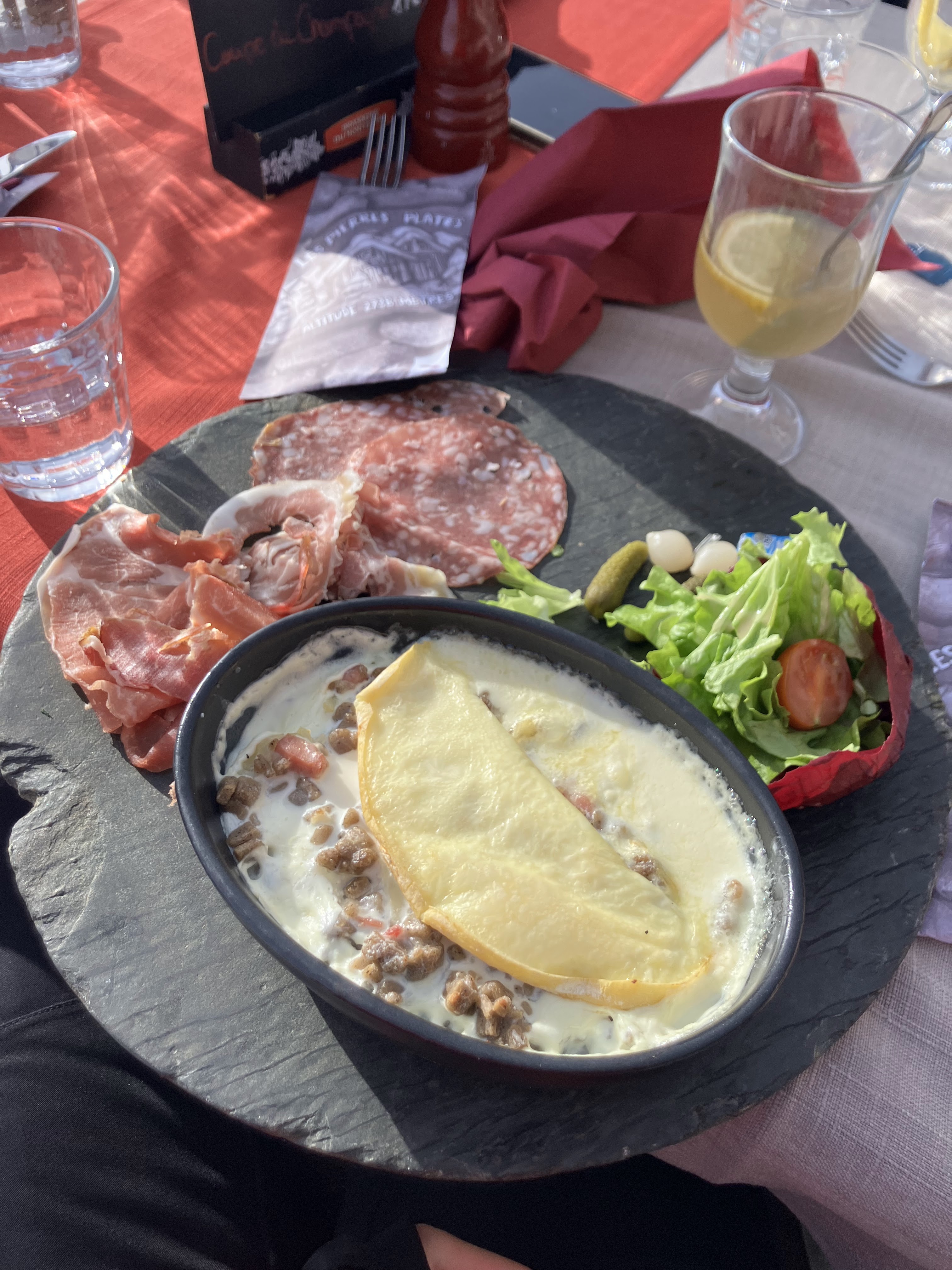 Vue magnifique depuis la terrasse Nous avons pris une salade savoyarde très bien composée prix raisonnable vue l’emplacement, bel endroit.