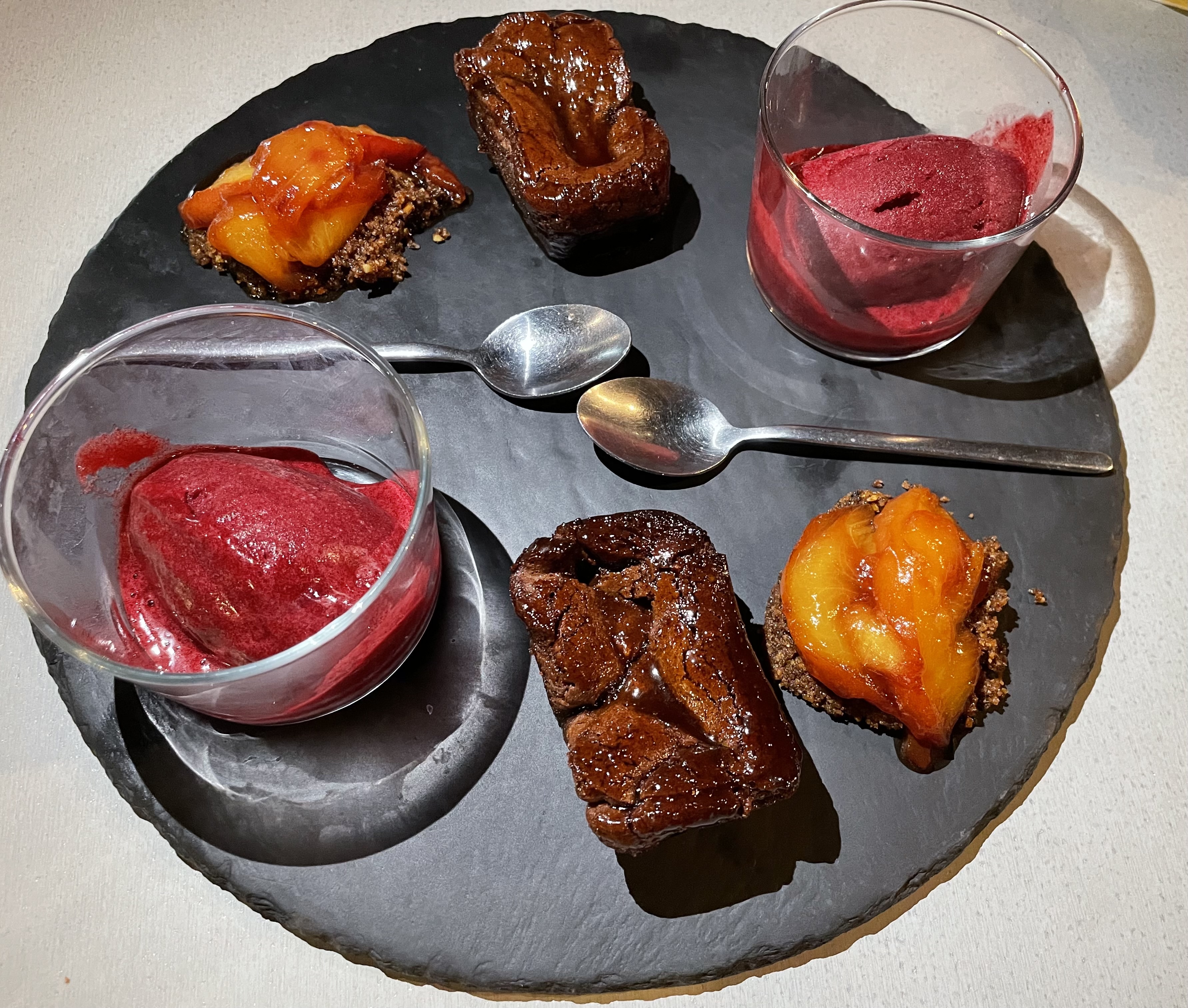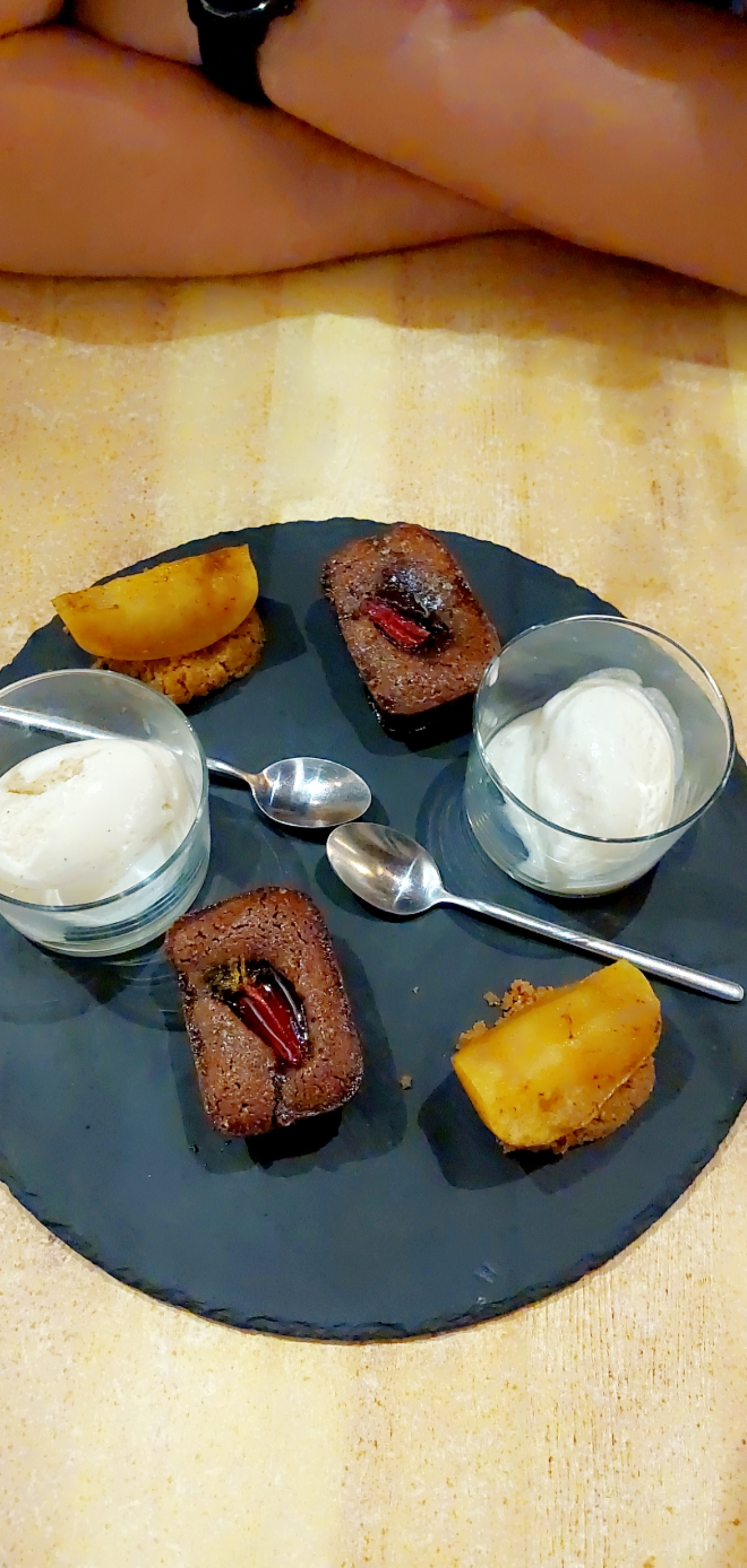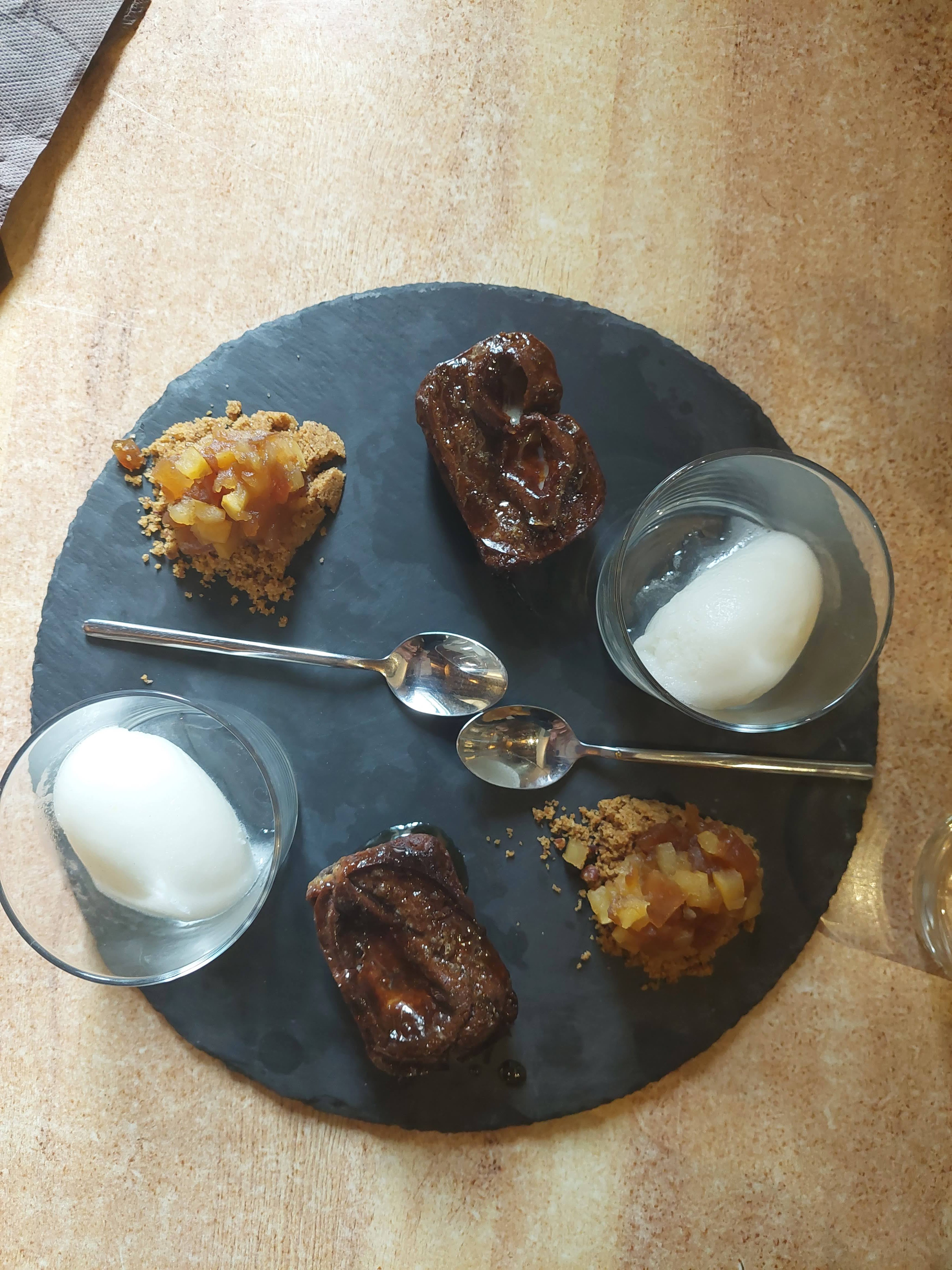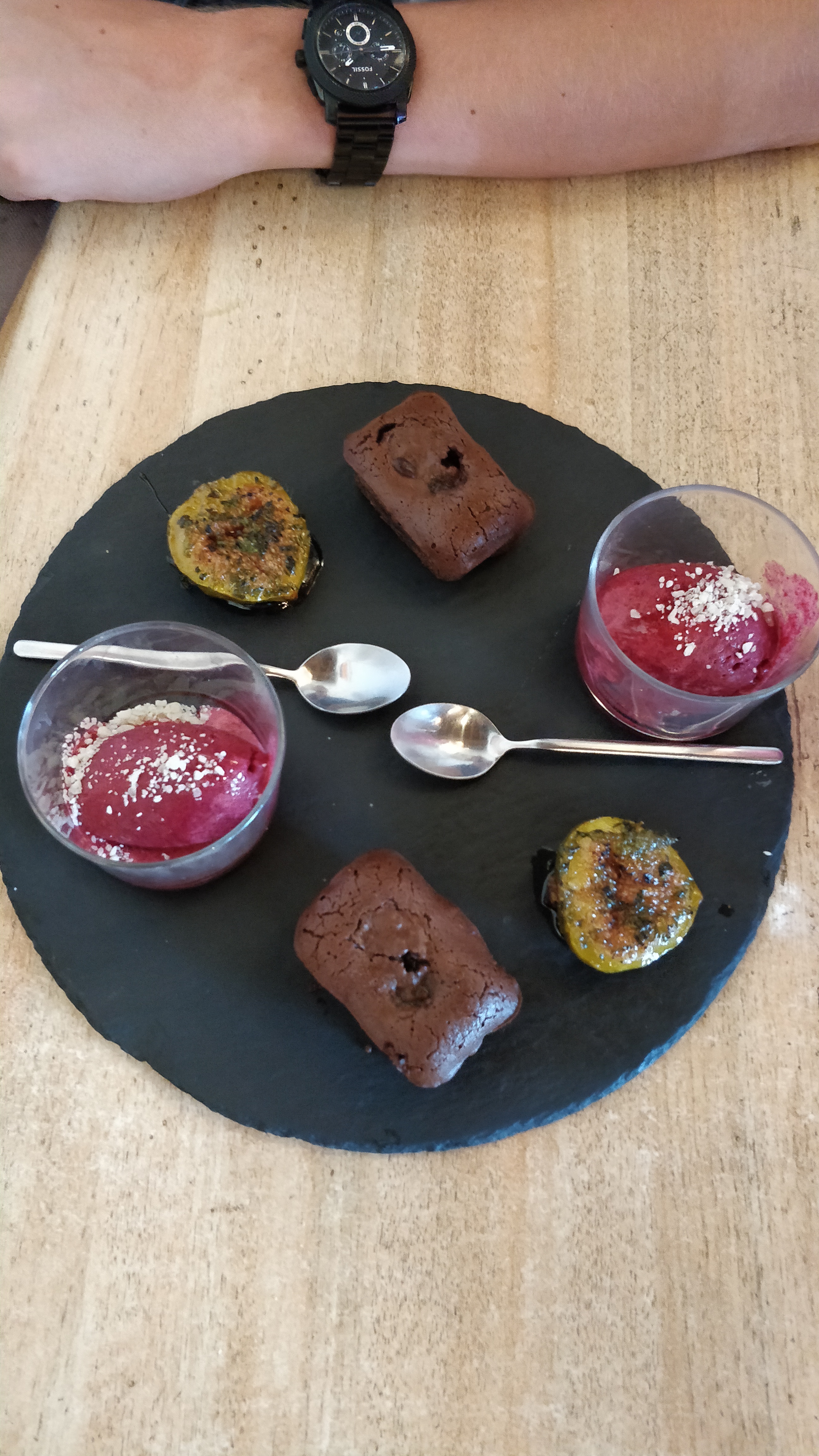 Avec Monsieur steak frites et Monsieur pâtes ketchup nous tentons l'aventure gustative que nous propose très sympathiquement le chef. Une entrée terrine de légumes frais, charcuterie et fromage très appréciée. Un plat avec poisson et viande aux multiples saveurs d'agrumes, fruit asiatique. Les enfants n'en n'ont pas laissé une miette. Le dessert fut l'apothéose, compotée d'abricot à la graisse de noix de coco avec un genre de crumble exquis, un sorbet cassis merveilleusement goûteux et un mi-cuit chocolat fourré de framboises fraîches avec un caramel de piment d'Espelette... Ouf... Les jeunes n'en reviennent toujours pas 🤗. Un très sympathique voyage gustatif à tenter