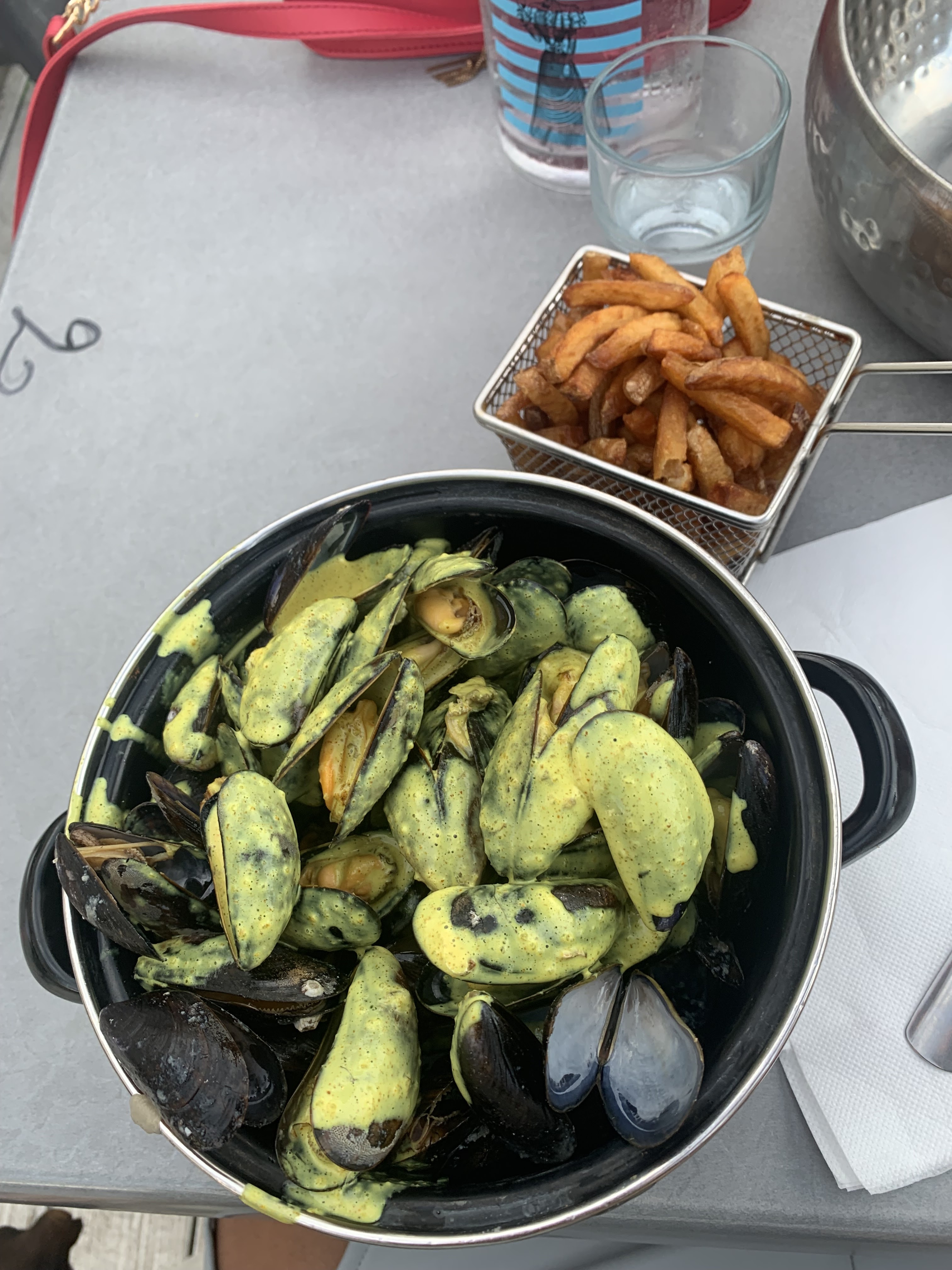 dommage que je ne sois pas du coin, sinon j’y reviendrai très souvent, on voit aux personnels qu’ils aiment leurs travail et le font avec amour et passion, tous souriants agréables drôles…etc TOUS !! il y a un petit chien leur appartenant aussi qui se balade de tables en tables pour les caresses. leurs moules sont excellentes !! ainsi que leurs frites, et ce qui est cool ici c’est qu’ils font des moitiés de marmites si on veut goûter, puis c’est à volonté mais on peut essayer n’importe quel goût de moules, et ça c’est vraiment parfait !!!! les moules au curry sont excellentes, juste c’est du curry épicé 🌶️. les dernières photos que j’ai mise ce sont leurs rinces doigts, au début ils sont secs et il y a un peu d’eau avec un produit dedans pour laver les doigts, on plonge le tissu sec dedans et après on s’en sert, c’est très original !