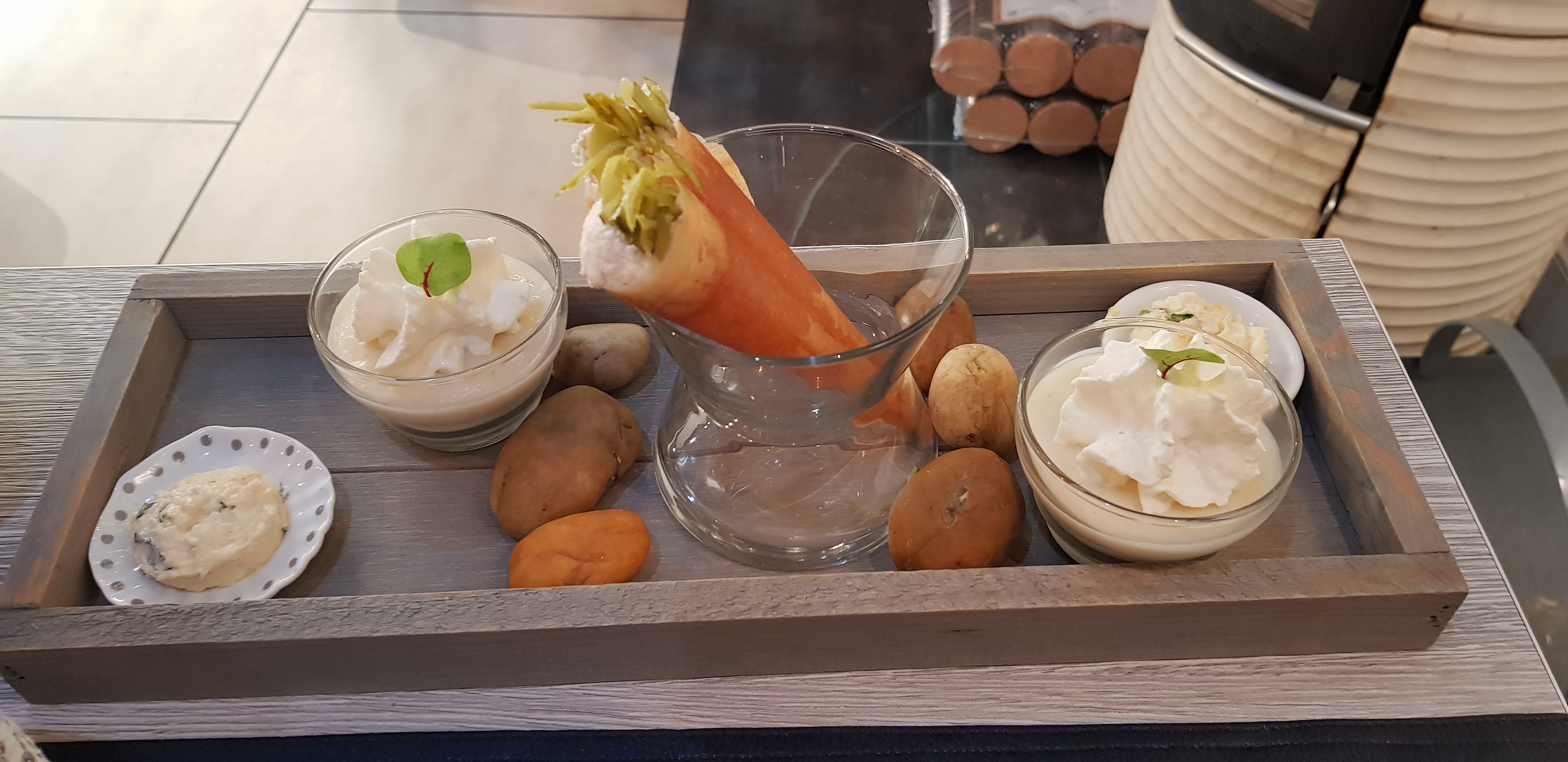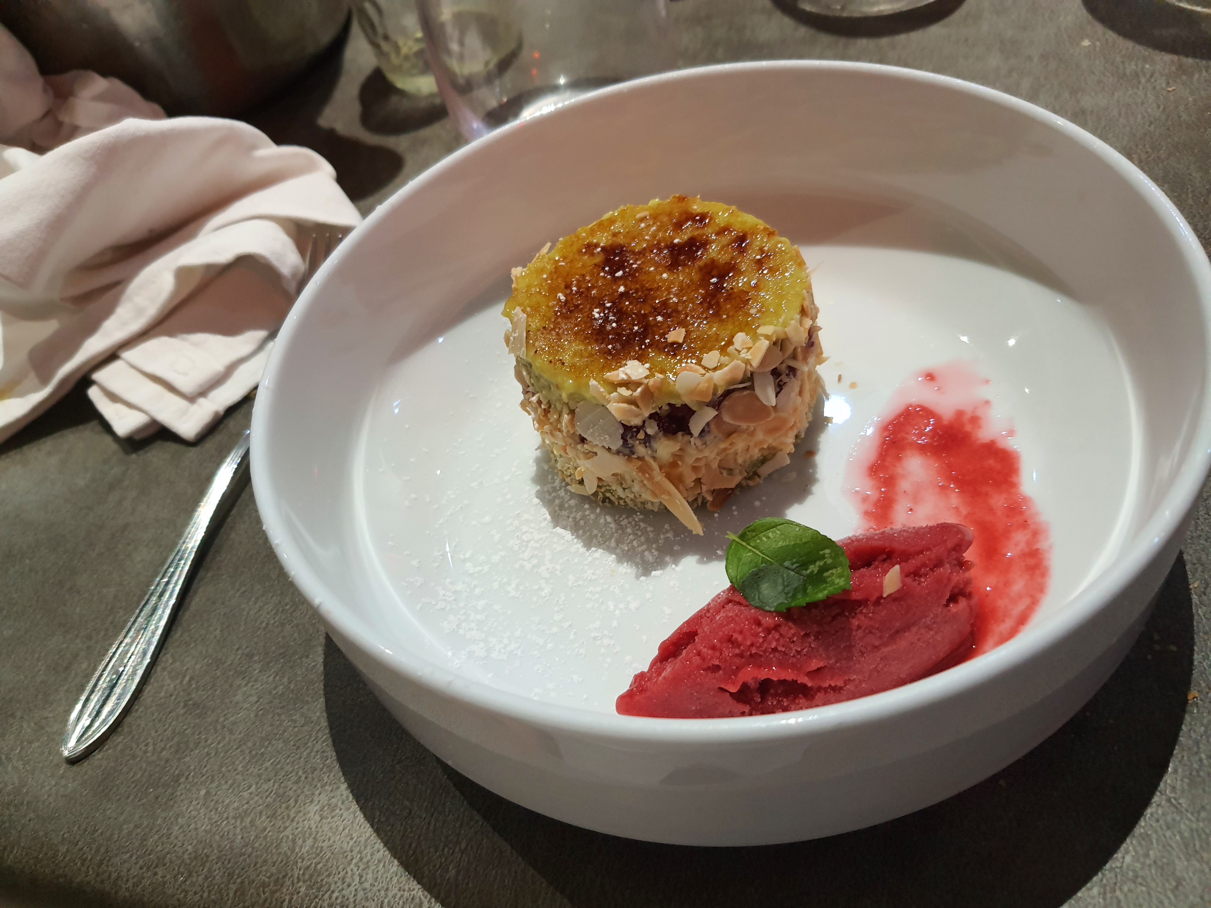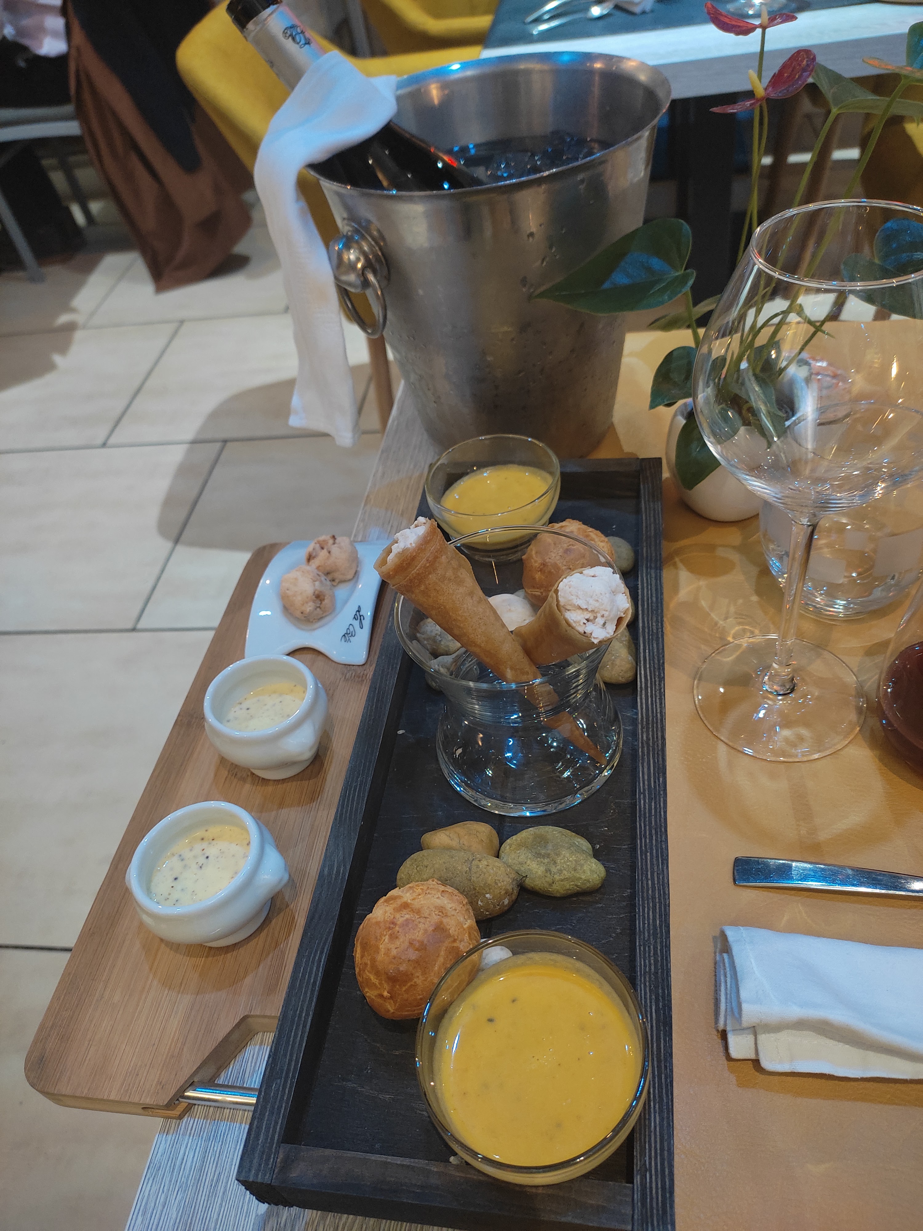 Déçus du repas ce soir … L’humour du serveur suite à ses erreurs parfois limite … Entrée sans saveur et lourde. La deuxième entrée était un peu plus goûteuse. Poisson plutôt bien cuit mais accompagnement moyen. Fromage un petit morceau assez bon mais la composition du second (bleu avec chocolat blanc)nous n’avons pas aimé. Dessert (fraisier)basique est le seul que l’on nous a proposé en remplacement (nous n’aimons pas la cerise ). Bref déception sur ce restaurant qui essaye de se distinguer. Manque clairement de finesse de qualité et de saveur D’autres restaurants à proximité avec un rapport qualité prix plus cohérent