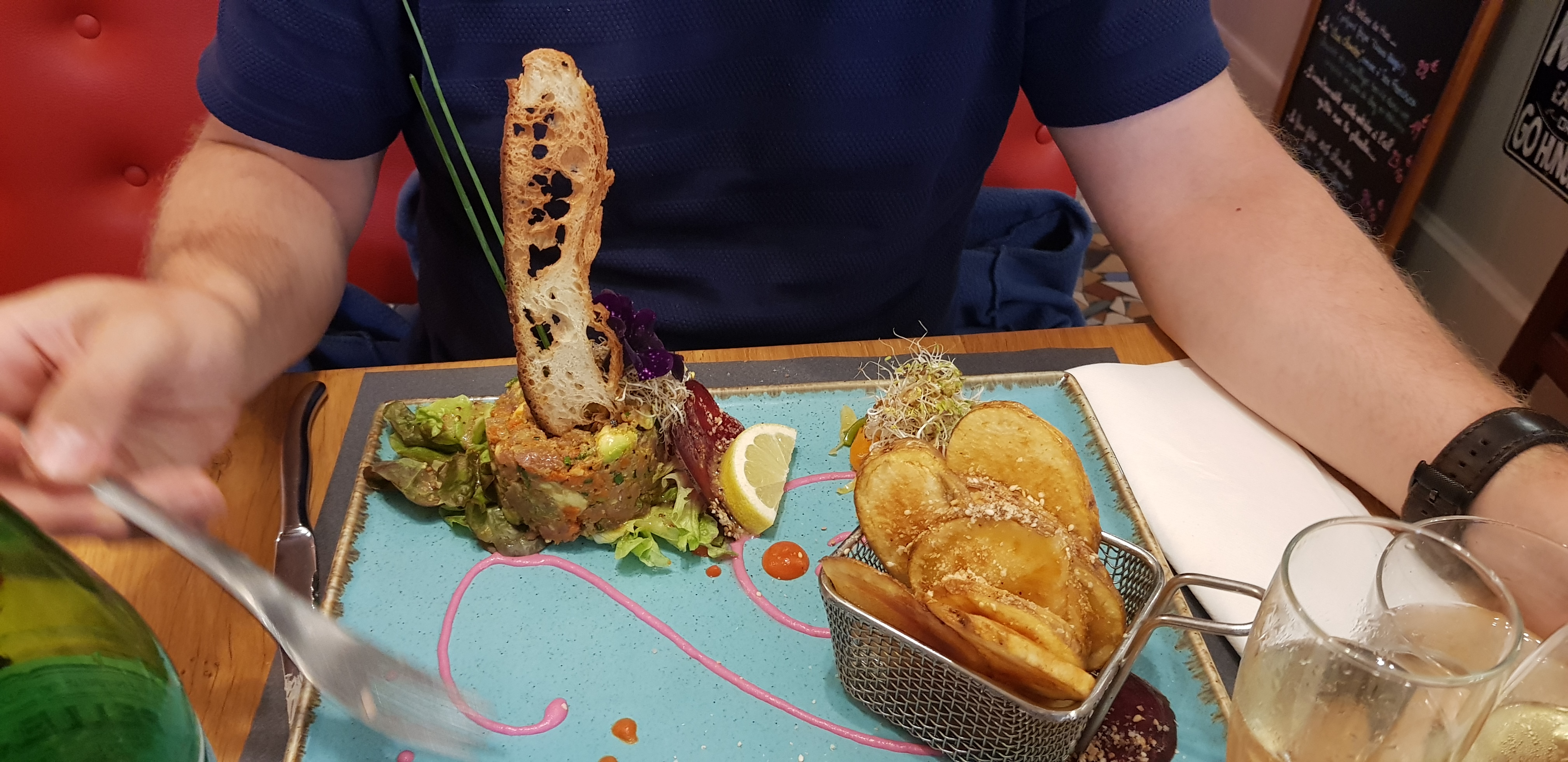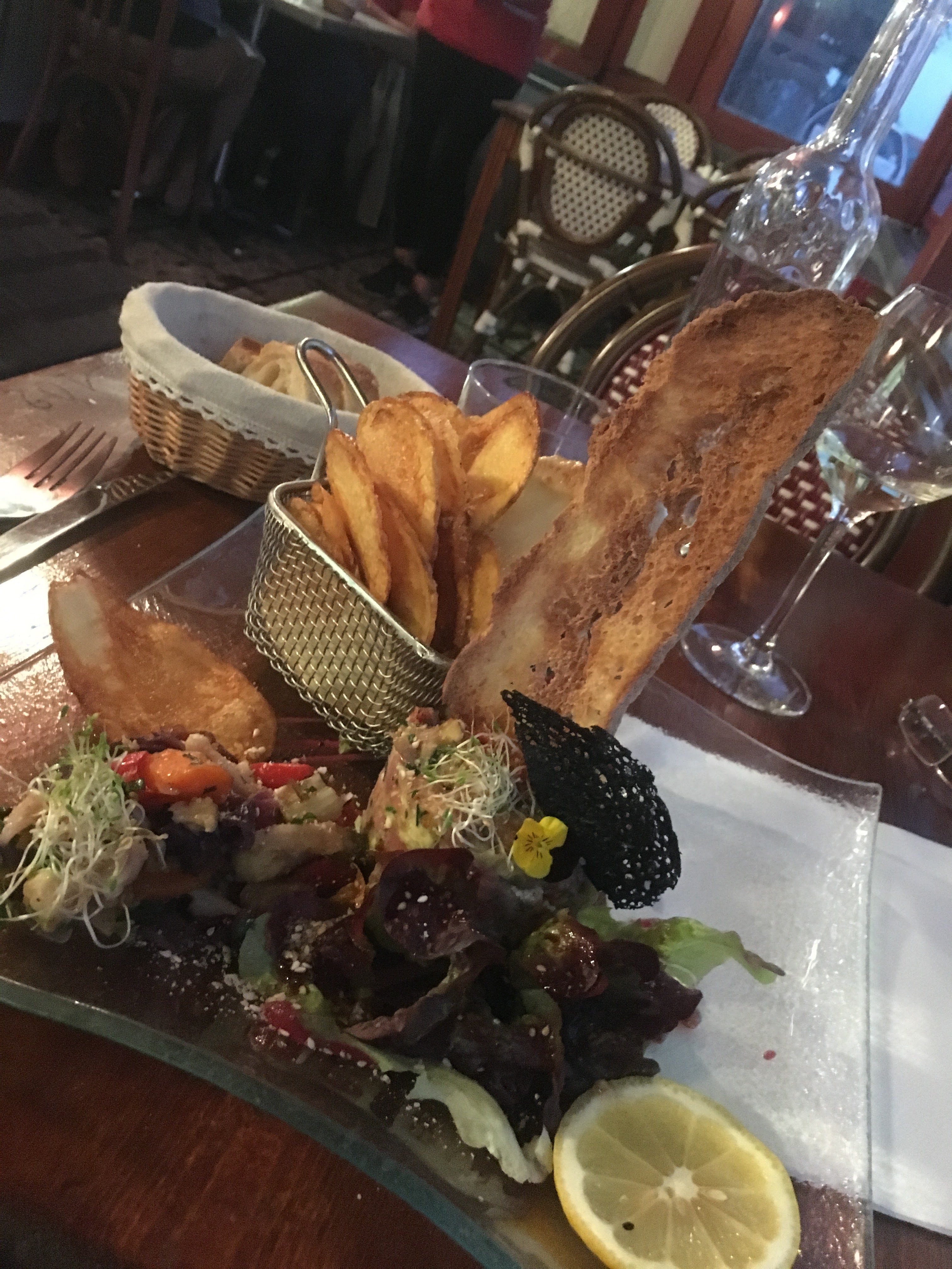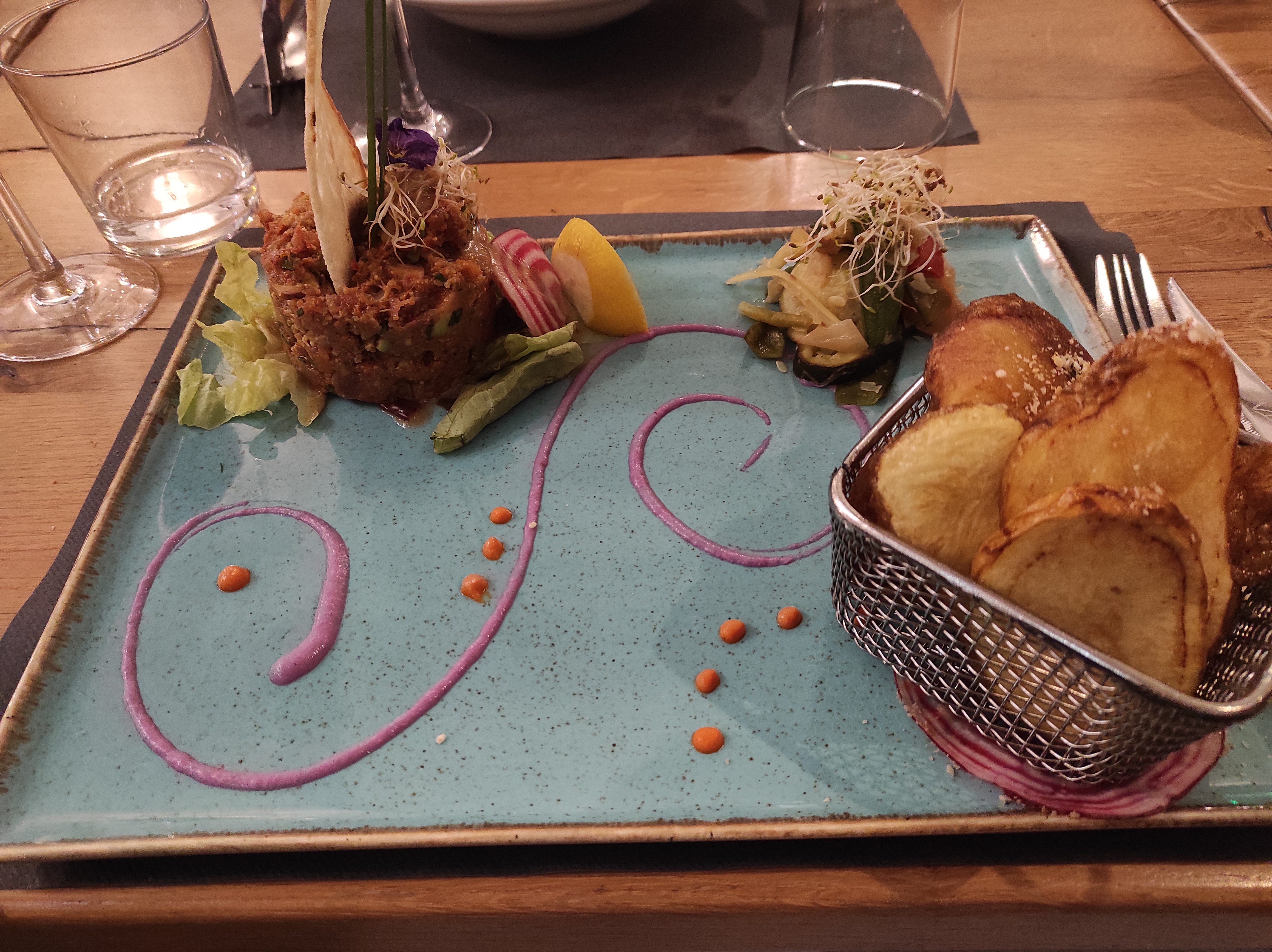 Pas vraiment à la hauteur des avis précédents. On est peut être trop exigeant. Pour commencer une verrine pour deux c'est bizarre, accompagné de croûtons pas terribles. Pommes de terre soufflées molles et goût de friture forte, en accompagnement du tartare. Ce n'est pas un sans faute.