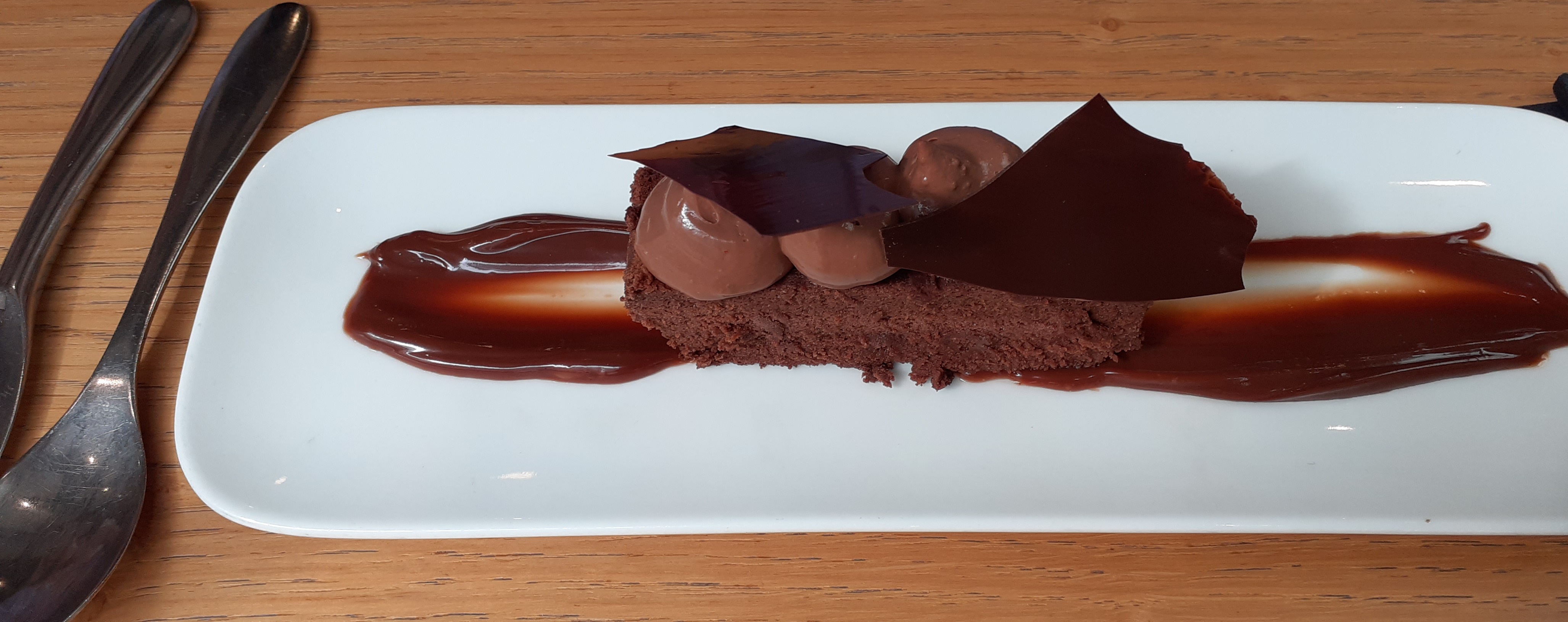 Après des couteaux farcies que j'affectionne, je me suis laissé tenter, par gourmandise, par un dessert....entre 2 feuilles de chocolat, une mousse vanille et plein d'autres choses que je ne saurais identifier, j'ai vécu un moment fort. Mes souvenirs culinaires sont rare et, de mes 50 ans, j'en ai déjà 2 dans ce restaurant.